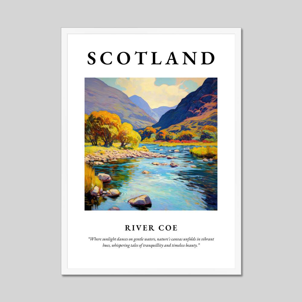 At the top, bold lettering proudly declares “SCOTLAND”, setting the stage for the enchanting painting that captures the essence of River Coe in summer. Rendered in the Impressionism style, this artwork is a symphony of vibrant colours and fluid brushstrokes. The scene depicts sunlight playfully dancing on the gentle waters of the river, as lush greenery and towering mountains frame the tranquil view. Beneath the painting, an evocative quote reads: “Where sunlight dances on gentle waters, nature's canvas unfolds in vibrant hues, whispering tales of tranquillity and timeless beauty,” capturing the essence of this serene landscape.