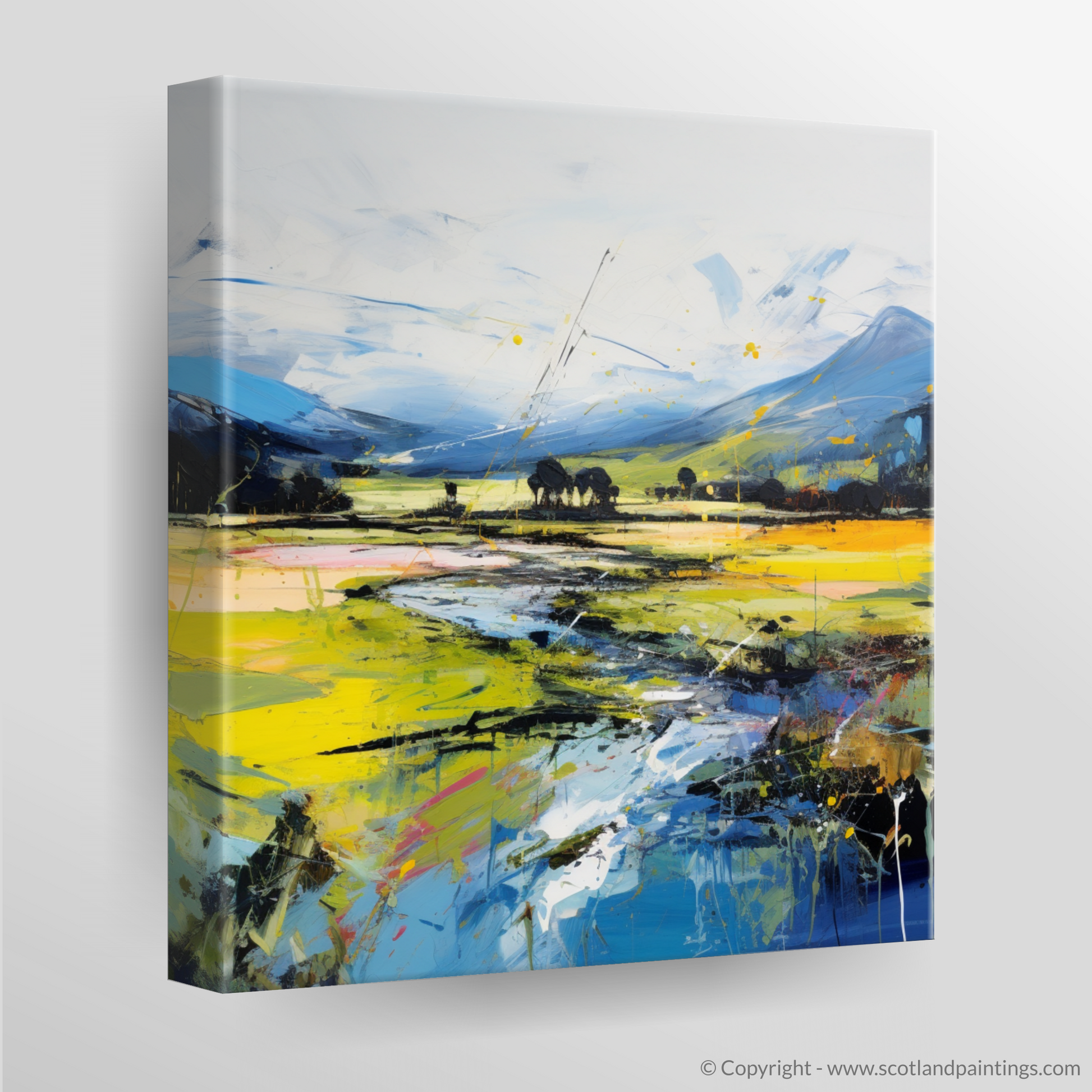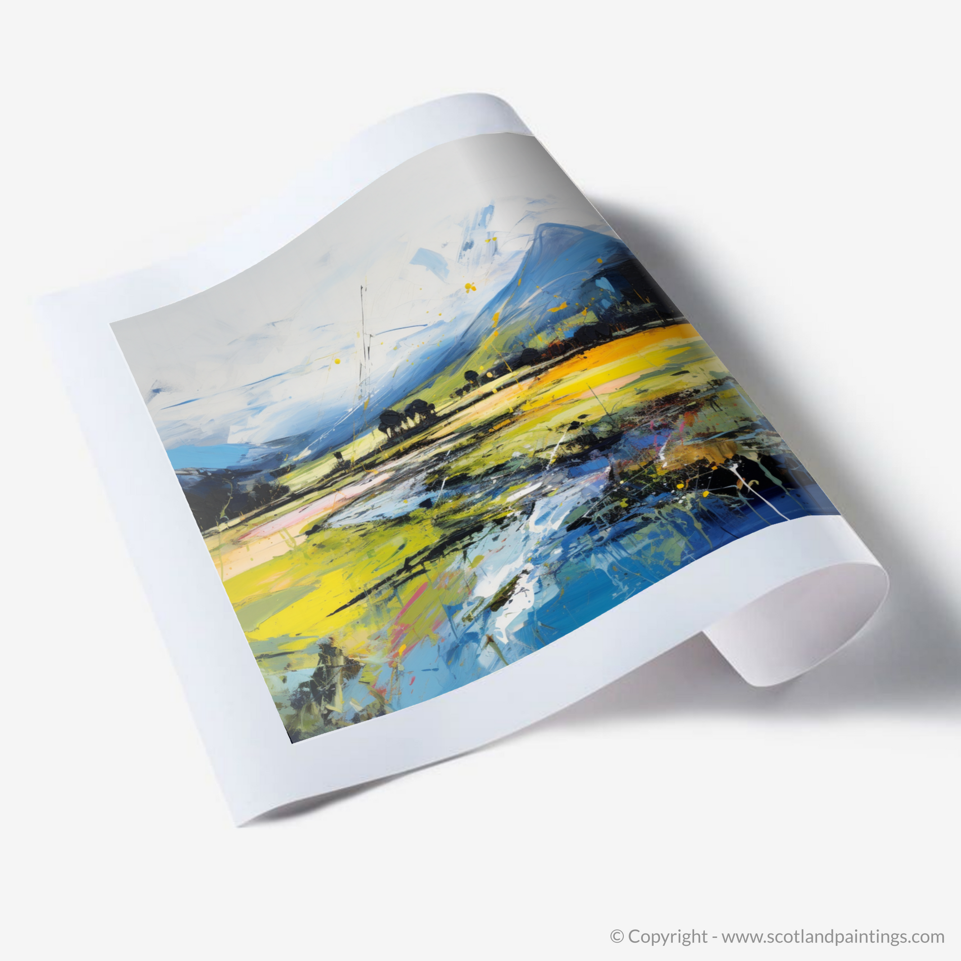 Capturing the essence of Glen Esk, Angus in the throes of summer, this abstract art print is a stunning representation of the raw beauty found in the heart of Scotland during the most vibrant of seasons. The piece showcases a vivid palette, where splashes of electric yellow, cobalt blue, and crisp white dance across the canvas, evoking the sense of warmth and light that bathes the landscape under a summer sky.