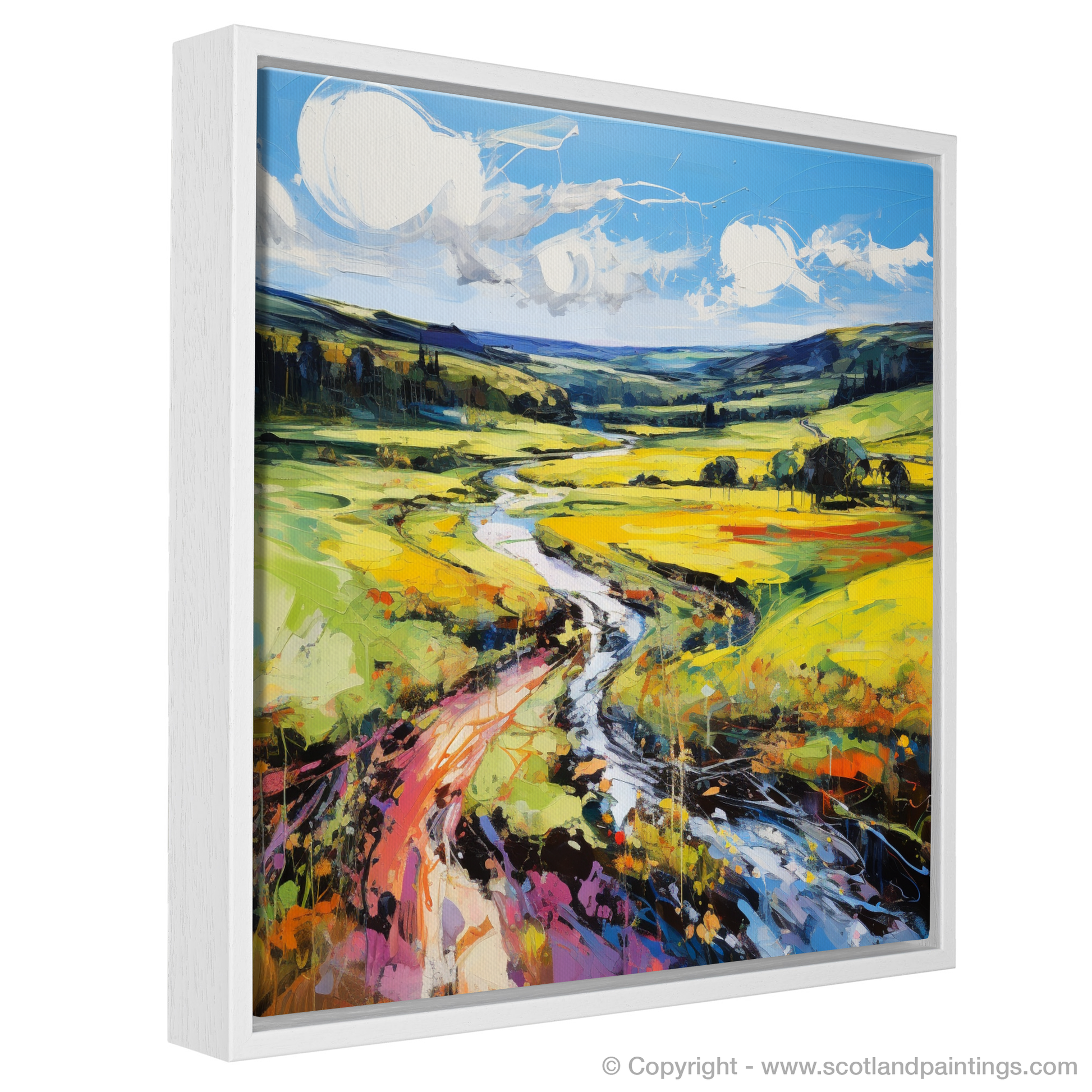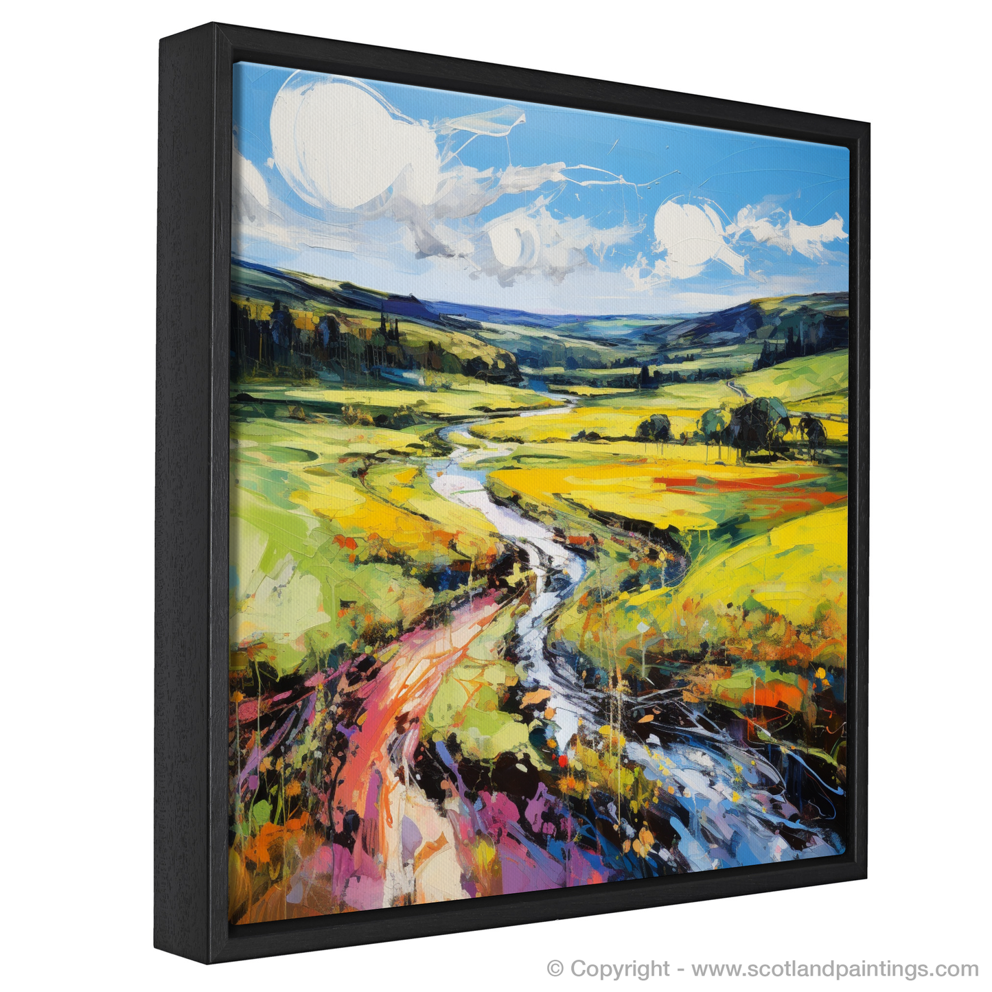 Captured within this vibrant abstract depiction is the essence of Glen Esk, Angus, during the halcyon days of summer. A kaleidoscopic tapestry of colours unfold across the canvas, where the strokes and dabs of the brush invite a sensory journey through Scotland's bucolic landscape. Bold yellows and greens dominate the scenery, reminiscent of the sun-kissed, rolling hills and fields that define the area. A ribbon of blue meanders gently through the valley, portraying the meandering river that breathes life into the glen.