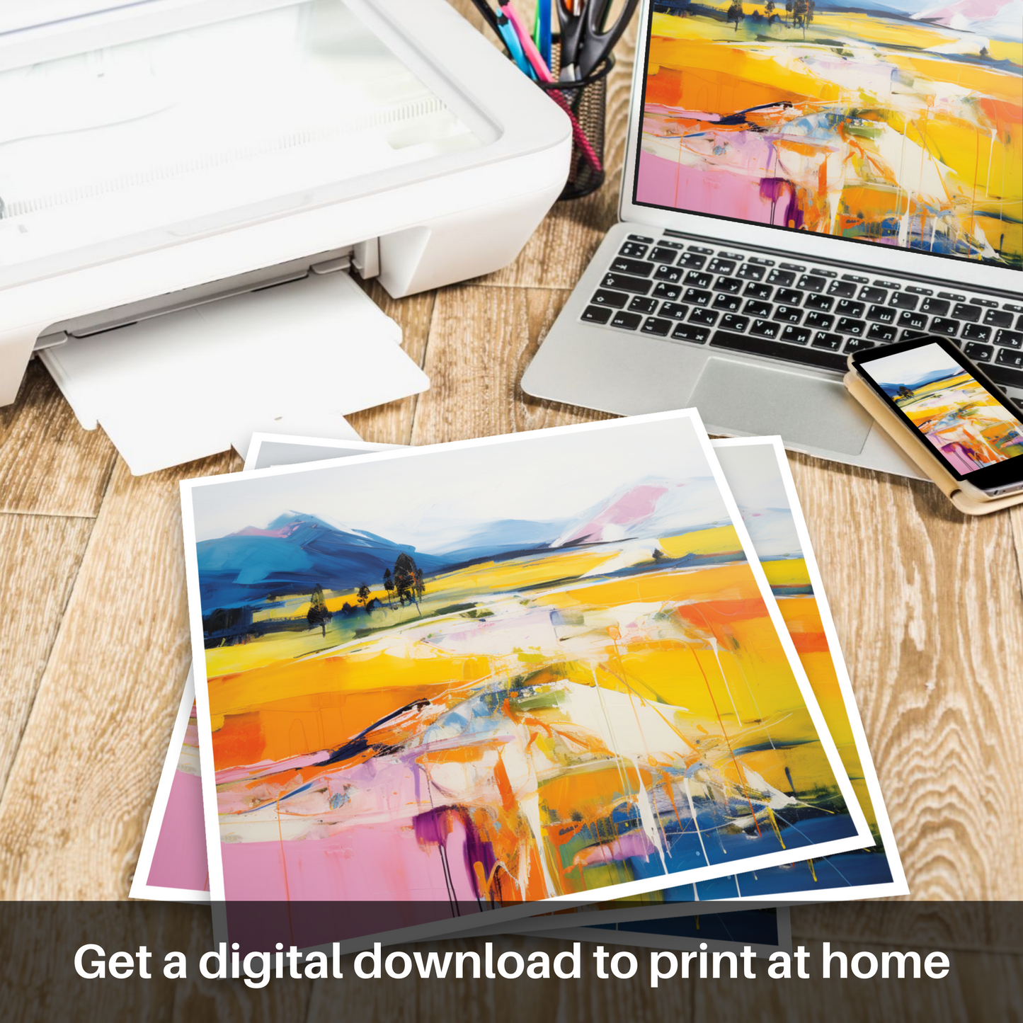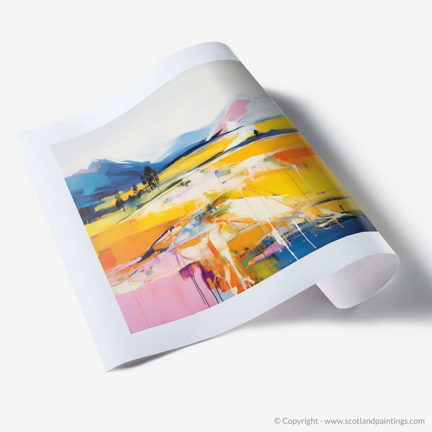 The piece is part of the 'Scotland in Summer' collection, which seeks to encapsulate the vibrant energy and beauty of Scottish landscapes in the most imaginative and emotionally resonant way. This print is sure to become a conversation piece, inviting onlookers to interpret and re-interpret the Scottish highlands' unique allure as captured here in this exuberant composition.