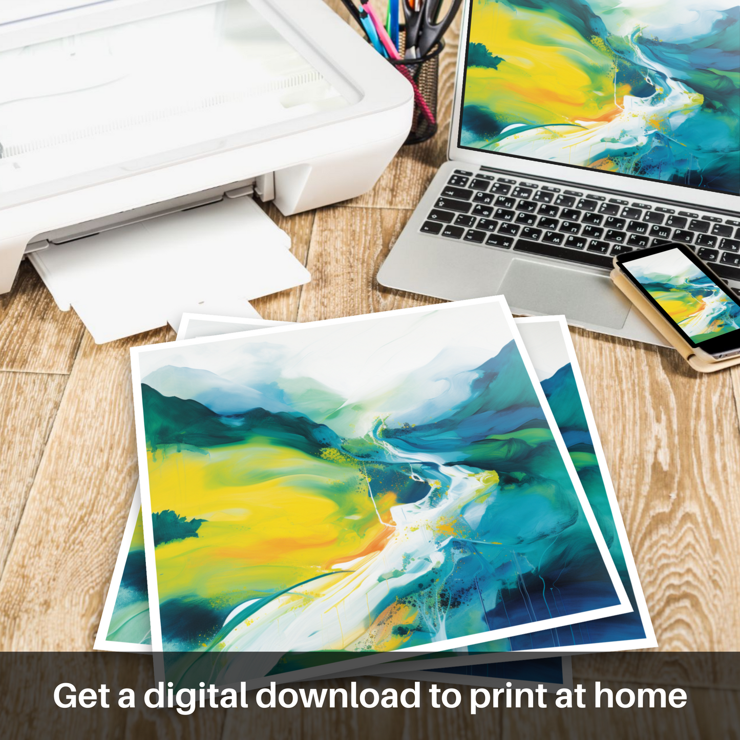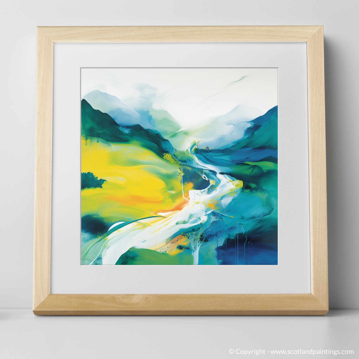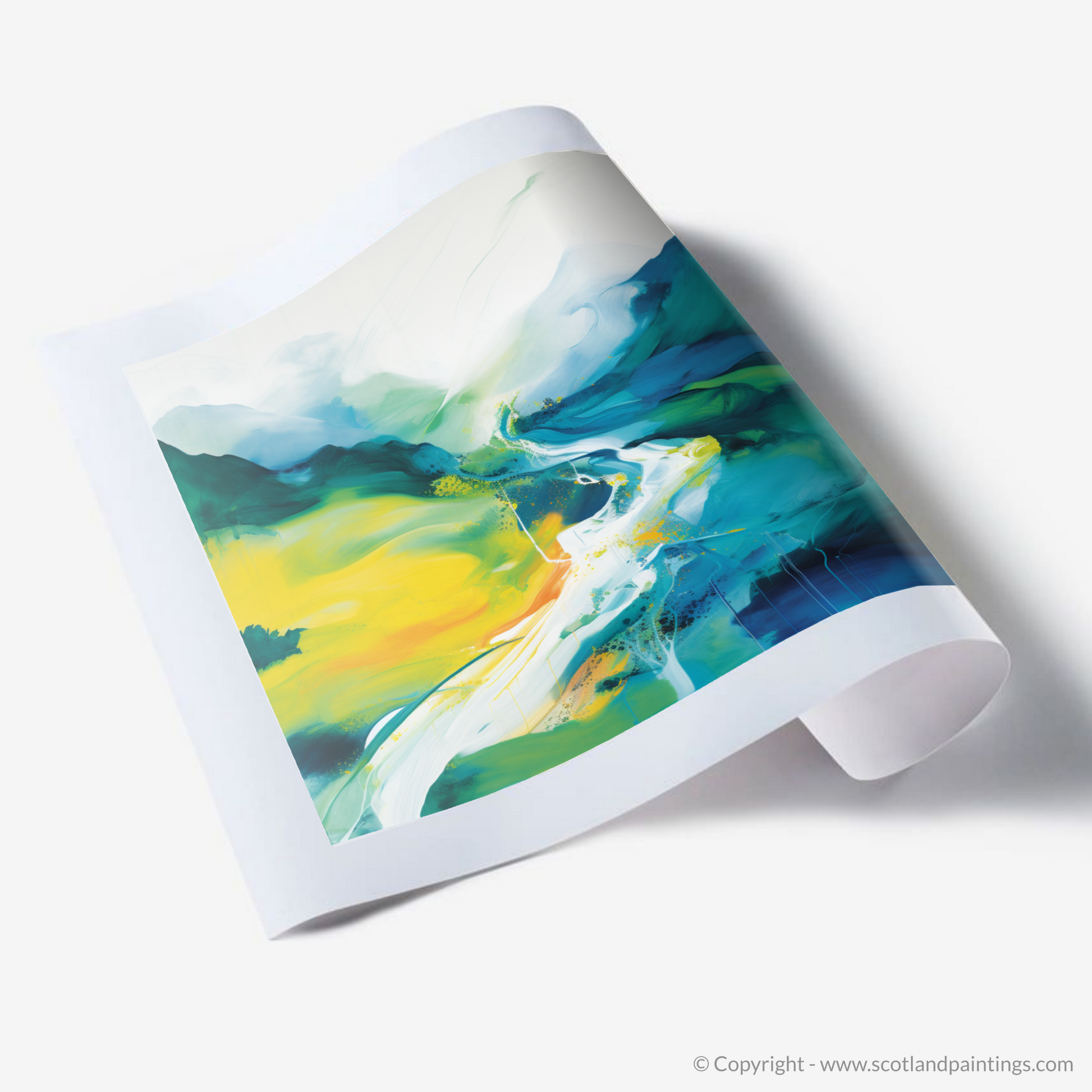 This captivating abstract print is a celebration of the River Garry's dynamic presence in the Scottish Highlands during the vibrant summer season. With an expressive palette of bold yellows, soothing blues, and verdant greens, the artwork conjures images of sunlight dancing on the water's surface and the lush foliage that adorns the riverbanks. The fluid motion of the brush strokes and the subtle blending of colours create an ethereal landscape that invites the viewer to interpret the scene through their own imagination.