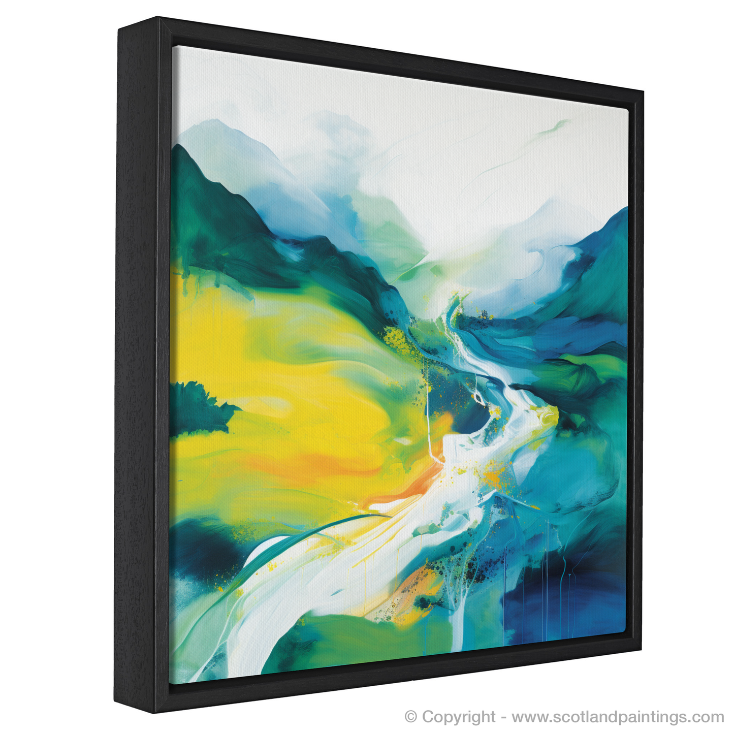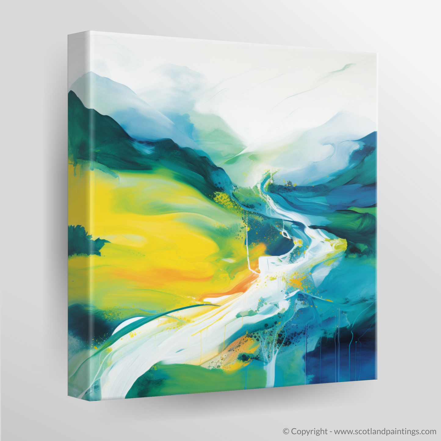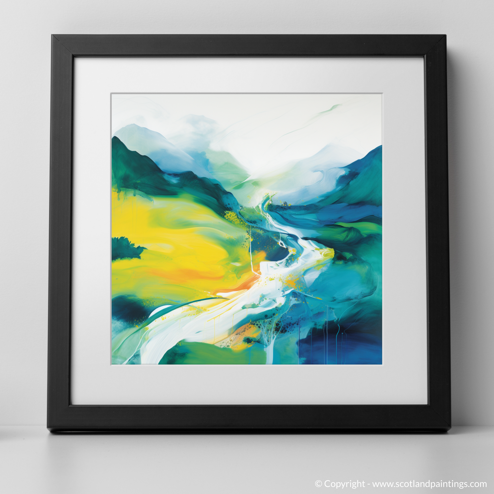 This captivating abstract print is a celebration of the River Garry's dynamic presence in the Scottish Highlands during the vibrant summer season. With an expressive palette of bold yellows, soothing blues, and verdant greens, the artwork conjures images of sunlight dancing on the water's surface and the lush foliage that adorns the riverbanks. The fluid motion of the brush strokes and the subtle blending of colours create an ethereal landscape that invites the viewer to interpret the scene through their own imagination.