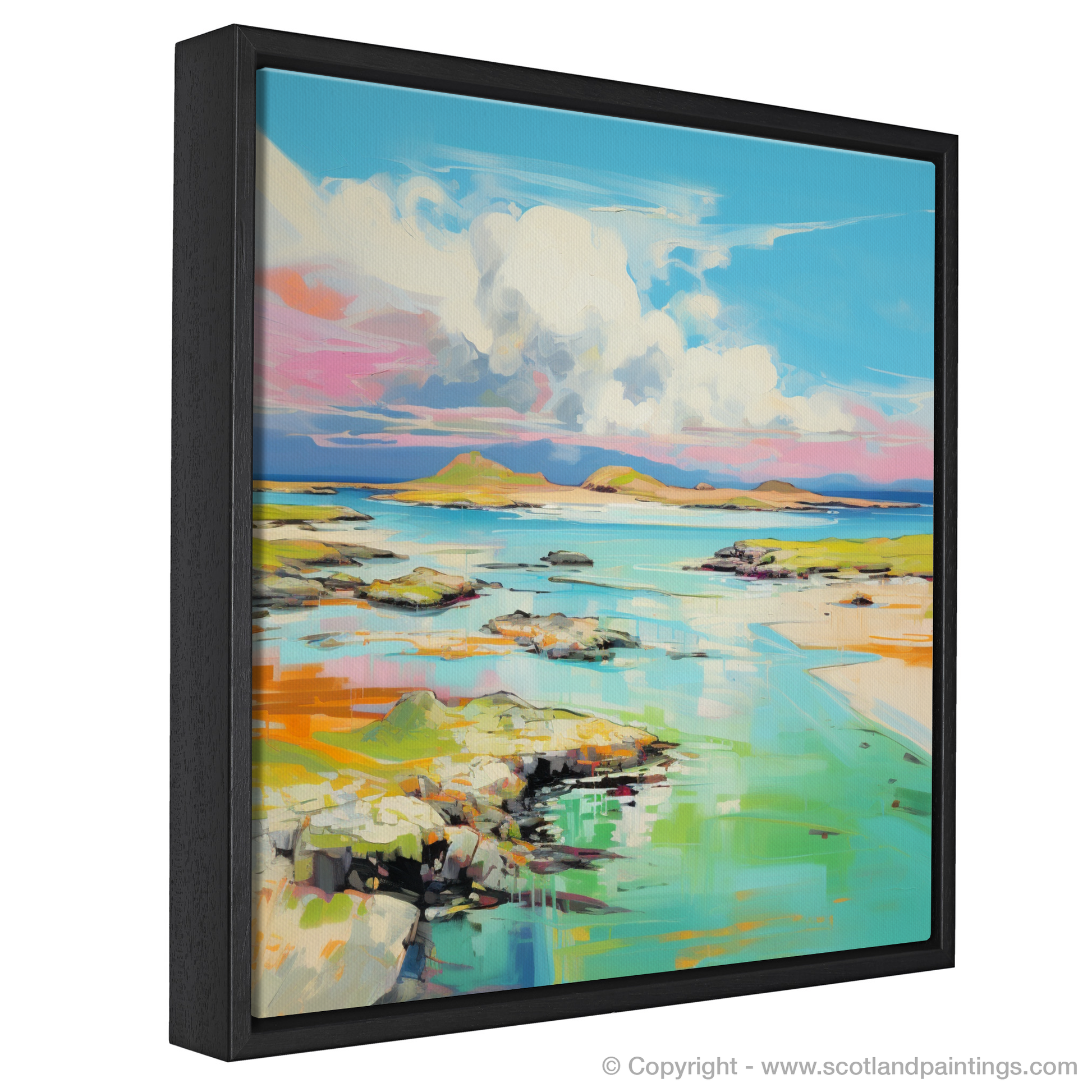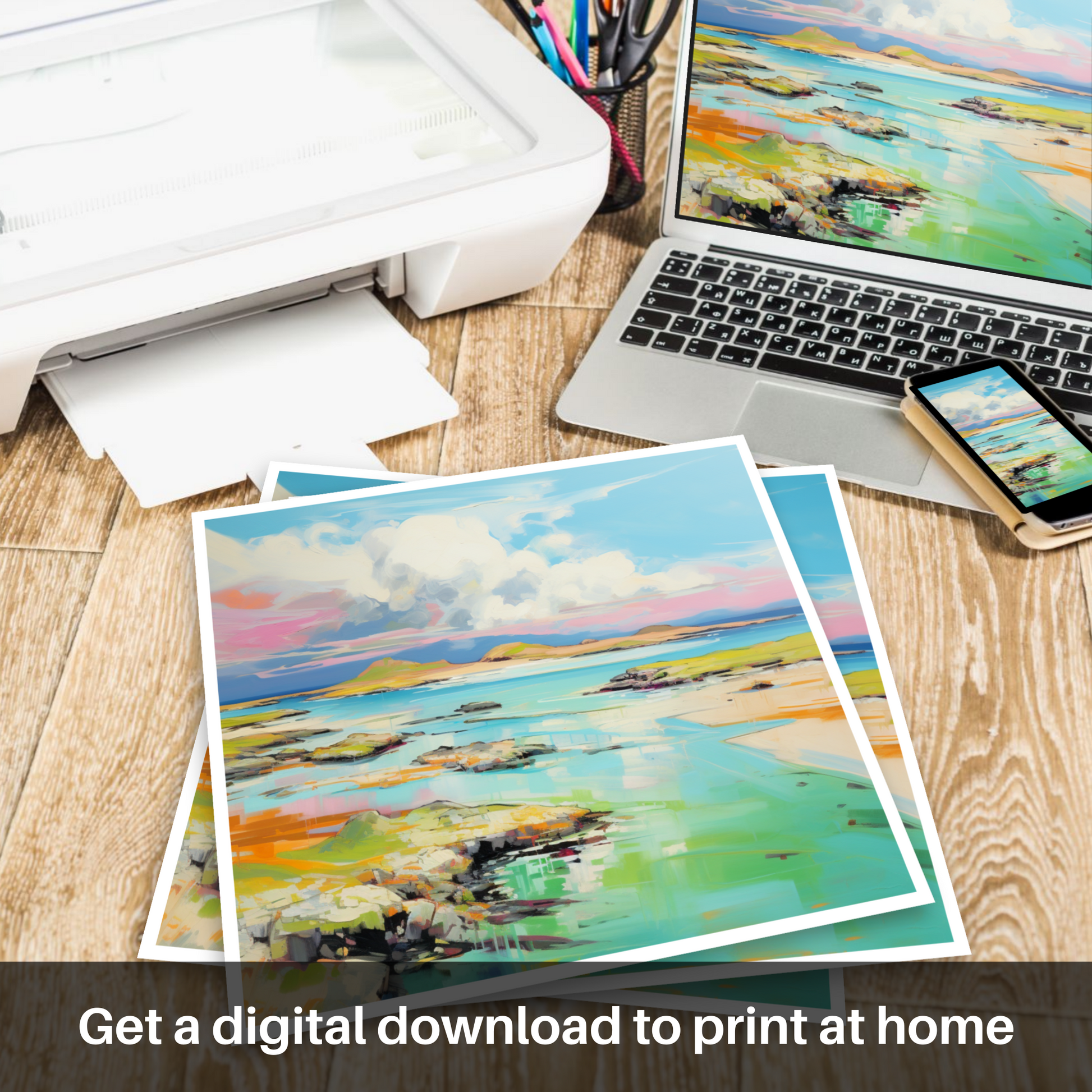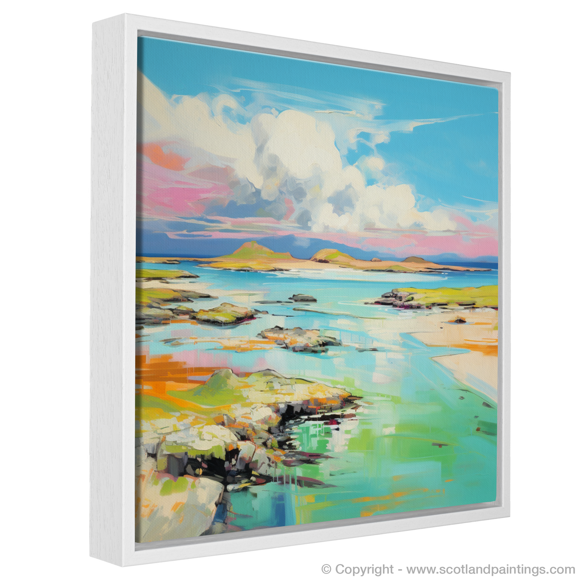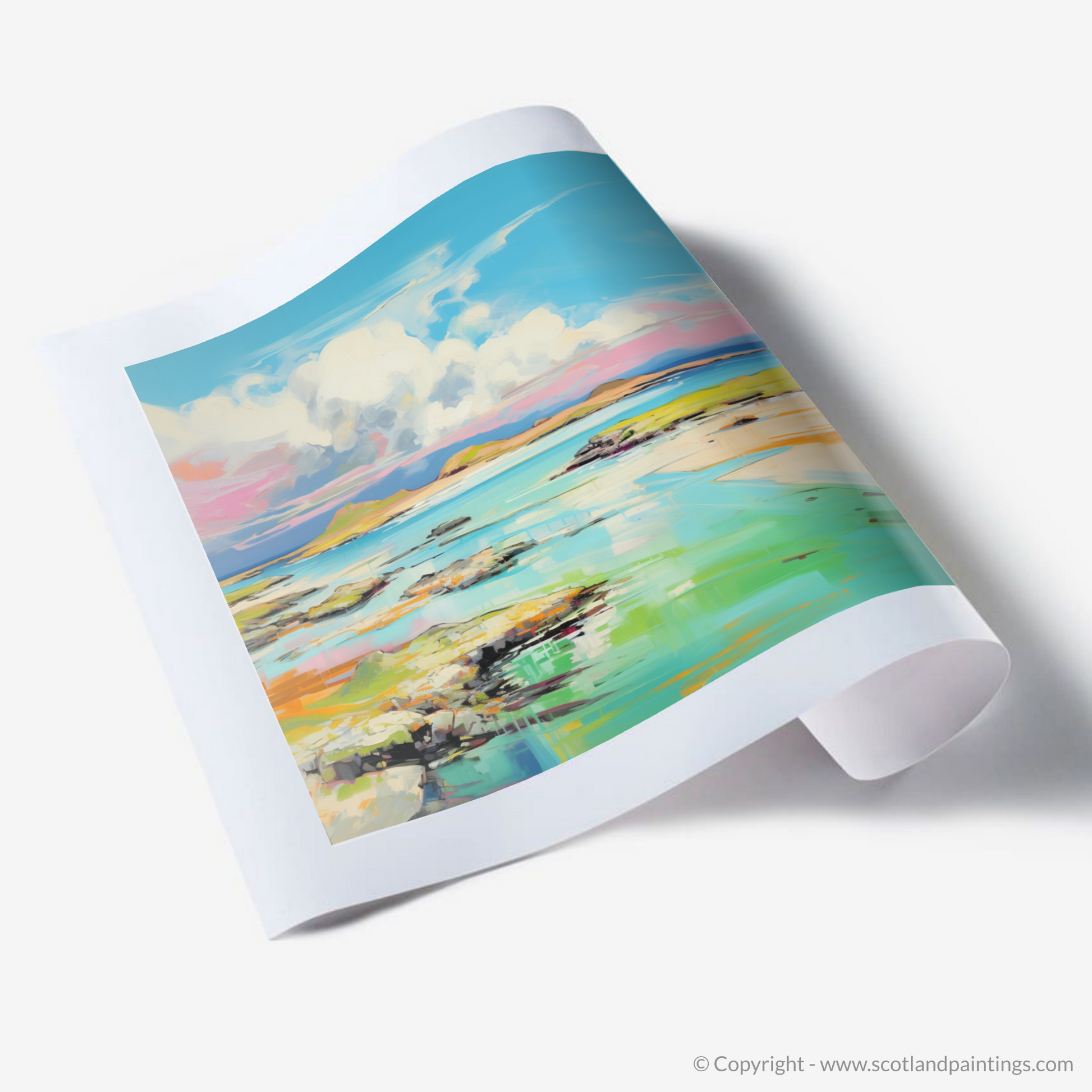 Captivate your senses with the vibrant essence of summer captured in this exquisite print inspired by the breathtaking Isle of Jura in the Inner Hebrides. The artwork showcases a harmonious blend of vivid colours and dynamic brushstrokes that breathe life into the serene landscape. A spectacle of azure skies, embellished with billowing clouds, harmonises with the expanse of glistening aquamarine waters, invoking the peaceful yet invigorating essence of coastal splendour.