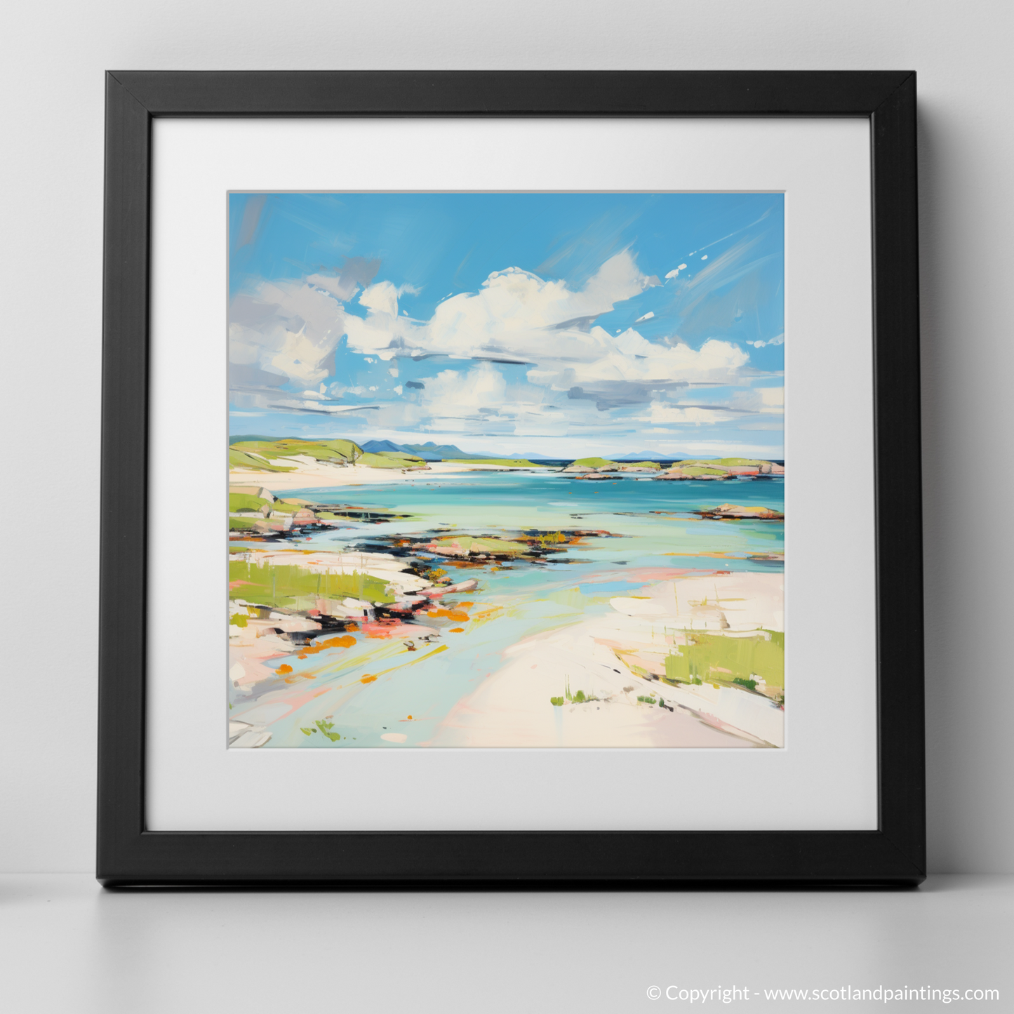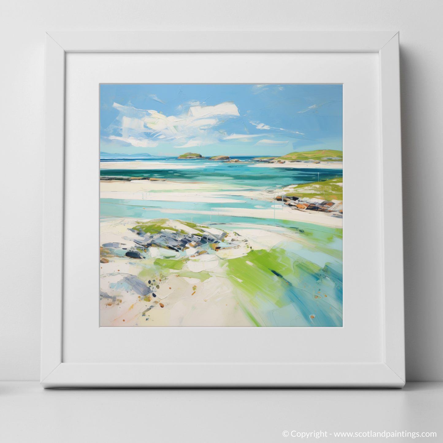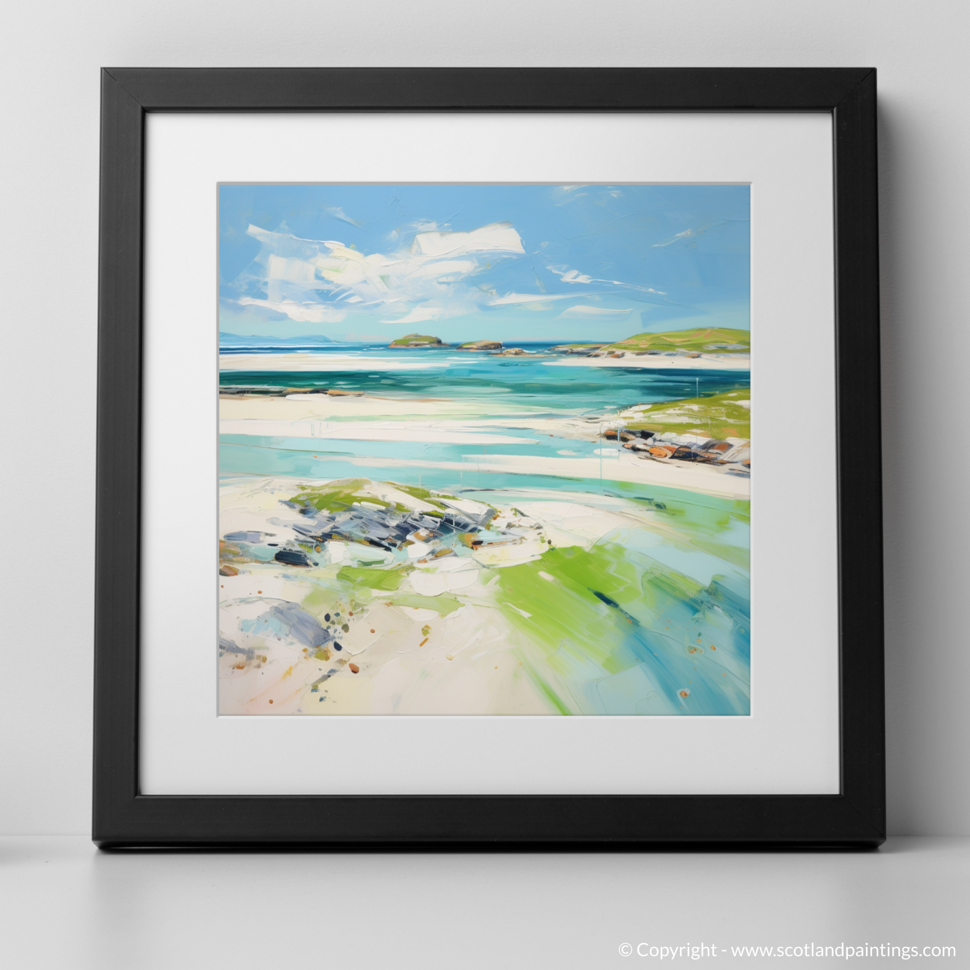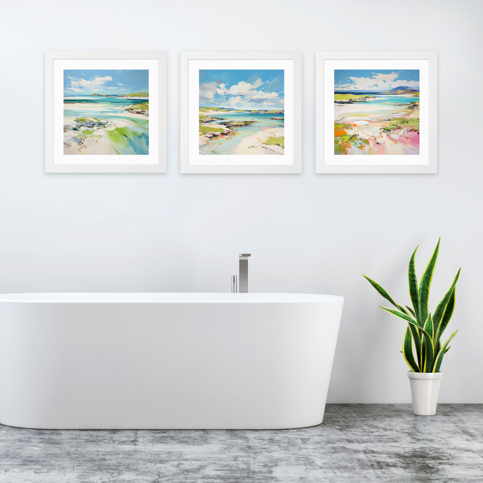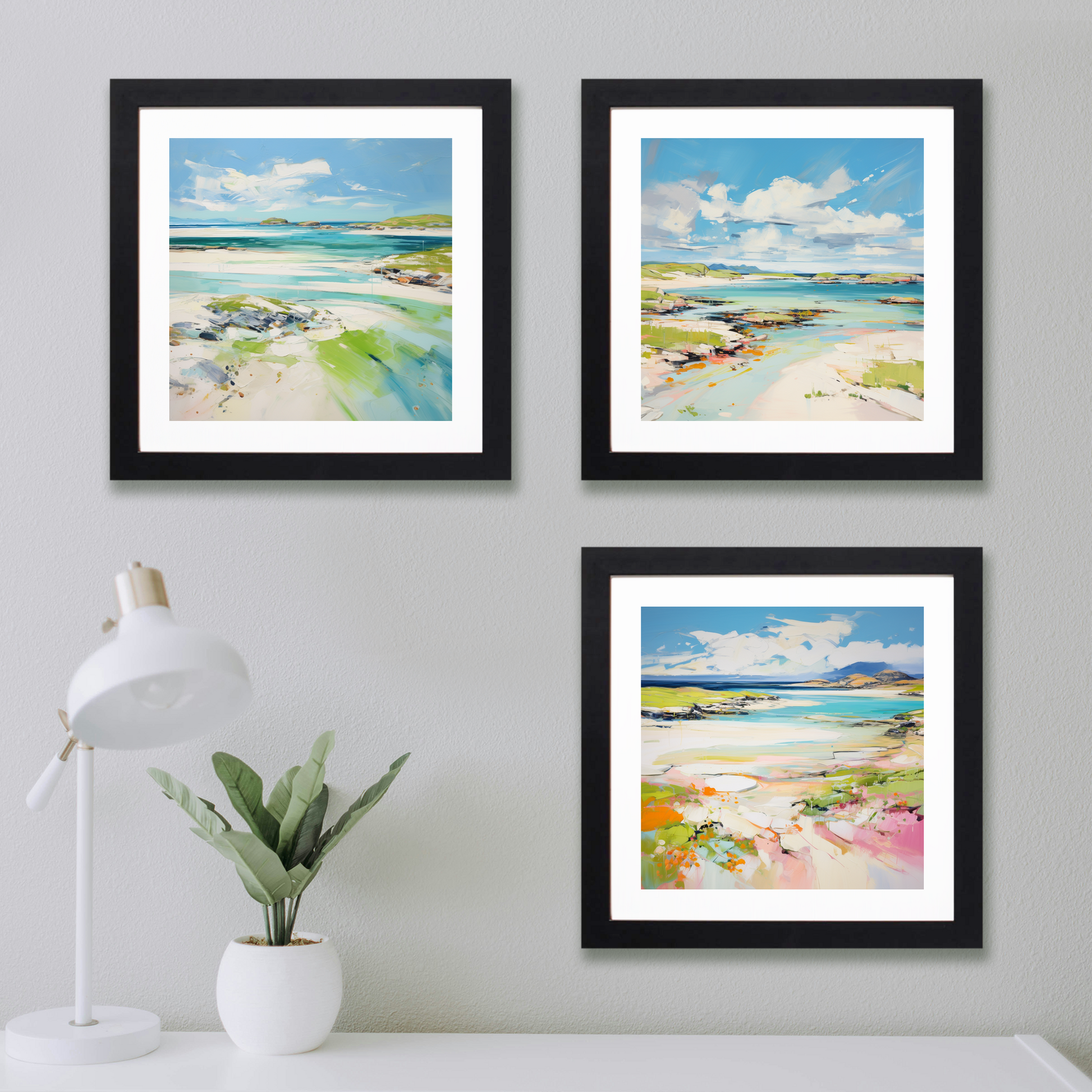 Introducing the captivating set of three framed prints from the Scotland in Summer collection, exclusively available on ScotlandPaintings.com. This exquisite collection captures the enchanting beauty of the Isle of Barra in the Outer Hebrides during the summer months. Each print embodies the serene allure of Scotland's coastal landscapes, featuring a harmonious blend of azure skies, emerald greenery, and the crystalline waters that gently kiss the sandy shores.