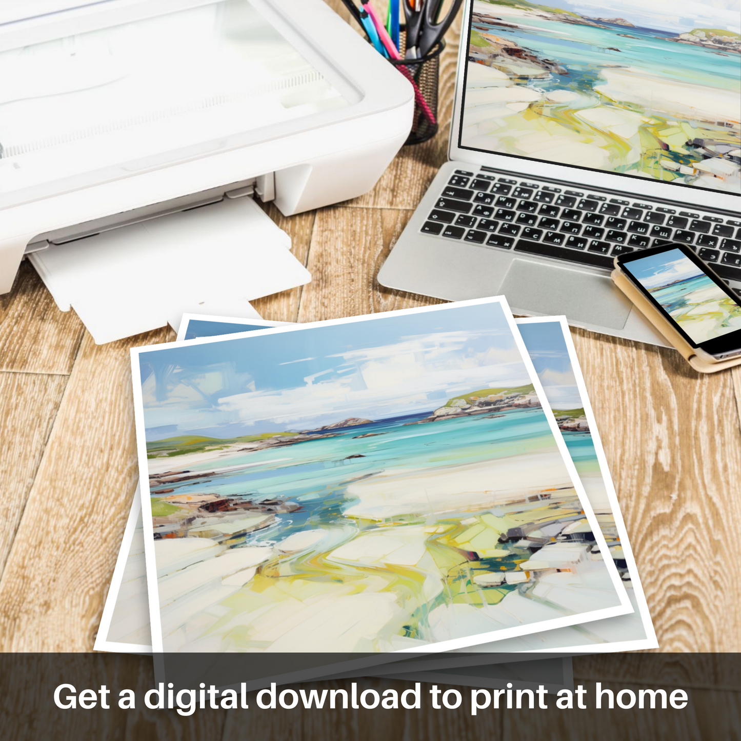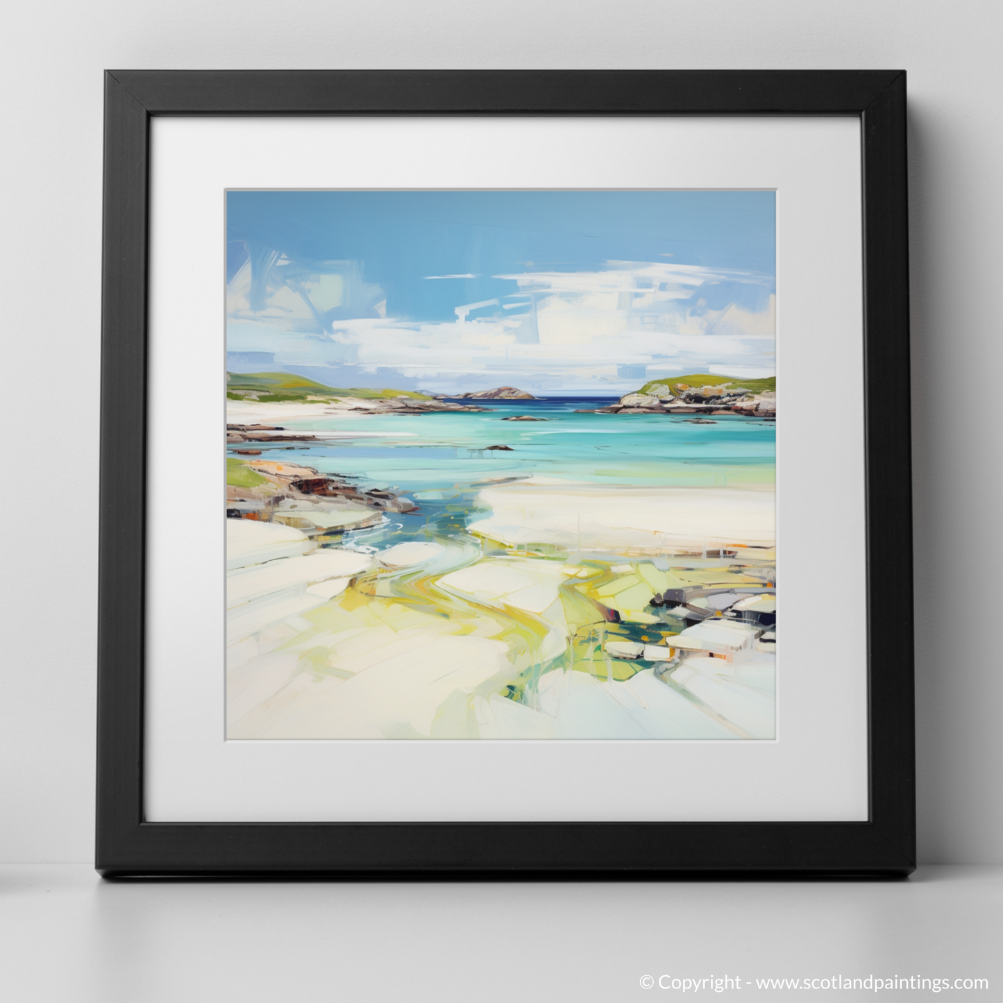 This captivating piece offers a glimpse into the serene beauty of the Isle of Barra, one of the scenic gems of the Outer Hebrides, embraced by the warmth of summer. Evoking the unique atmosphere of this enchanting island, the artwork showcases a harmonious blend of vivid colours and fluid brushstrokes that bring the Scottish landscape to life.