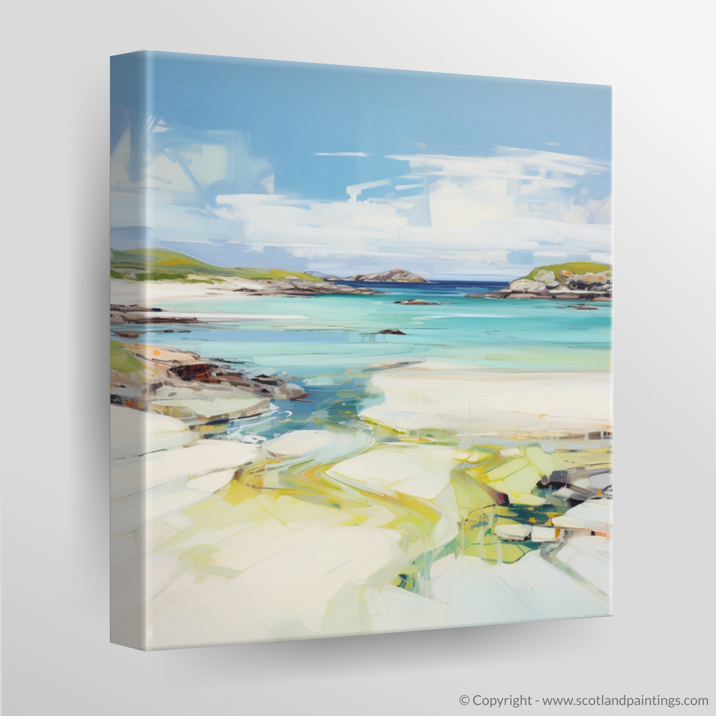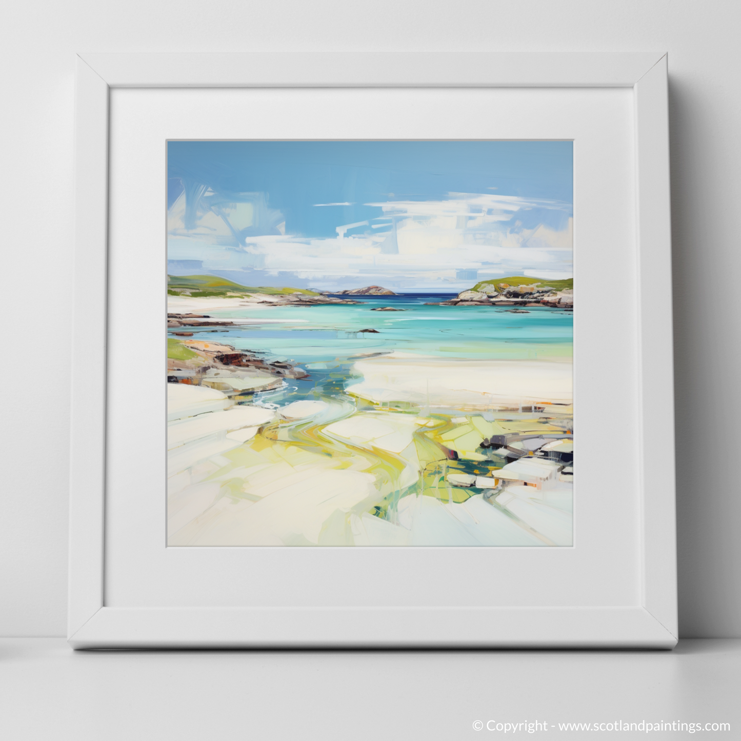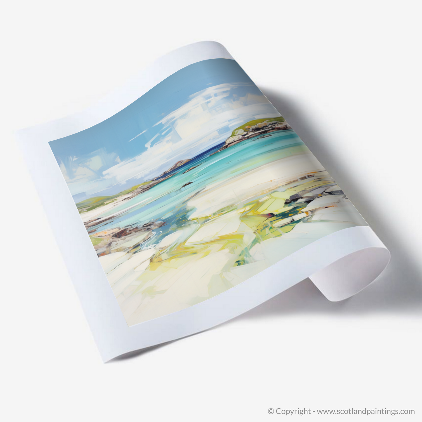 Above, the sky unfolds in a spectacle of light and movement, where broad, gestural strokes in varying shades of blue mingle with the streaks of white, reflecting the dynamic yet peaceful Scottish summer skies. This artwork seamlessly blends the modernist style with the timeless allure of the Isle of Barra, making it a sublime addition to any collection that celebrates the natural beauty of Scotland in its most vibrant season.