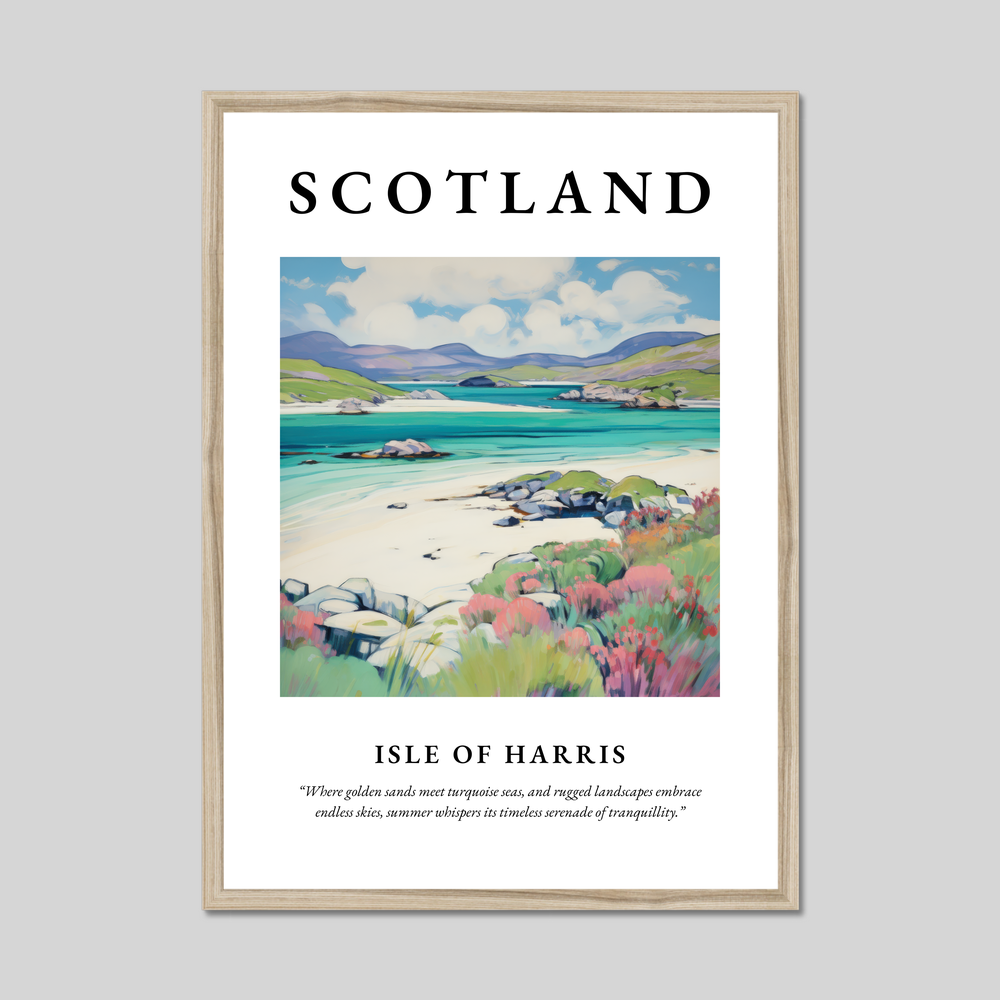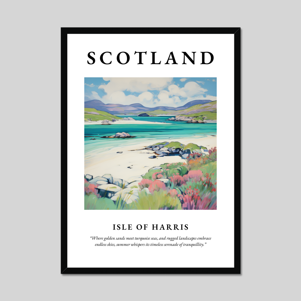 Often referred to as one of the most picturesque places in the world, the Isle of Harris captures the heart with its untamed beauty and rich cultural history. The painting’s celebration of colour and form mirrors the island’s lively yet peaceful atmosphere, inviting you to explore its hidden gems and open spaces. Hang this exquisite framed poster in your home to transport any room to the wild, untamed beauty of Harris, keeping the timeless serenade of Scotland’s summer close at hand.