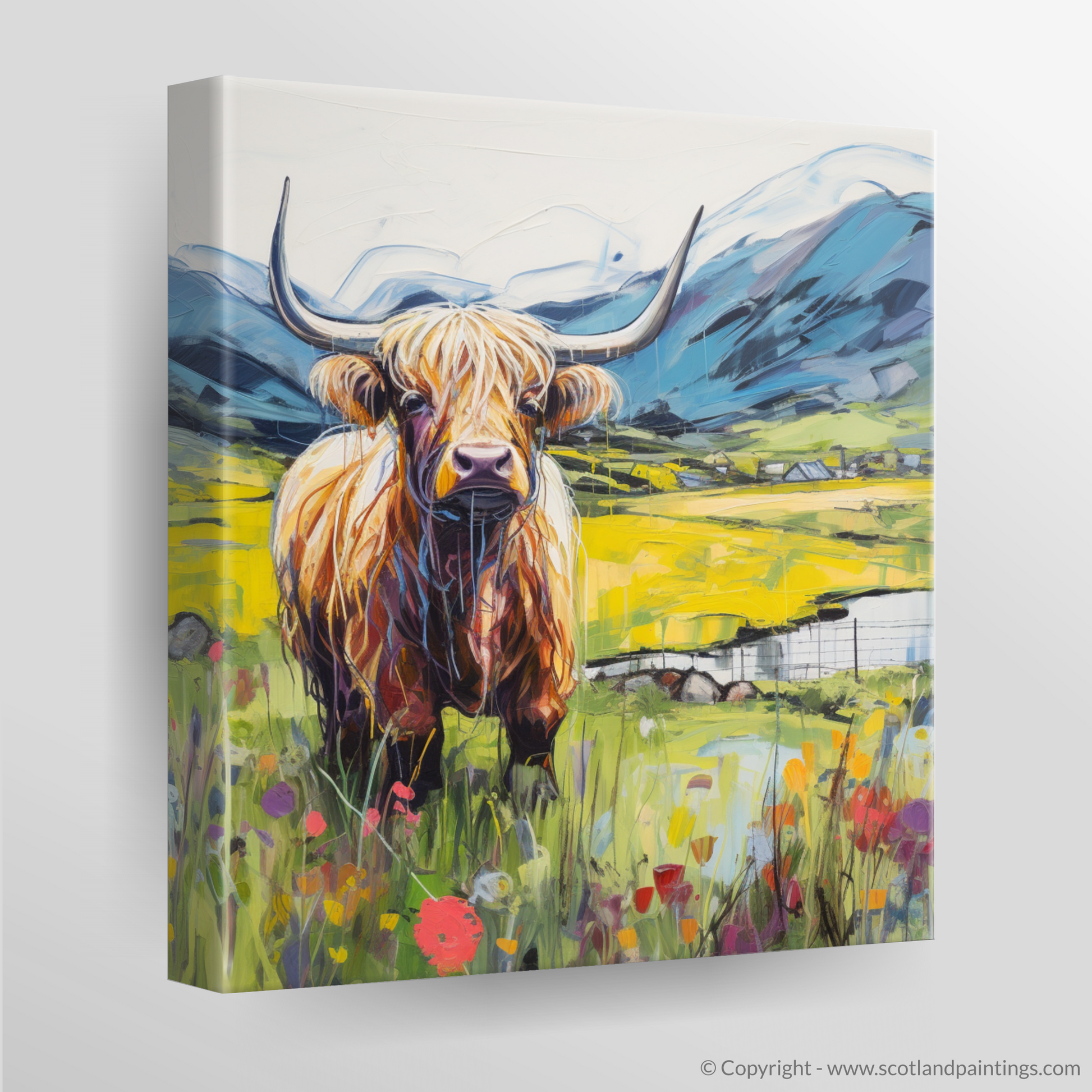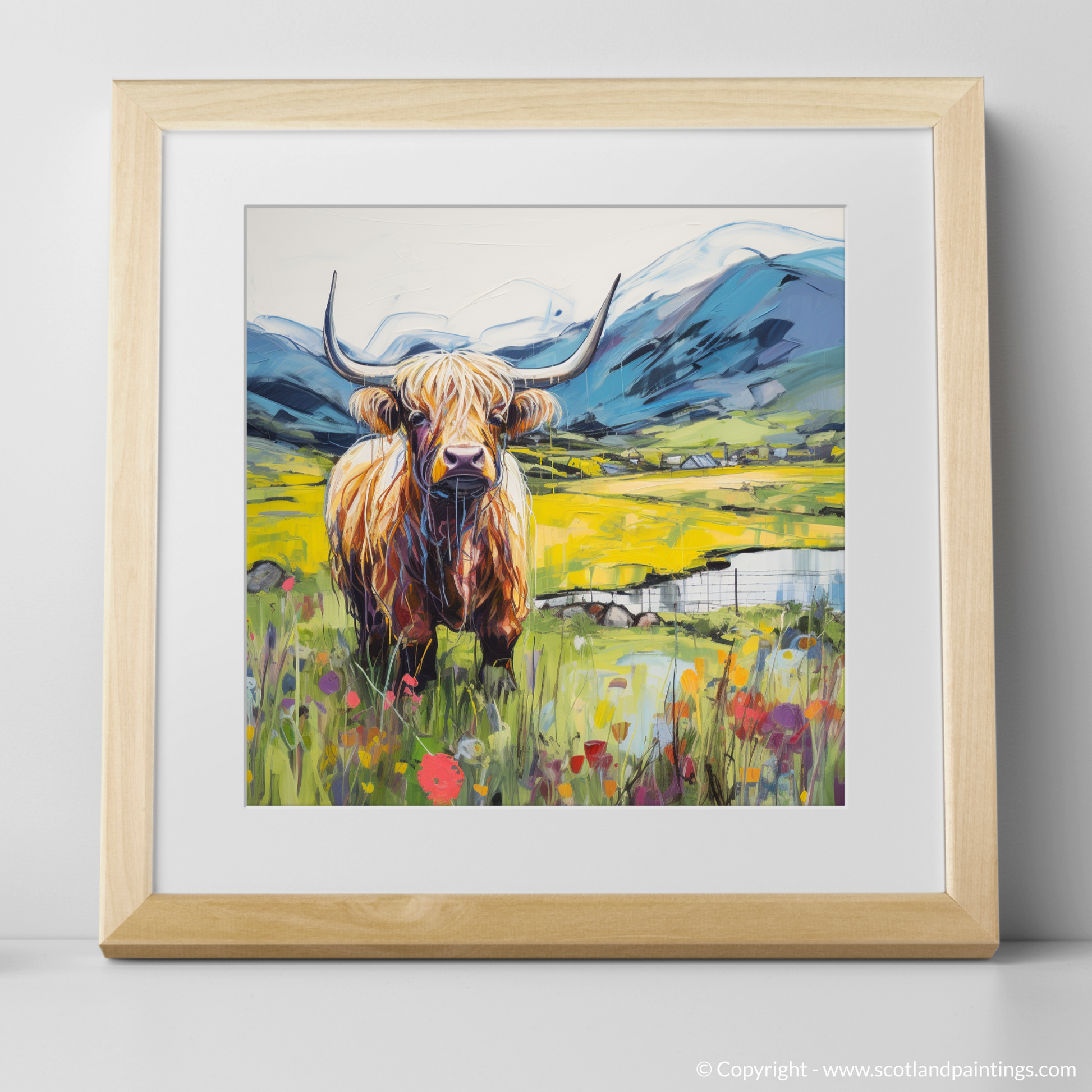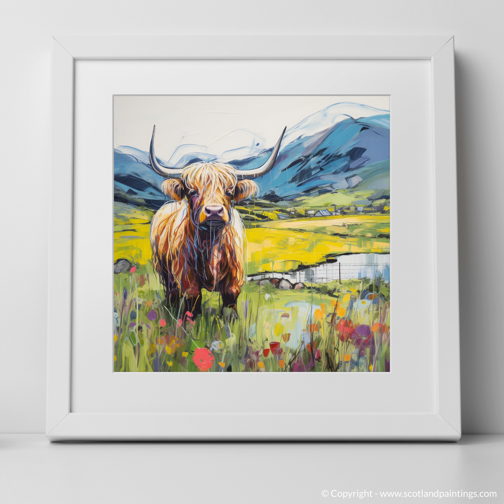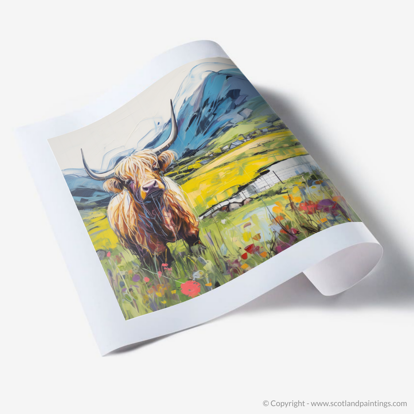 The composition is bold and lively, yet there's a serenity that emanates from the cow's gentle gaze, inviting the viewer to take a moment to relish the serene beauty of Scotland's natural splendours. This print will make a striking addition to any space, offering a window to the soul of Scotland's wild countryside during the most vibrant season of the year.