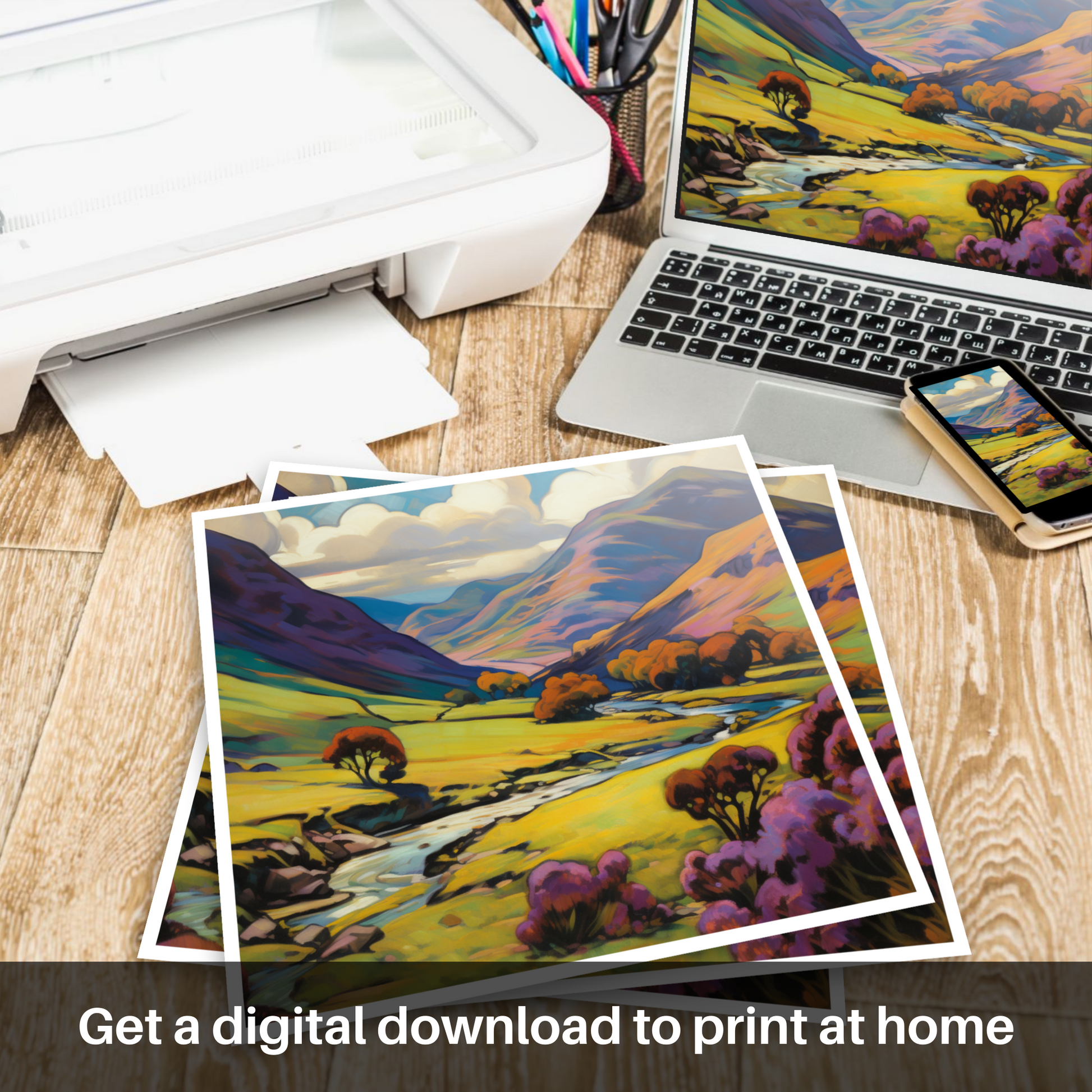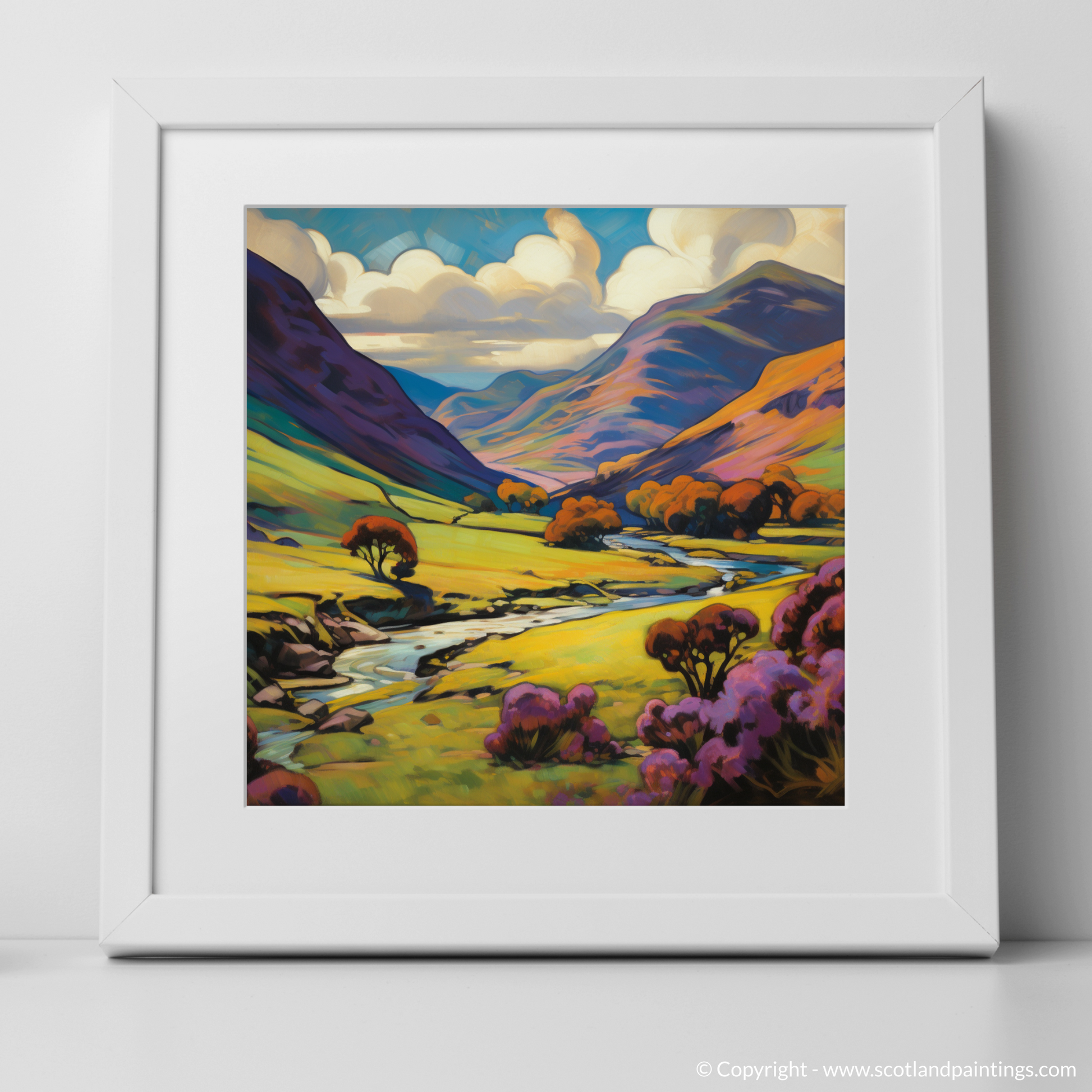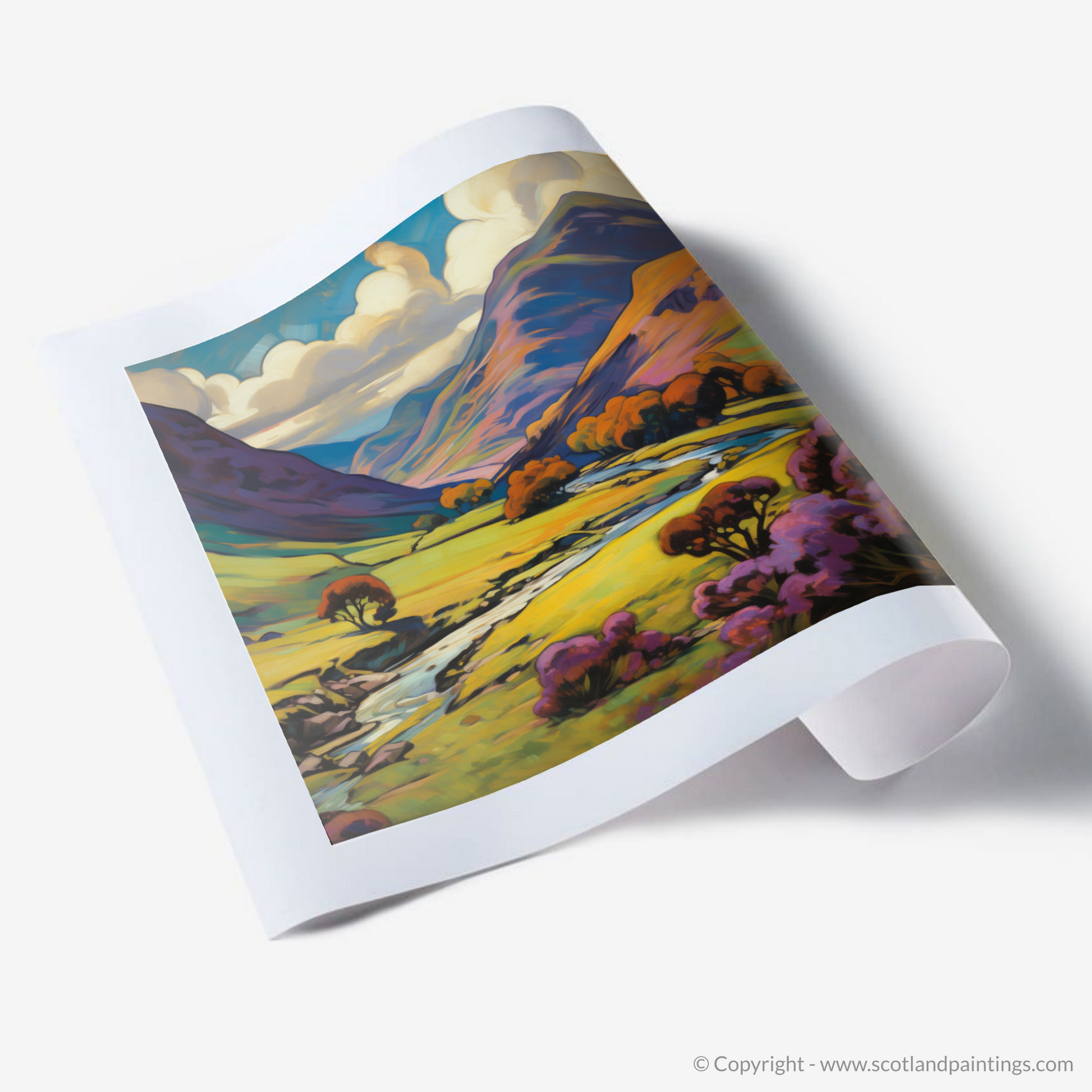 Capturing the essence of the Scottish Highlands during the balmier months, this vibrant print translates the sweeping beauty of Glen Roy into a symphony of colour and light. The painting's Impressionistic style lends a dream-like quality to the landscape, with broad, emotive brushstrokes that evoke the movement and warmth of summer air.