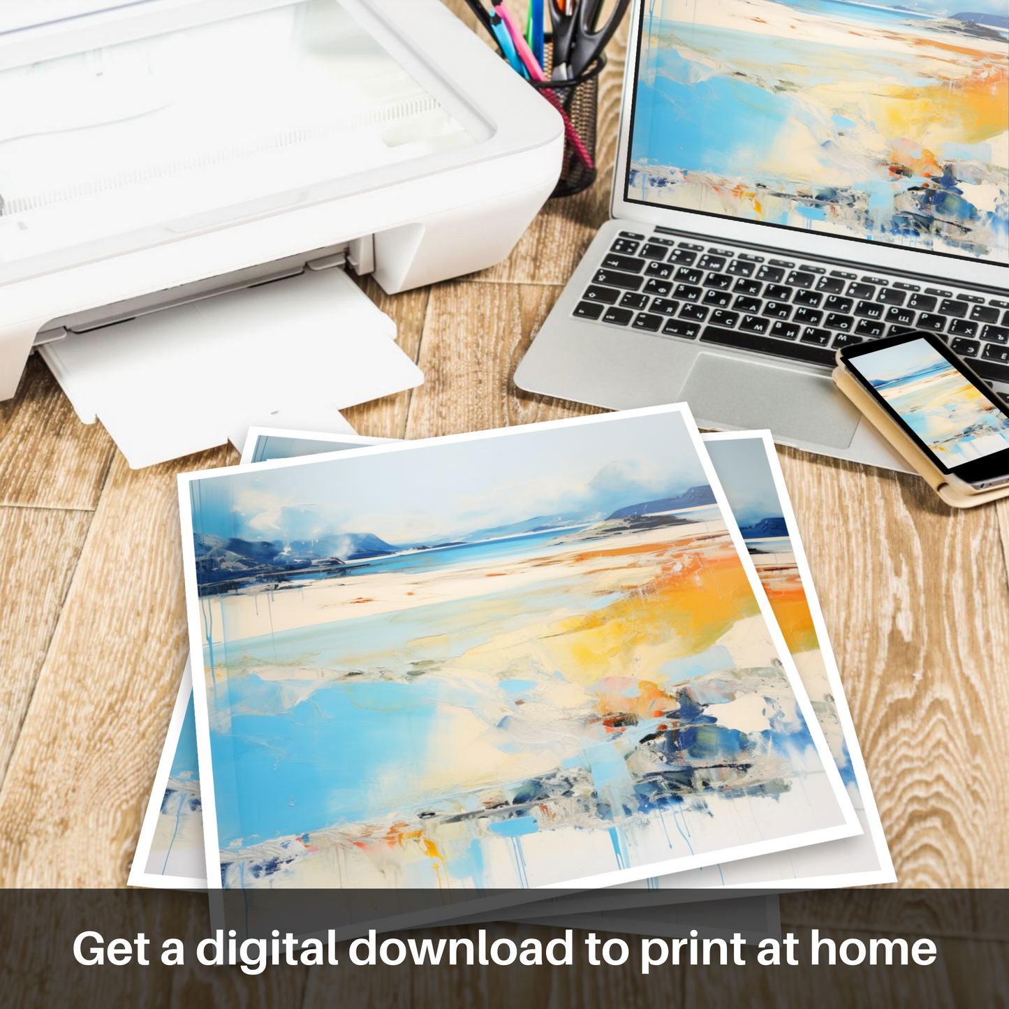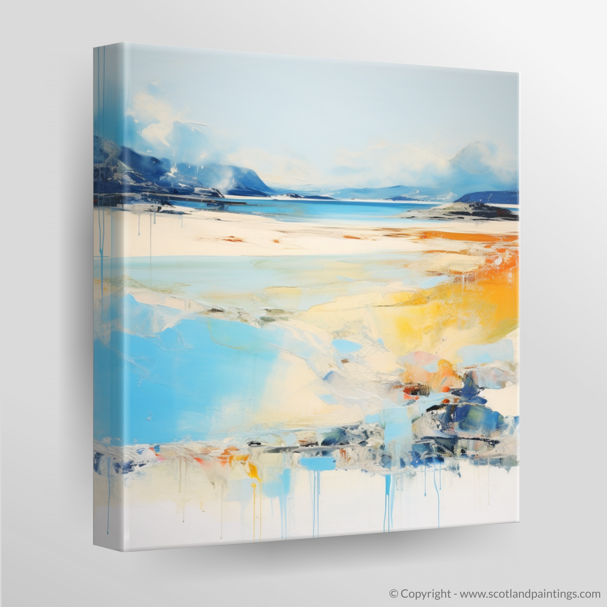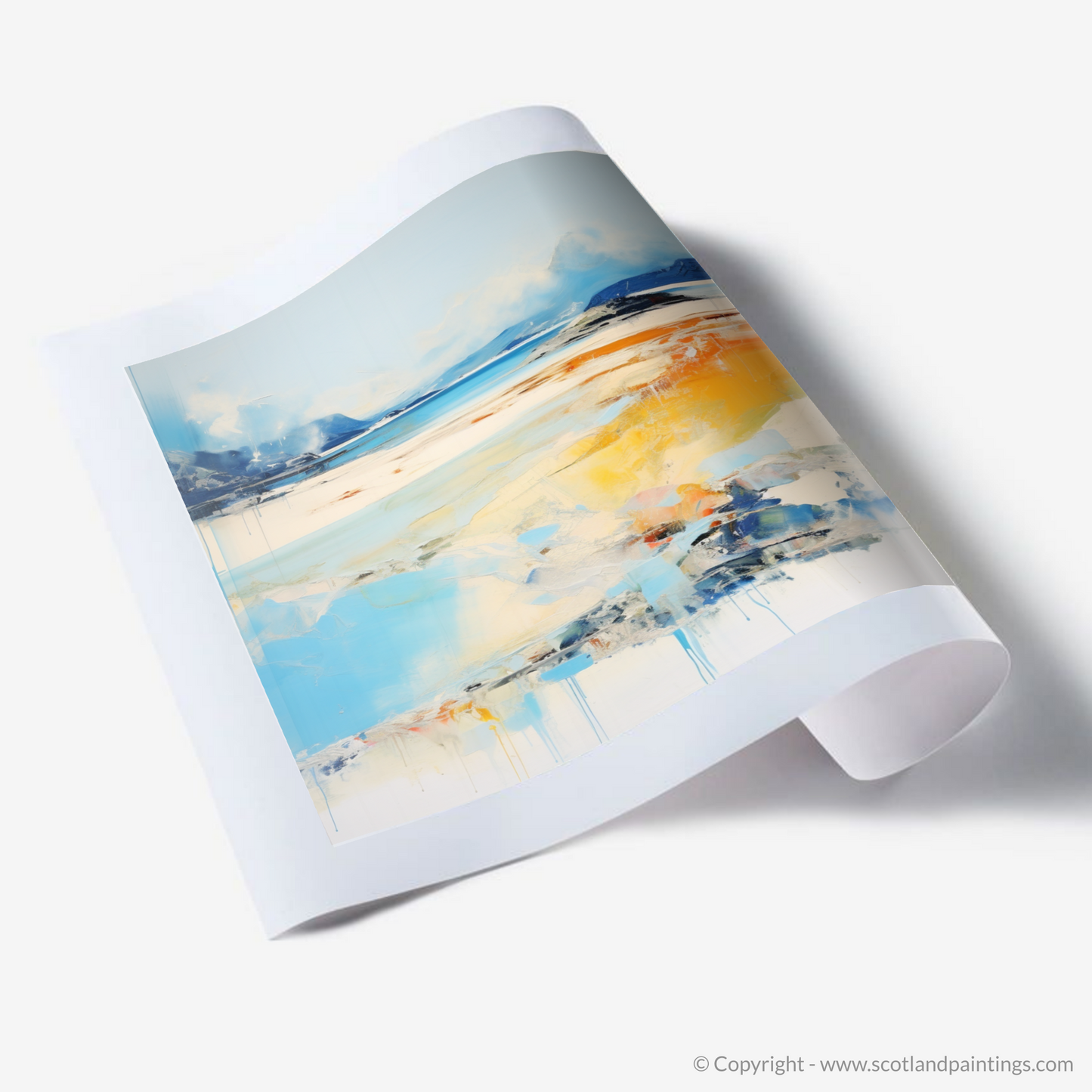 Captivate your senses with this stirring abstract representation of the Silver Sands of Morar, a delightful homage to the Scottish summertime. With its vivid, sweeping strokes of azure, cerulean, and cobalt, this piece invites you to experience the crispness of a summer sky and the tranquil expanse of the sea. The horizon melds ocean with the heavens in a symphony of blue tones, suggesting the seamless beauty of the natural world.
