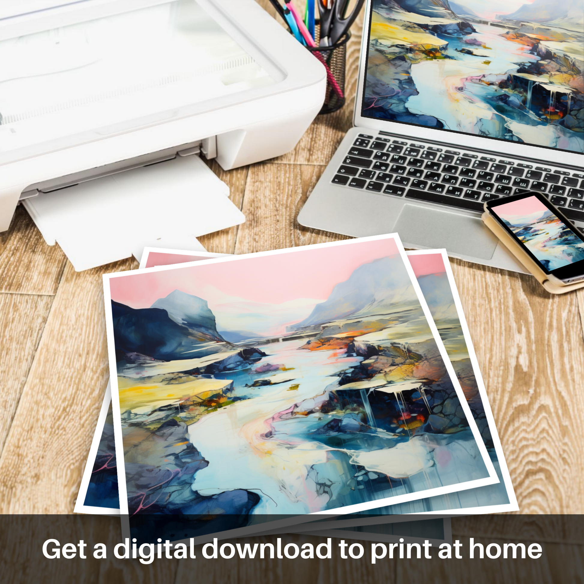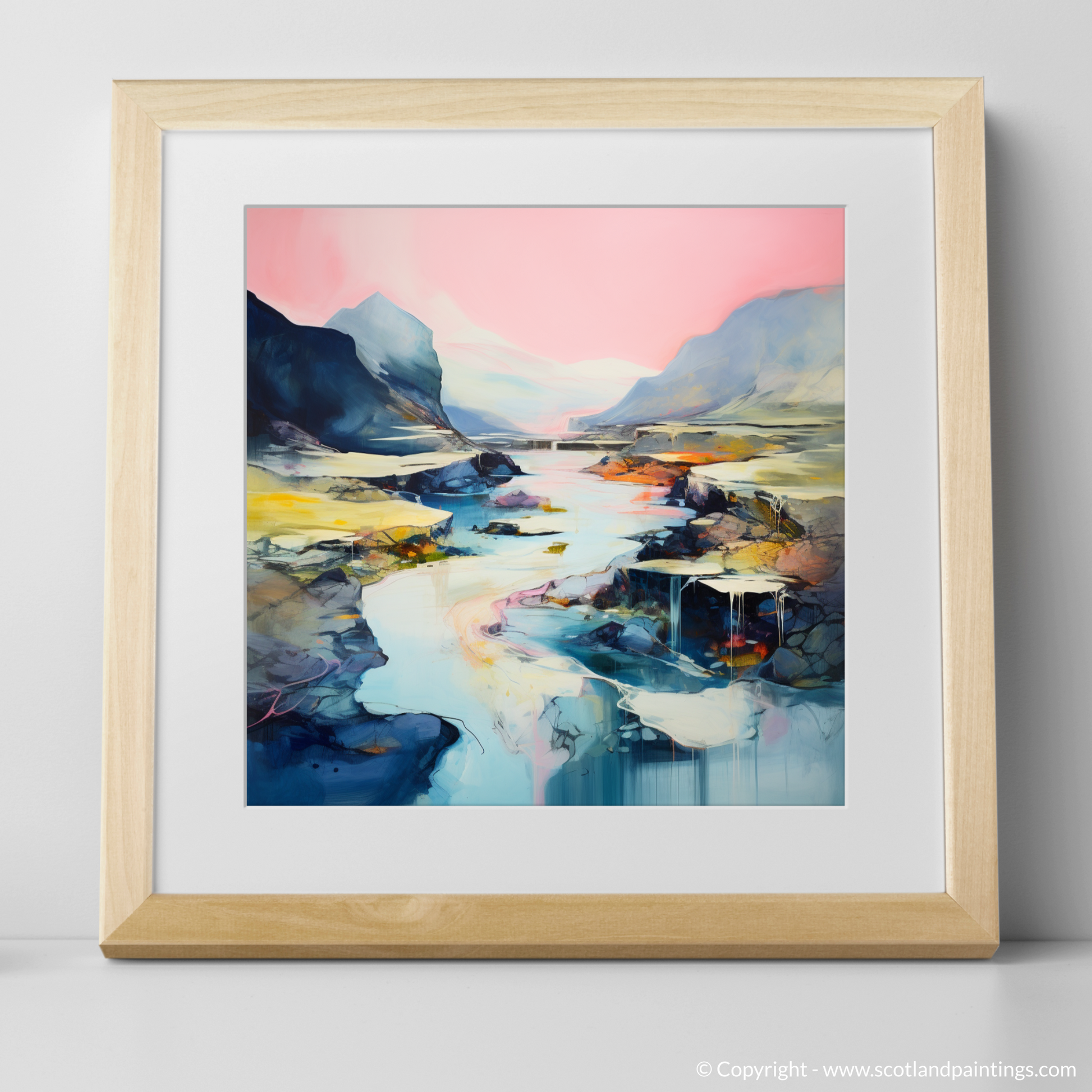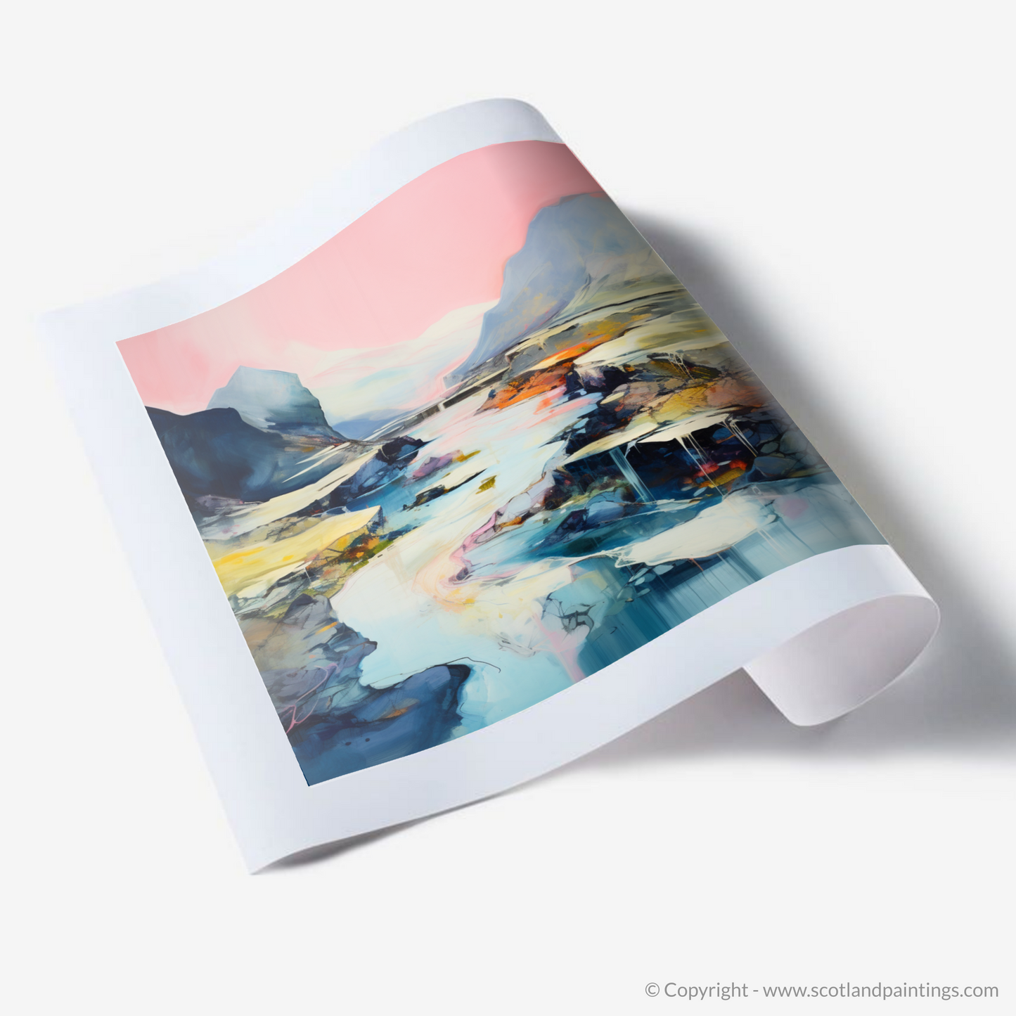 Capturing the ethereal beauty of the Isle of Skye's Fairy Pools at the enchanting hour of dusk, this abstract print pulsates with the vibrant life and mystical allure of a Scottish summer. Swathes of bold pinks and serene blues paint a vivid sky, mirroring the tranquil yet dynamic waters below. The pools, rendered in a synthesis of aqua and sapphire hues, meander through a landscape of golden yellows and rich umbers, a tapestry of colour that echoes the rugged terrain of the Highlands.