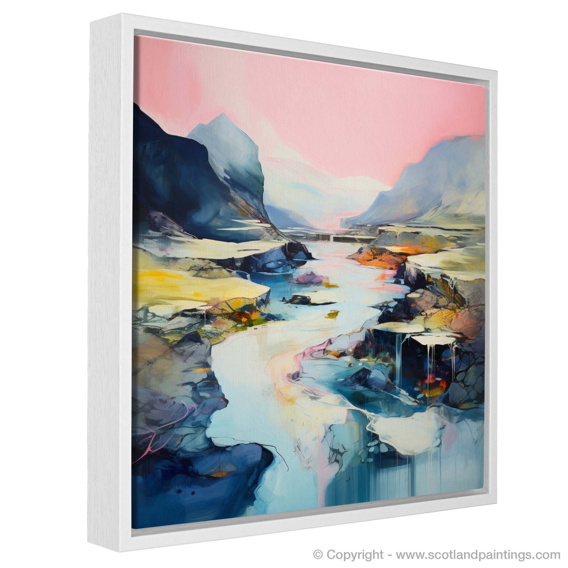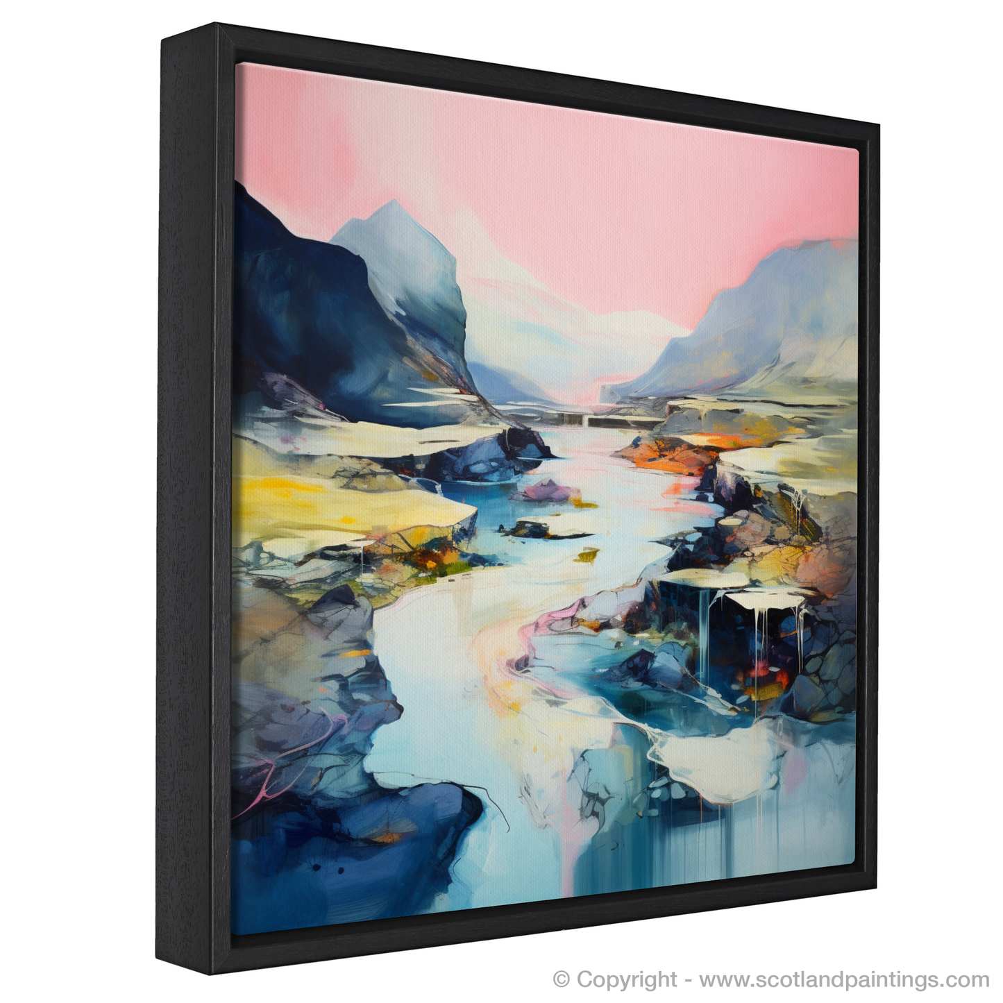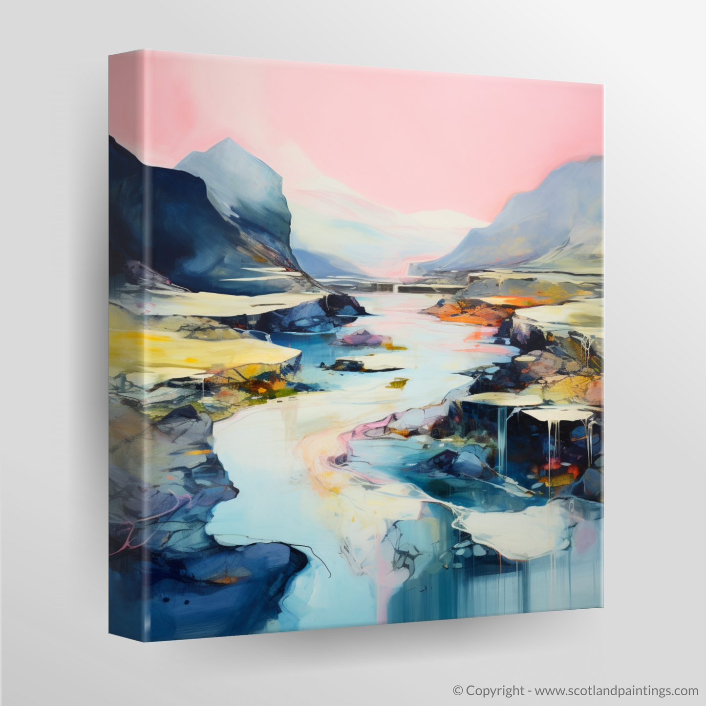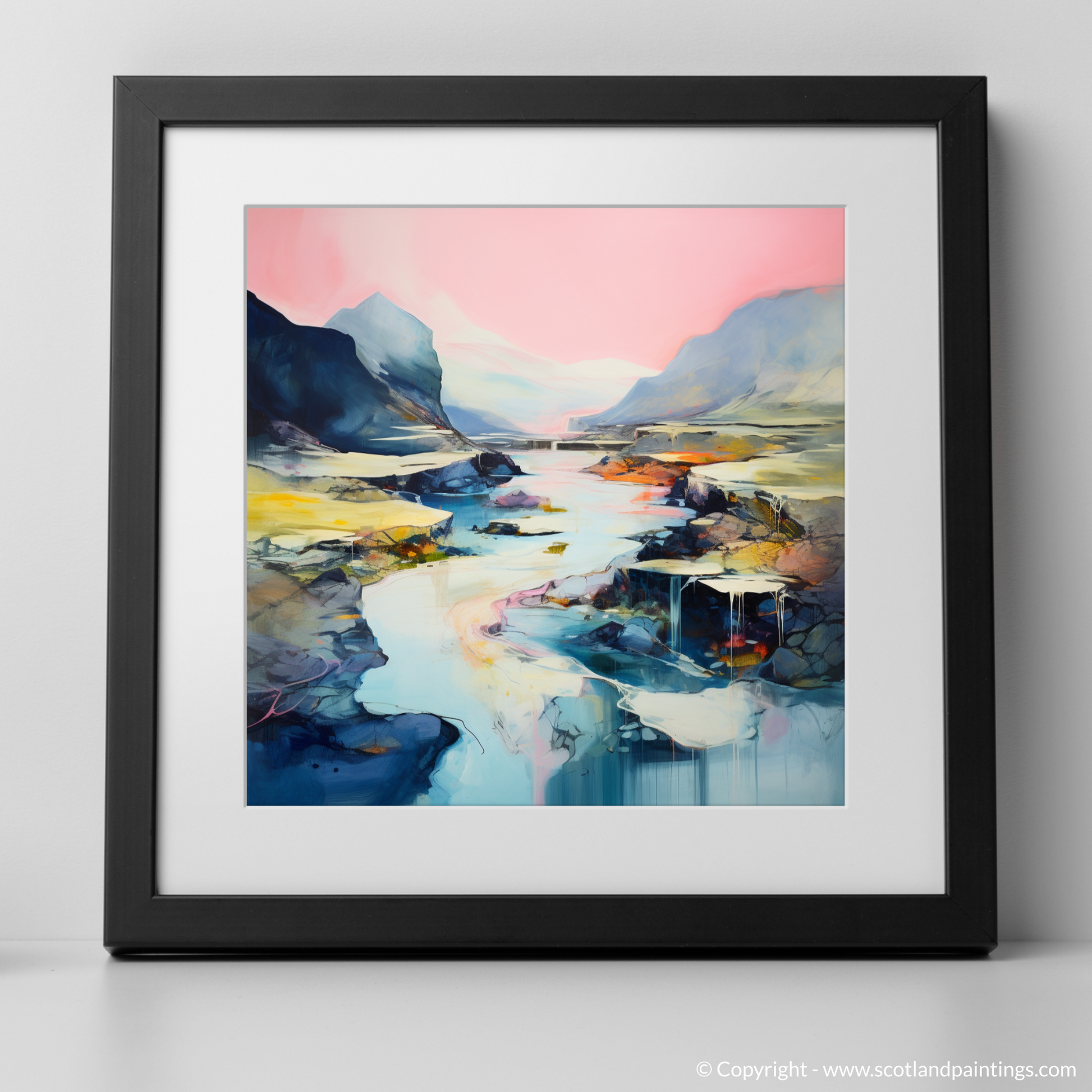 Capturing the ethereal beauty of the Isle of Skye's Fairy Pools at the enchanting hour of dusk, this abstract print pulsates with the vibrant life and mystical allure of a Scottish summer. Swathes of bold pinks and serene blues paint a vivid sky, mirroring the tranquil yet dynamic waters below. The pools, rendered in a synthesis of aqua and sapphire hues, meander through a landscape of golden yellows and rich umbers, a tapestry of colour that echoes the rugged terrain of the Highlands.