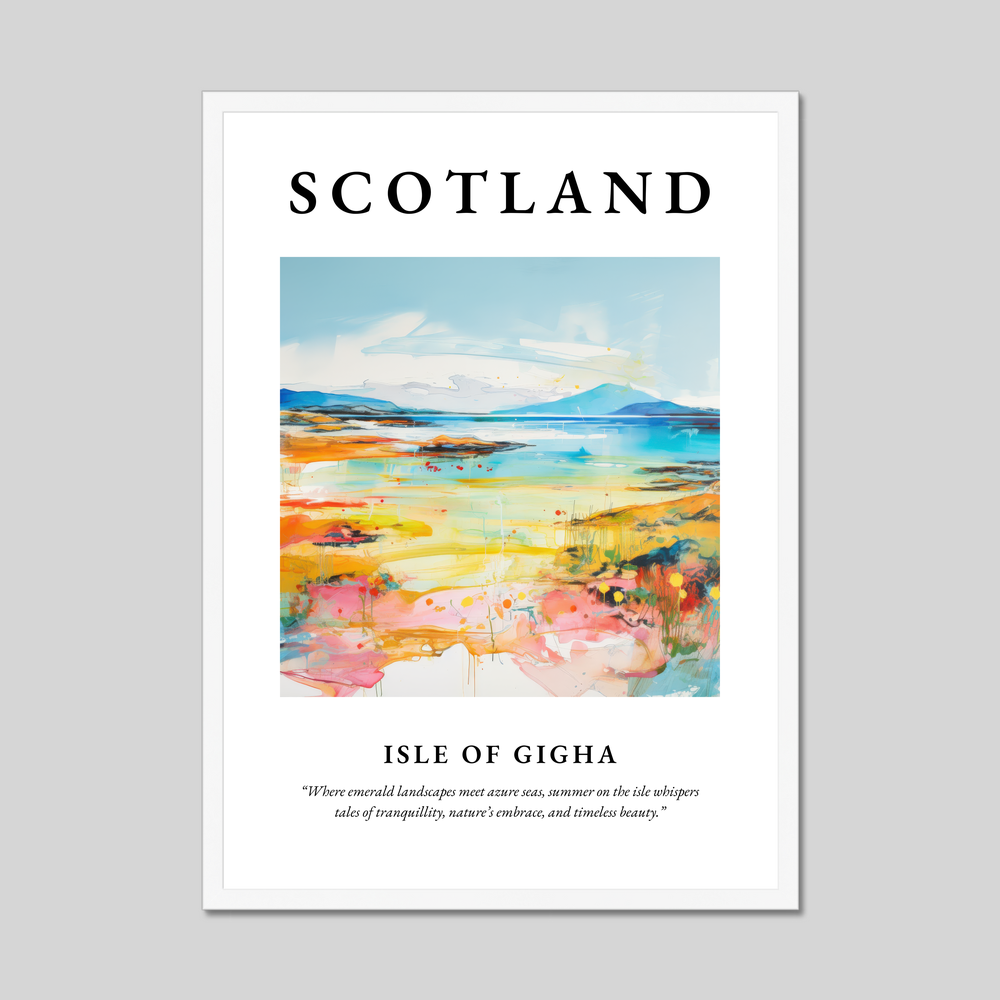 Displayed in bold lettering at the top, “SCOTLAND” announces the essence of this captivating print. Beneath it lies an abstract painting that beautifully encapsulates the island’s charm. With vibrant splashes of orange, blue, and green, the artist captures the essence of Gigha's emerald landscapes and azure seas. The colours swirl and merge, evoking a sense of movement and serenity, mirroring the quote below: “Where emerald landscapes meet azure seas, summer on the isle whispers tales of tranquillity, nature’s embrace, and timeless beauty.”