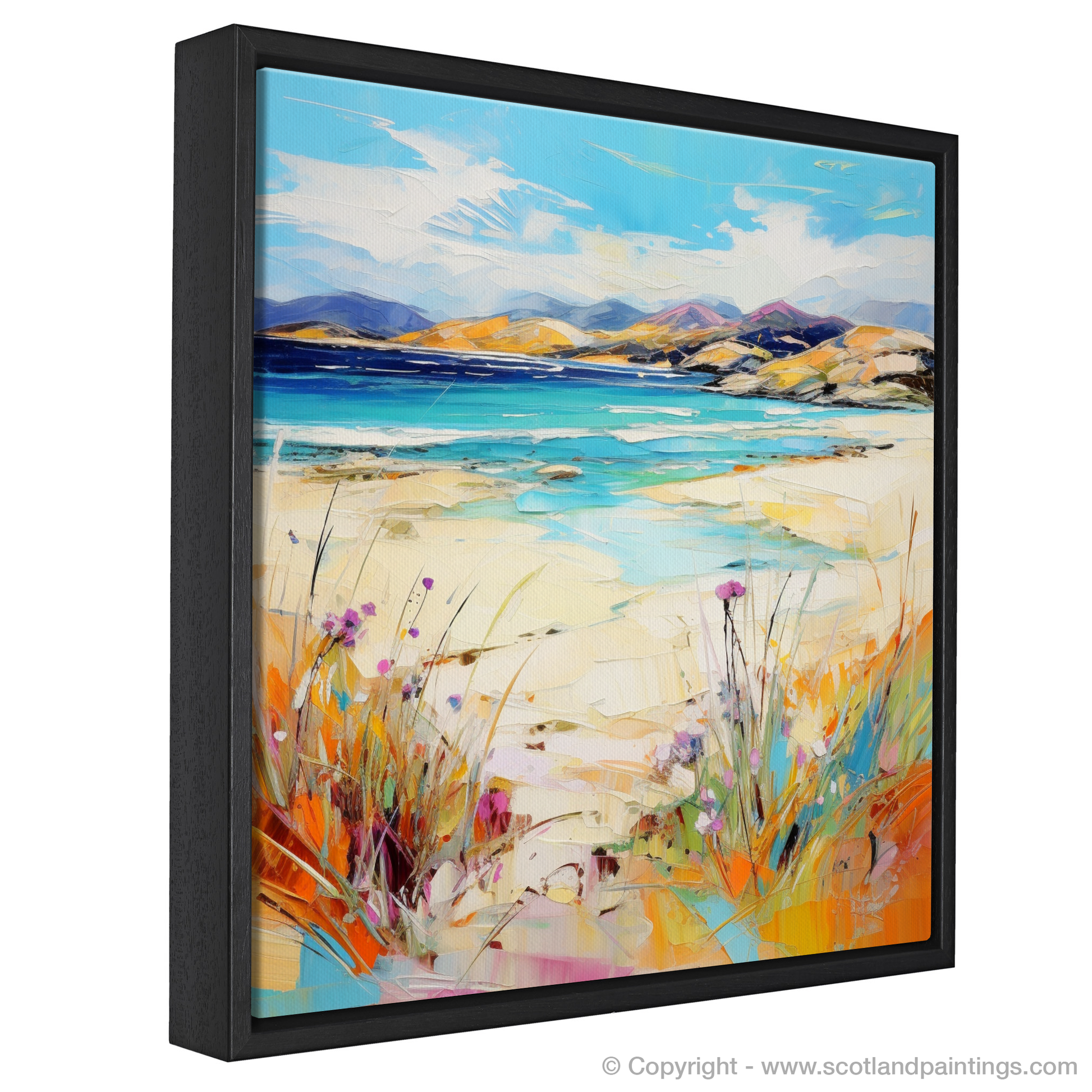 Capture the essence of a Scottish summer with this evocative print that transports viewers to the stunning Seilebost Beach on the Isle of Harris. Brushstrokes filled with vibrancy create a dynamic, almost tangible landscape, where the purity of the white sands glistens under a brilliant sun. The azure tones of the serene sea interplay with the aquatic hues, carrying the viewer's gaze towards the distant hills that rise gently into soft, pastel skies.