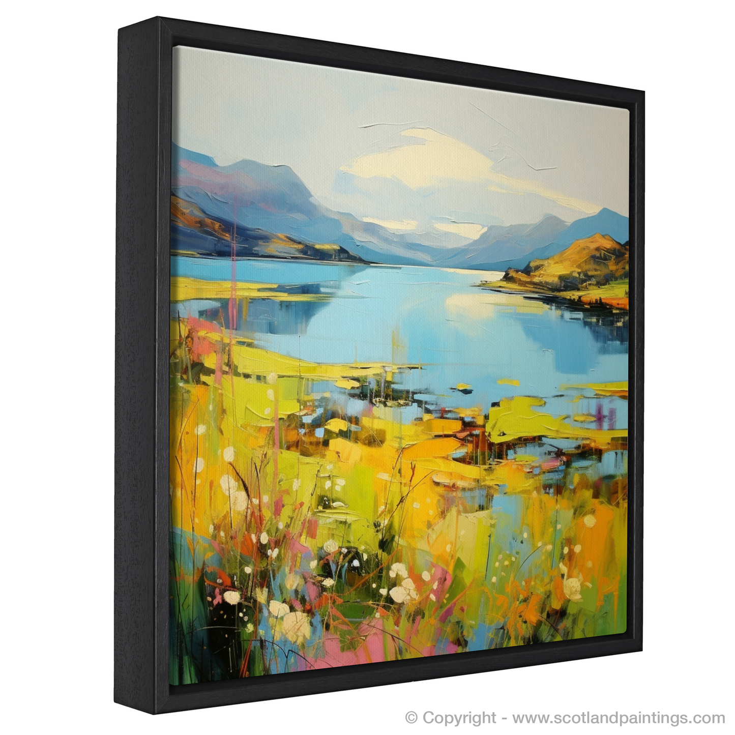 Rich, dynamic strokes of yellow and green evoke flourishing wildflowers and sunlit grass, animating the foreground with a lively burst of colour. These vivid hues contrast gracefully with the cool blues and gentle lilacs that stretch across the tranquil loch, leading the eye towards distant mountains shrouded in misty hues of mauve and slate.