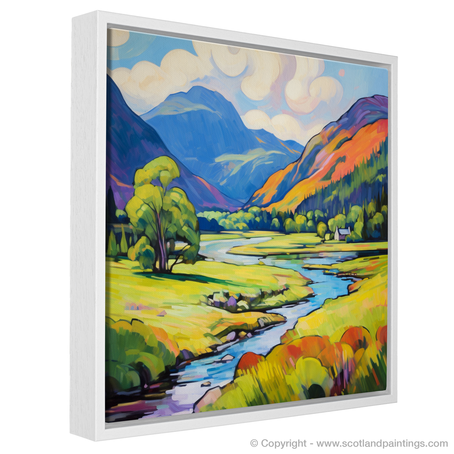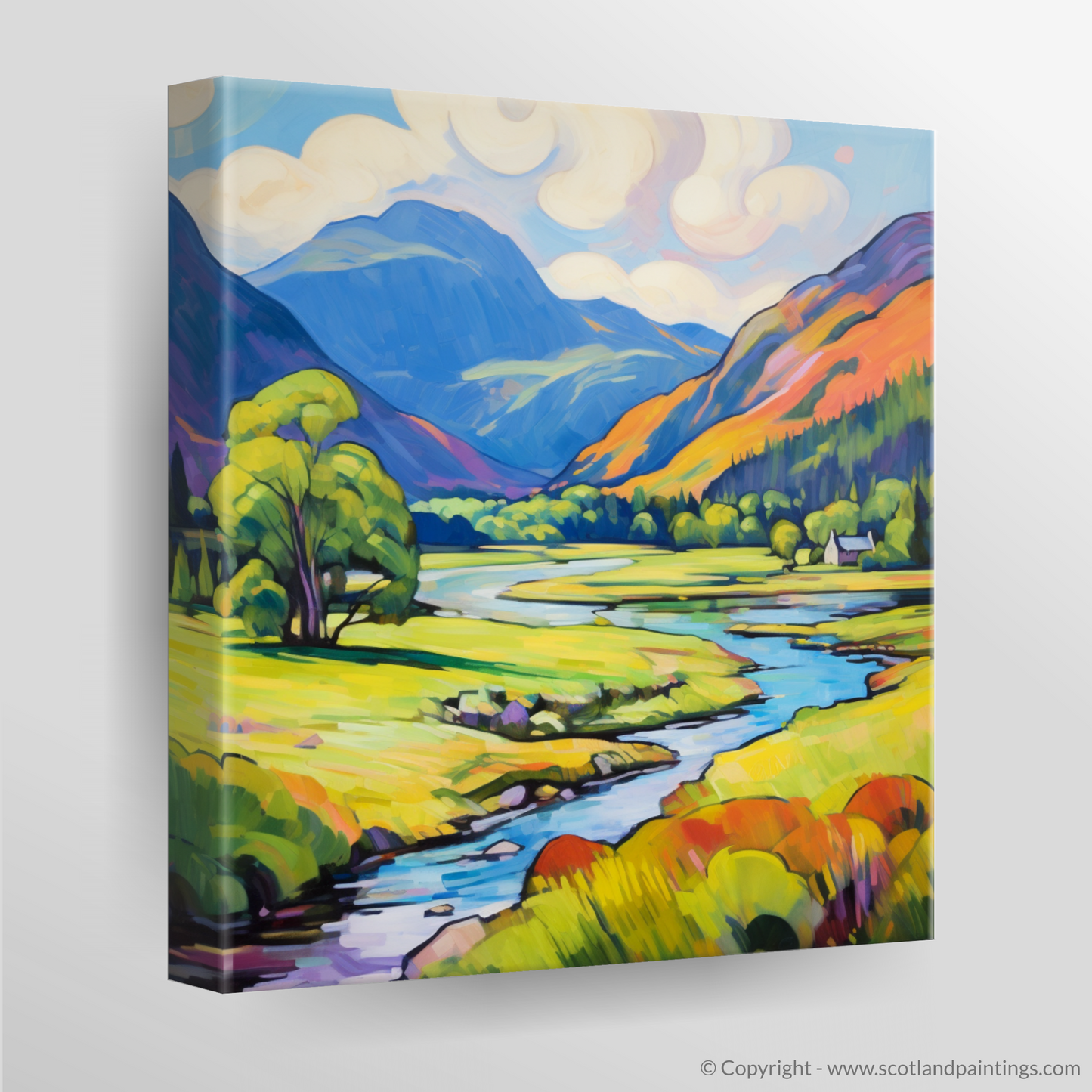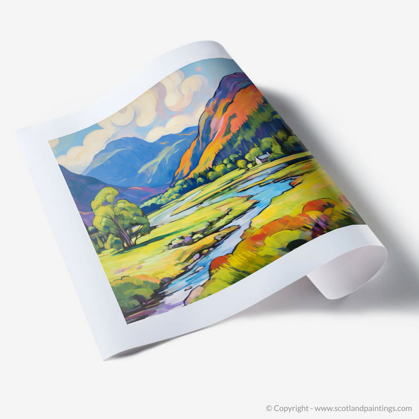 The undulating contours of the hills are rendered with thick, expressive brushstrokes, adding a sense of movement and texture that invite the viewer to explore every corner of the canvas. This print is not just a depiction of a place but an emotional response to the raw beauty of Glenfinnan in summer, offering a window to a world where nature's palette is reimagined with audacious splendour.