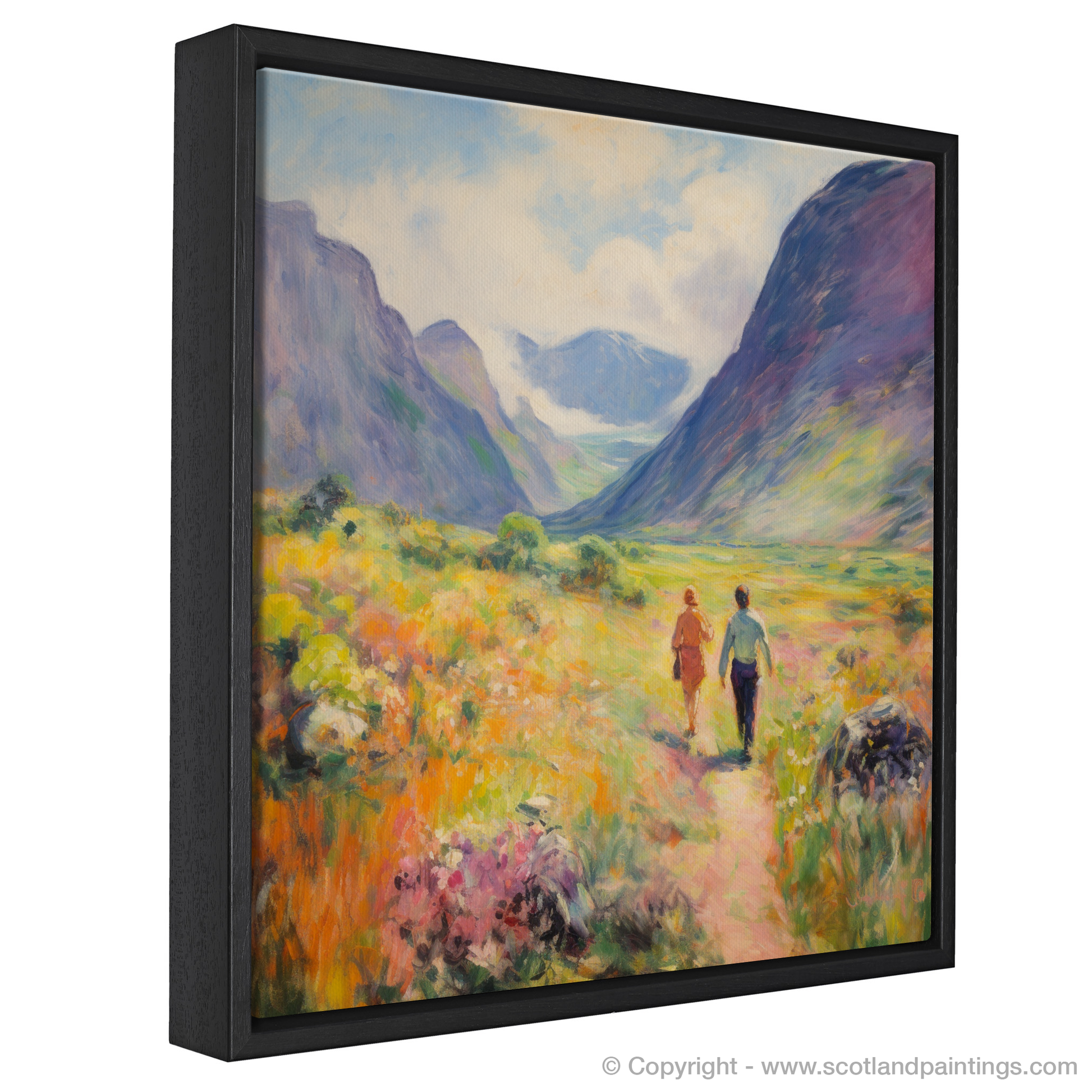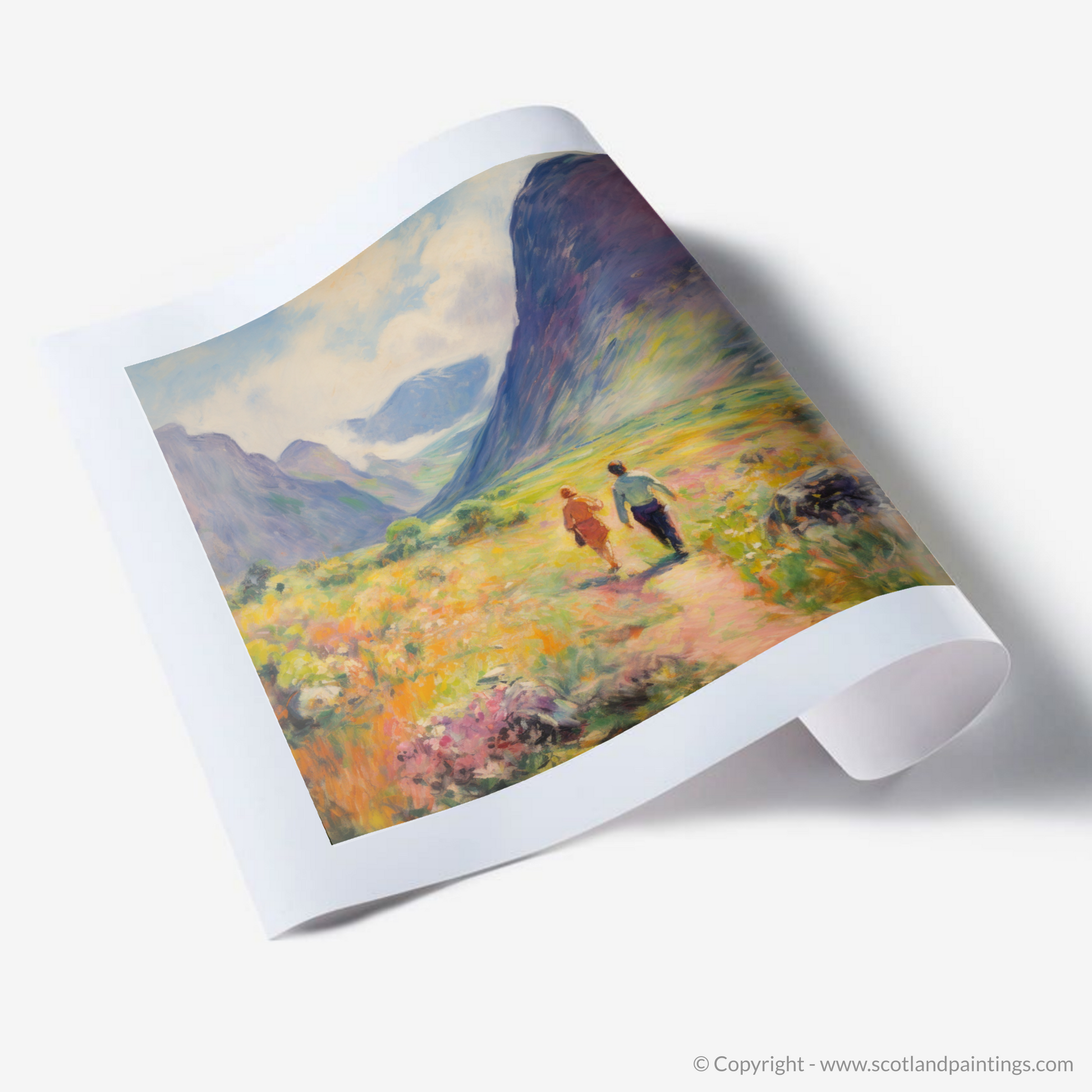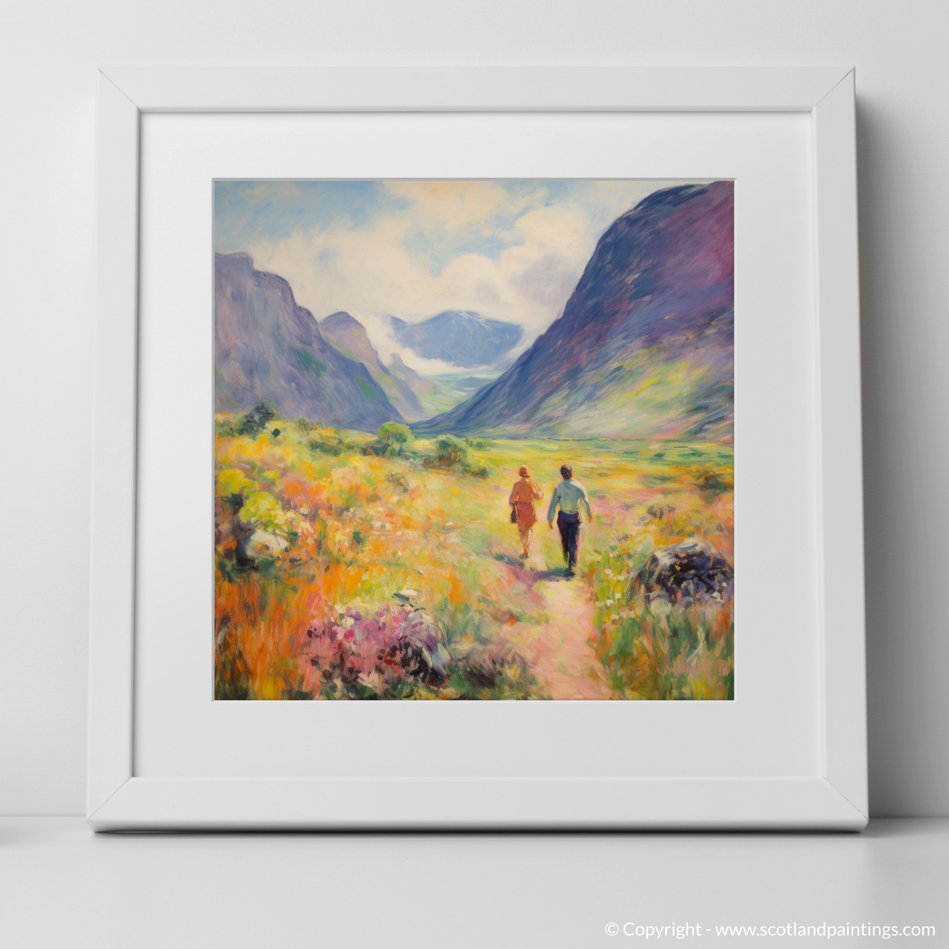 Capture the essence of a Scottish summer with this captivating print, which brings the wild beauty of Glencoe to your living space. The artwork, rich in the soft light and vivid colours typical of the Impressionist style, depicts a pair of walkers ambling through the lush, flower-strewn valley.