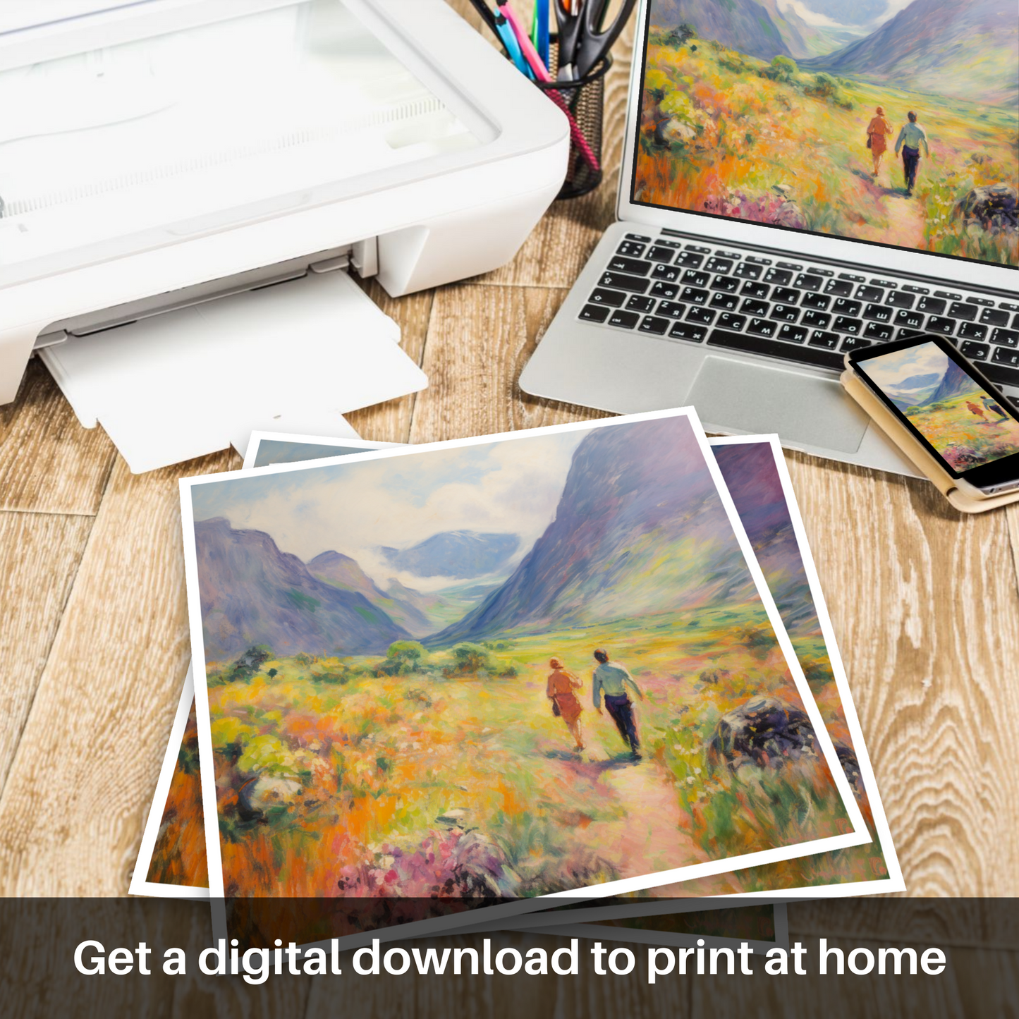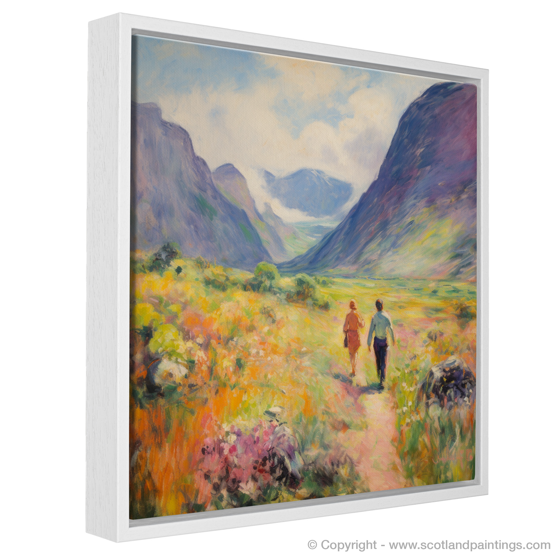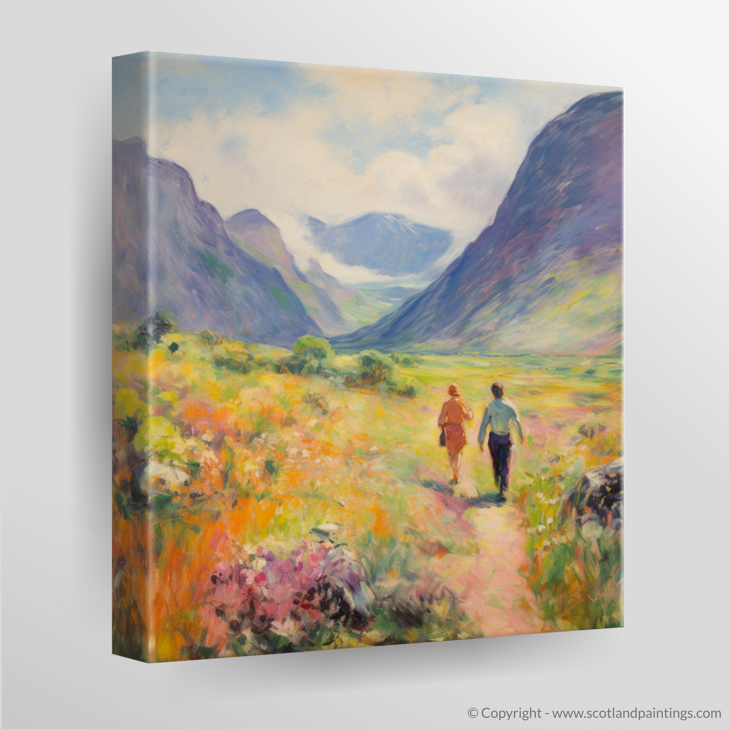 Capture the essence of a Scottish summer with this captivating print, which brings the wild beauty of Glencoe to your living space. The artwork, rich in the soft light and vivid colours typical of the Impressionist style, depicts a pair of walkers ambling through the lush, flower-strewn valley.