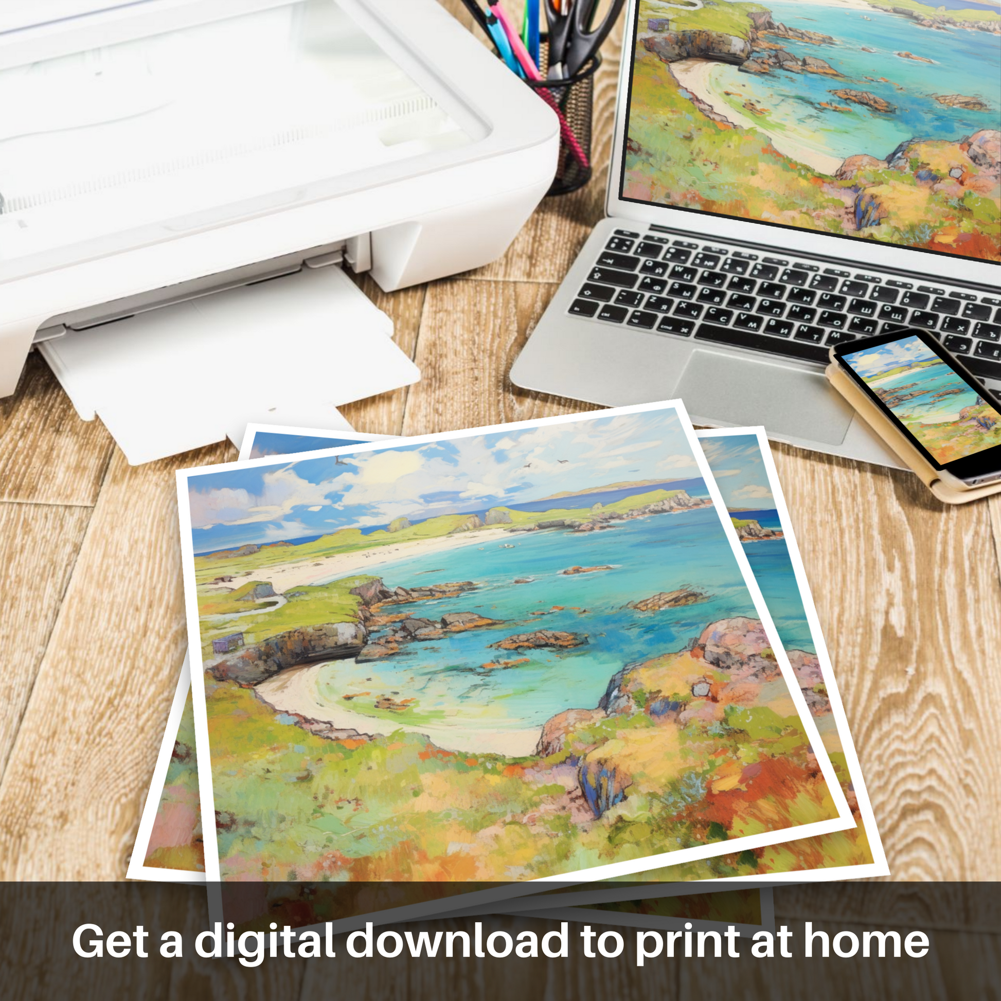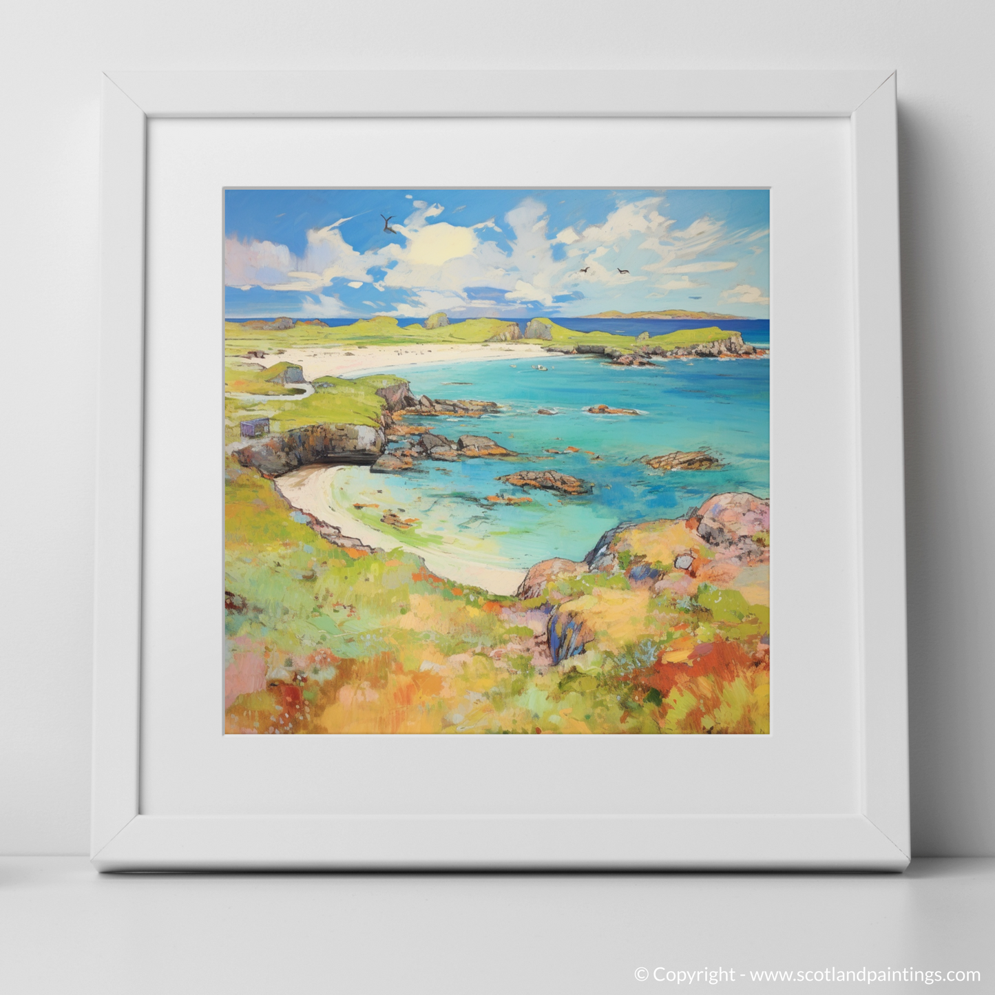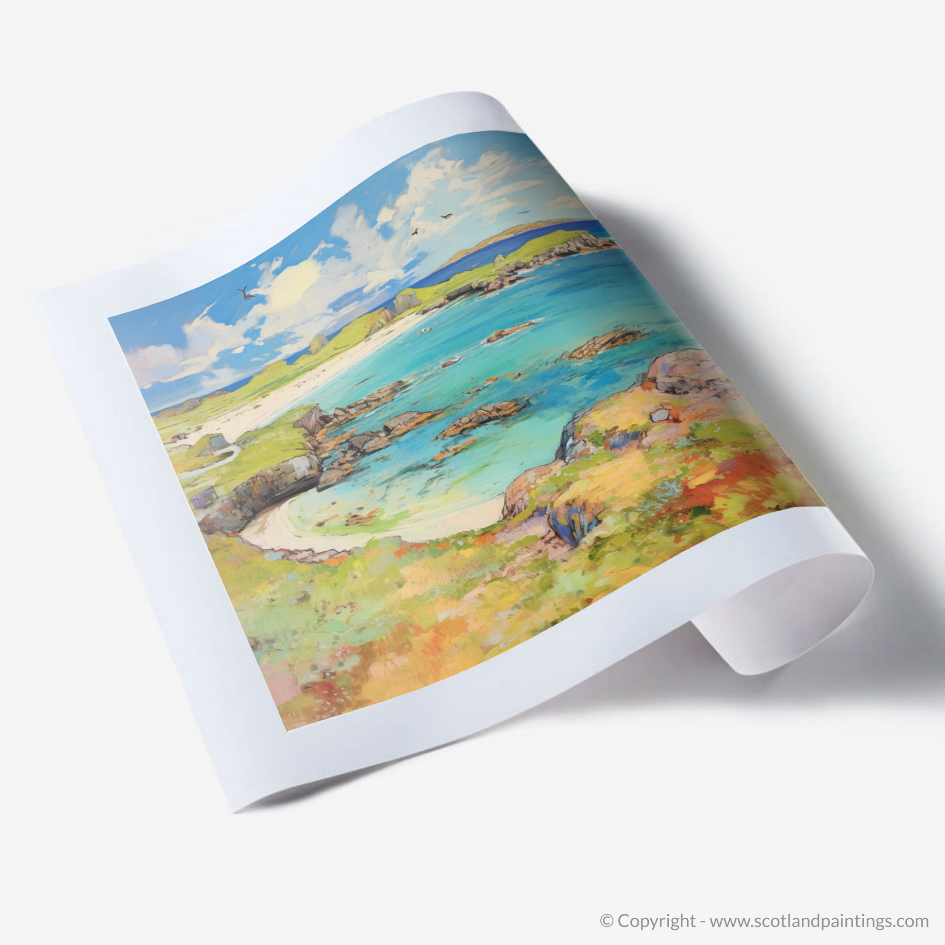 Capturing the ethereal beauty of Scotland's famed Isle of Skye, this print is a celebration of the archipelago's vibrant summer hues, where the azure embrace of the sea meets the warmth of the land. The artwork is a tapestry of textured brushstrokes that vividly echo the dynamic Scottish landscape.