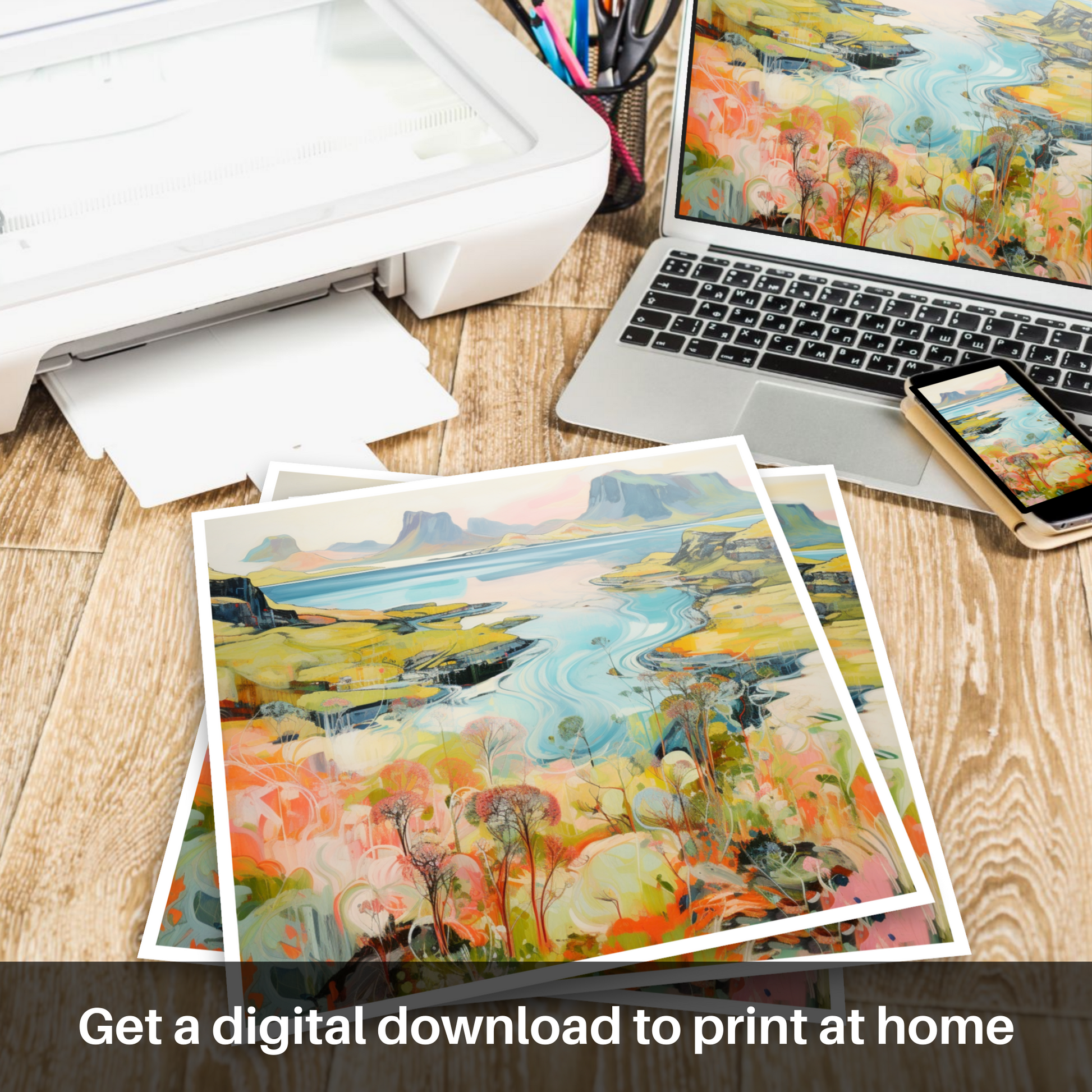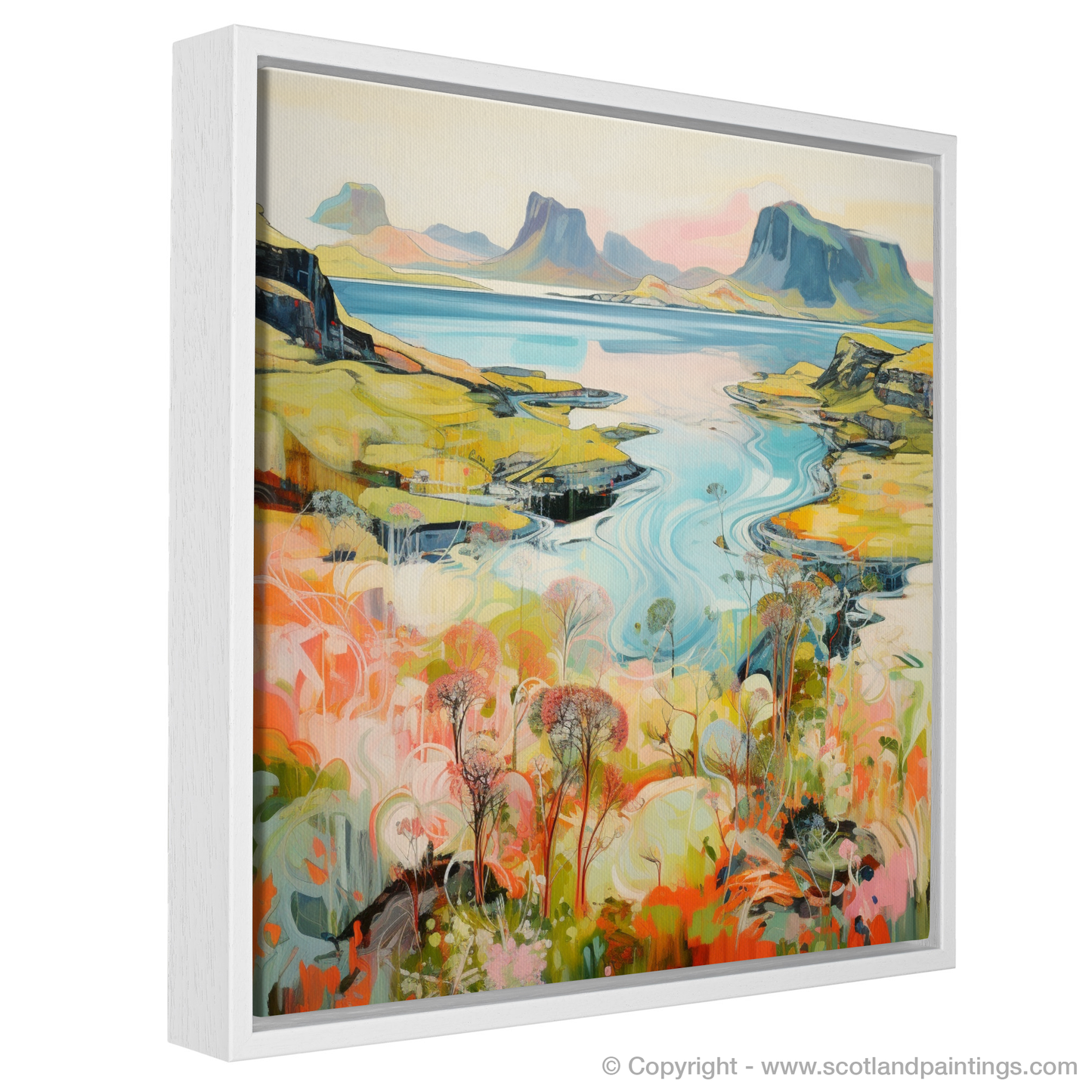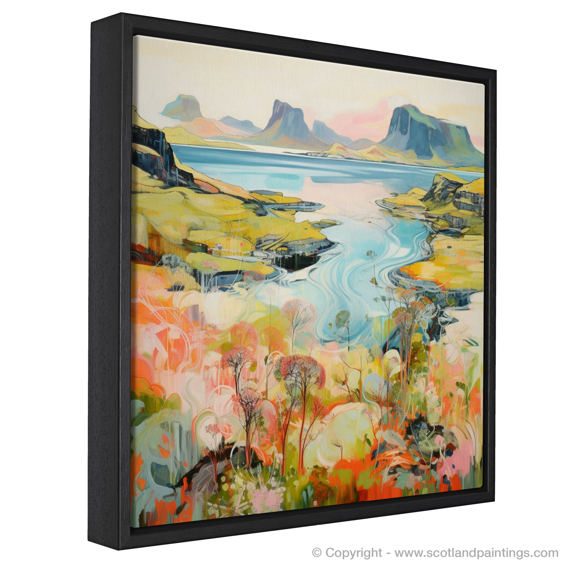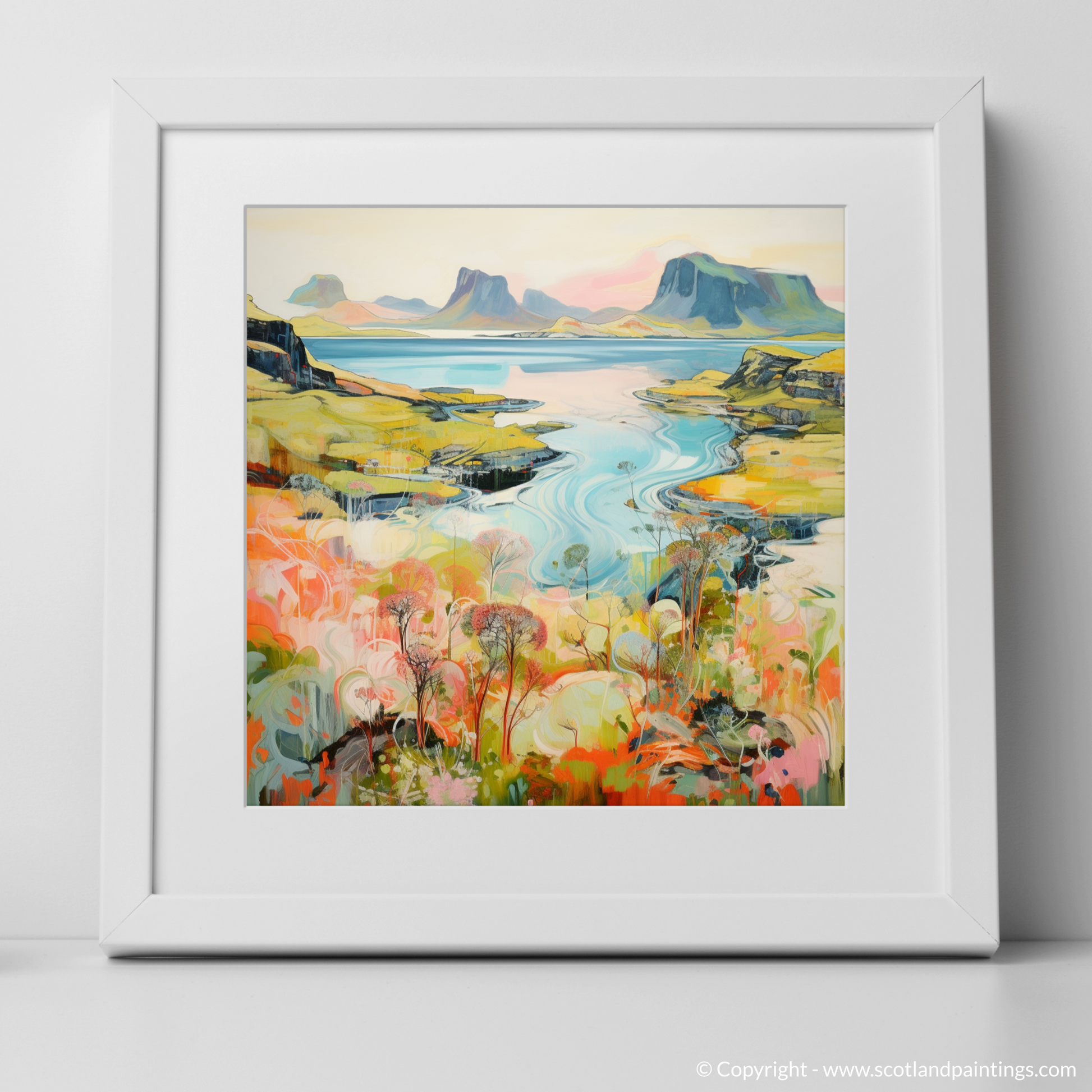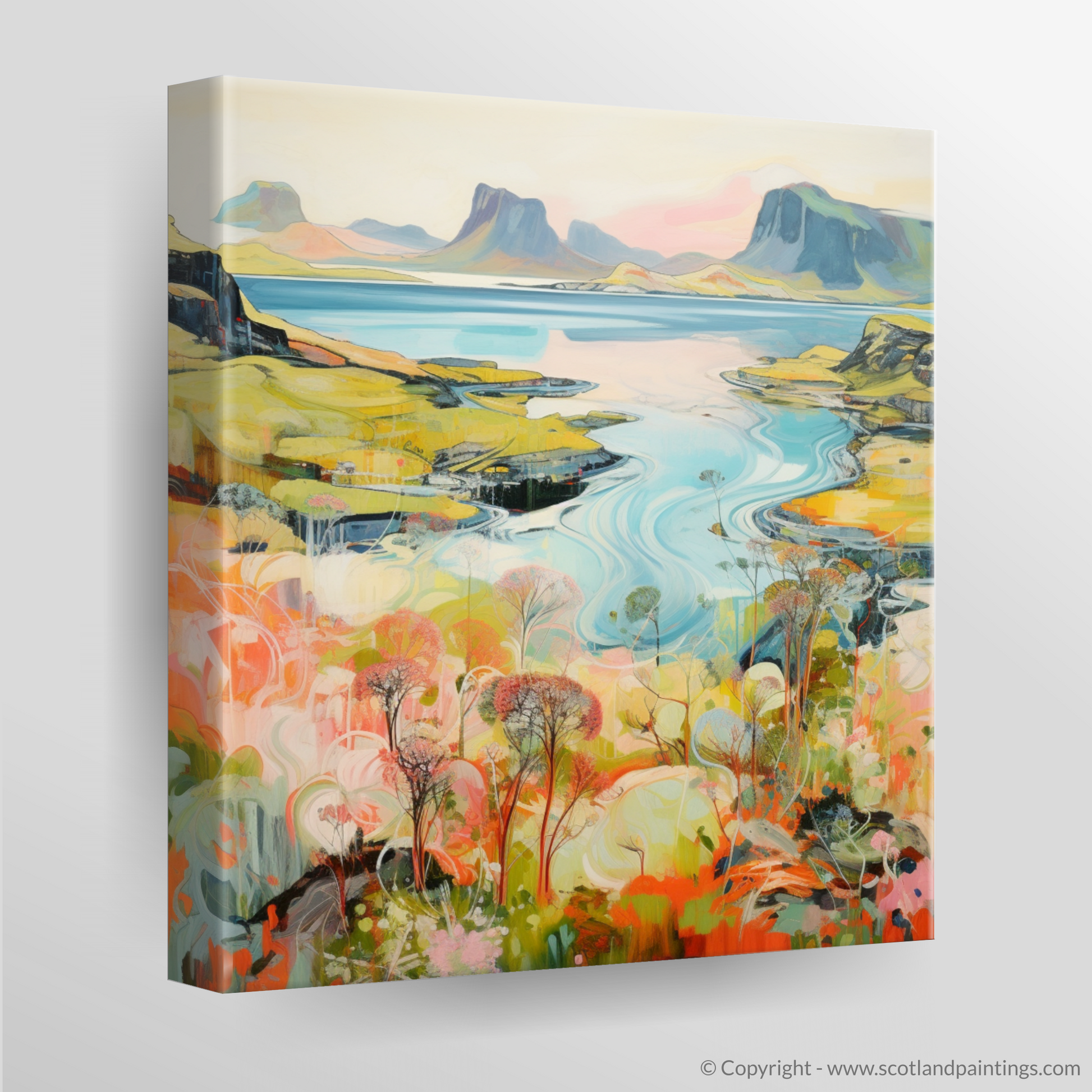 Each element of the composition, from the flamboyant wild blooms to the stoic peaks, is rendered with a contemporary flair that both respects the natural beauty of Skye and reimagines it through a vivid, almost dreamlike lens. The piece harmoniously balances the dynamic beauty of the Scottish summertime with a modern aesthetic that would make a striking addition to any space, inviting viewers to lose themselves in the artistry and allure of one of Scotland's most picturesque locales.