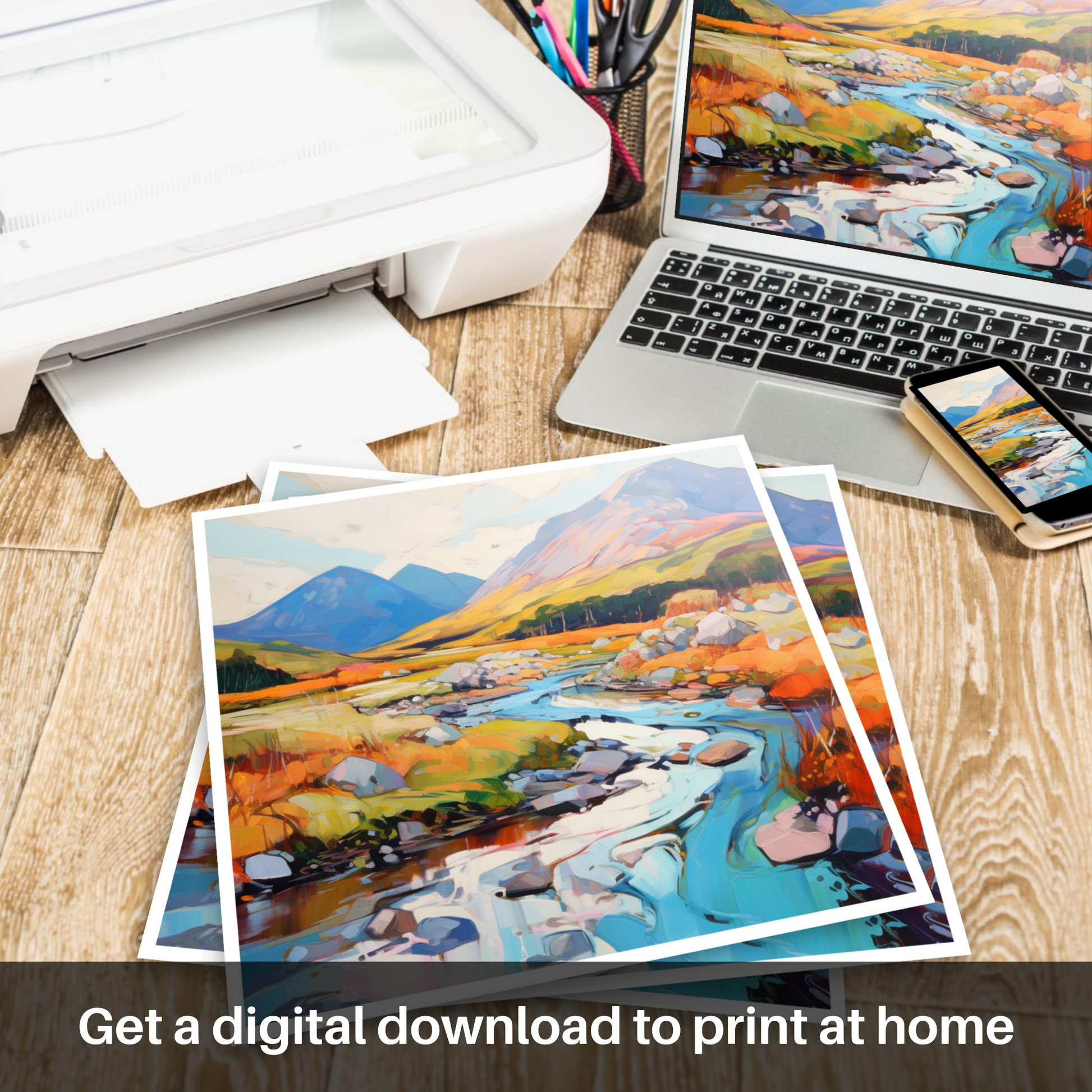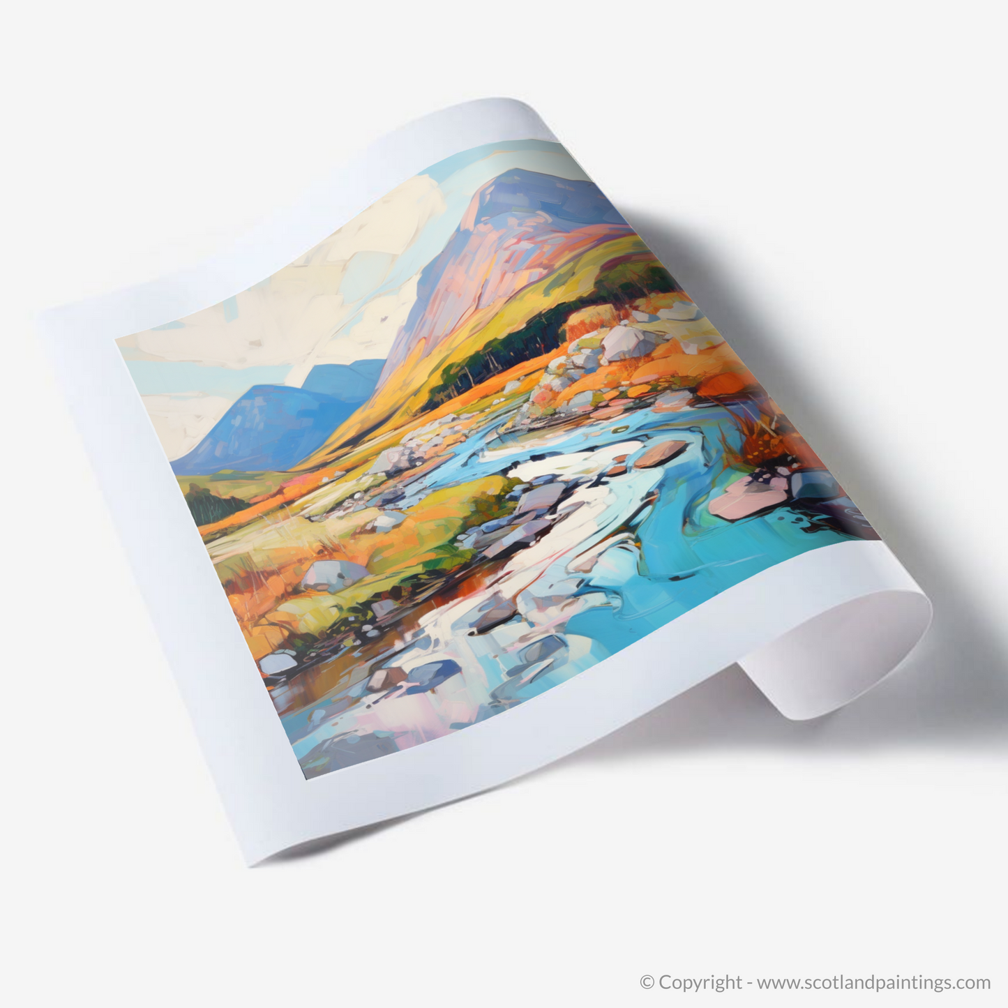 This print is an ode to the dynamic and intense beauty of Scotland's natural landscapes, making it a perfect addition to any collection that seeks to encapsulate the spirit and character of summer in the Highlands. The modern style of the piece brings a fresh and contemporary feel to a traditional subject, sure to enliven any space with its rich and engaging visual narrative.