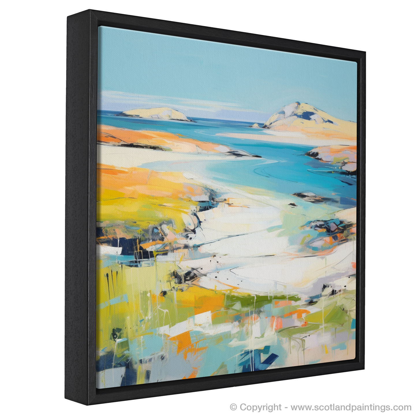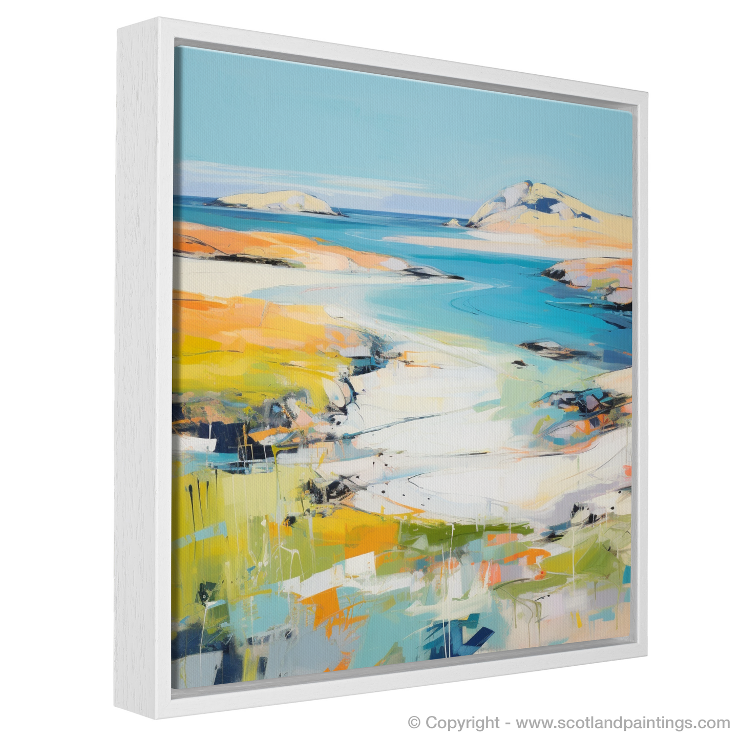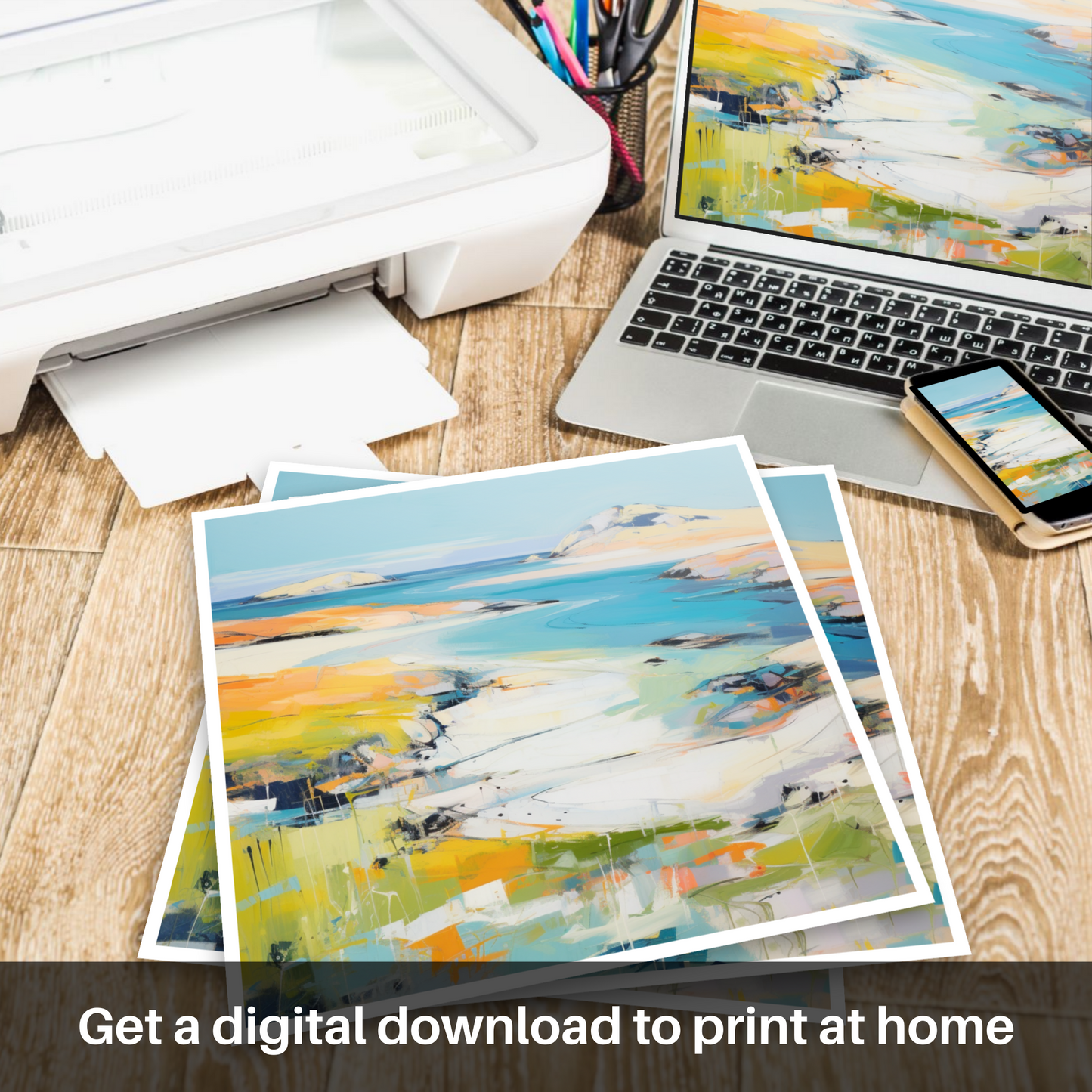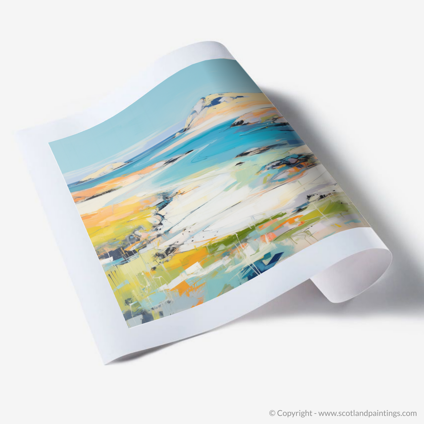 Capturing the essence of Achmelvich Bay's vibrant summer hues, this exquisite print melds cerulean blues, sandy oranges, and crisp whites to evoke the sense of a sun-kissed Scottish coastline. Broad, confident brushstrokes convey movement, as if the gentle breeze of a summer's day could be felt sweeping across the bay, while the interplay of light and shadow brings depth to the undulating sand dunes and distant rolling hills.