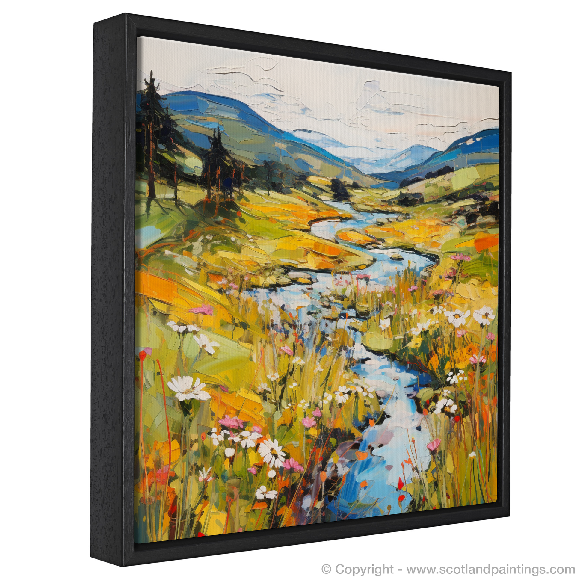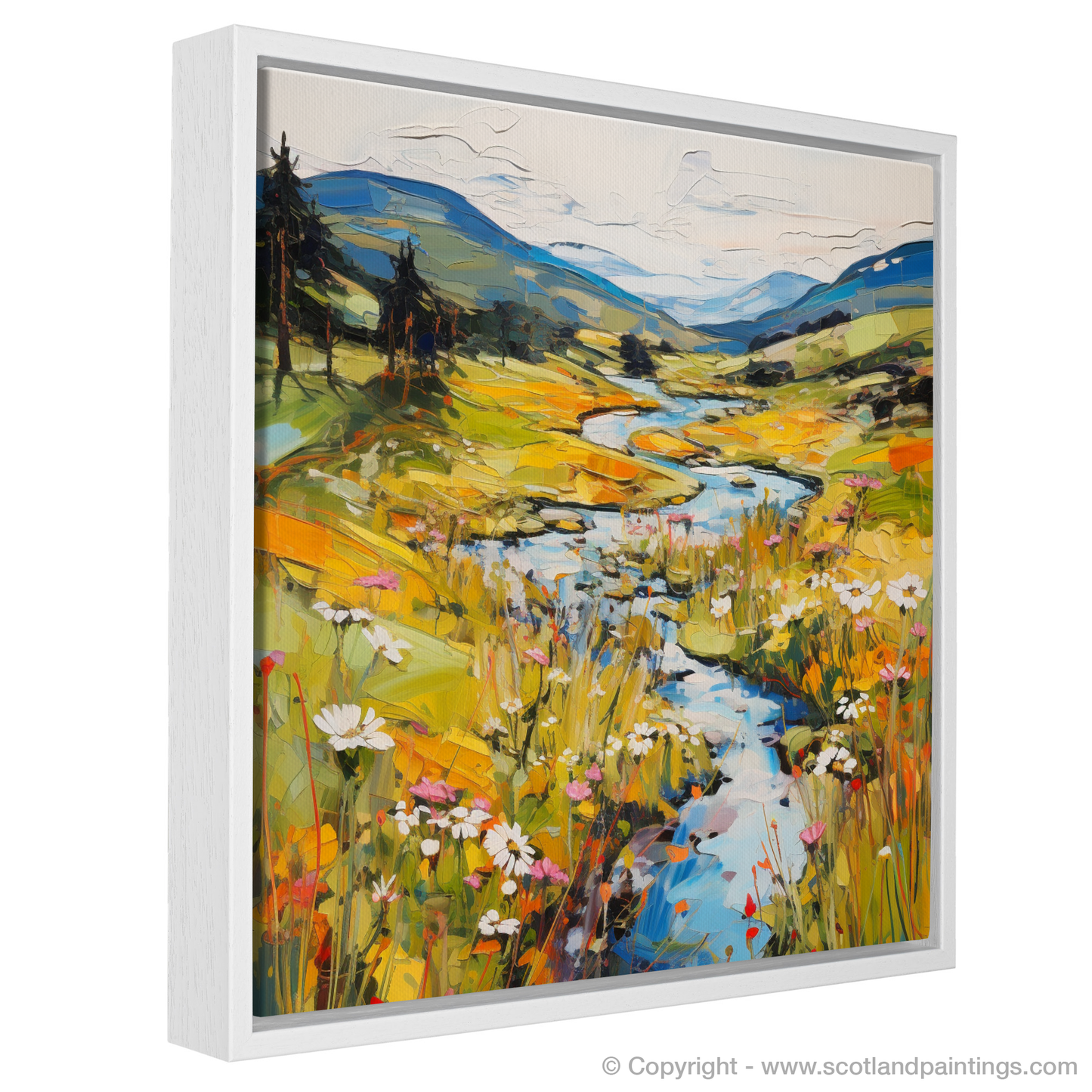 The foreground is a riot of floral splendour, with delicate wildflowers in hues of white, pink, and orange dotting the rich tapestry of verdure. Each brushstroke brings to life the wild grasses and blooms that sway in the summer breeze, their details bold and yet impressionistic, contributing to the overall sense of a living, breathing landscape.
