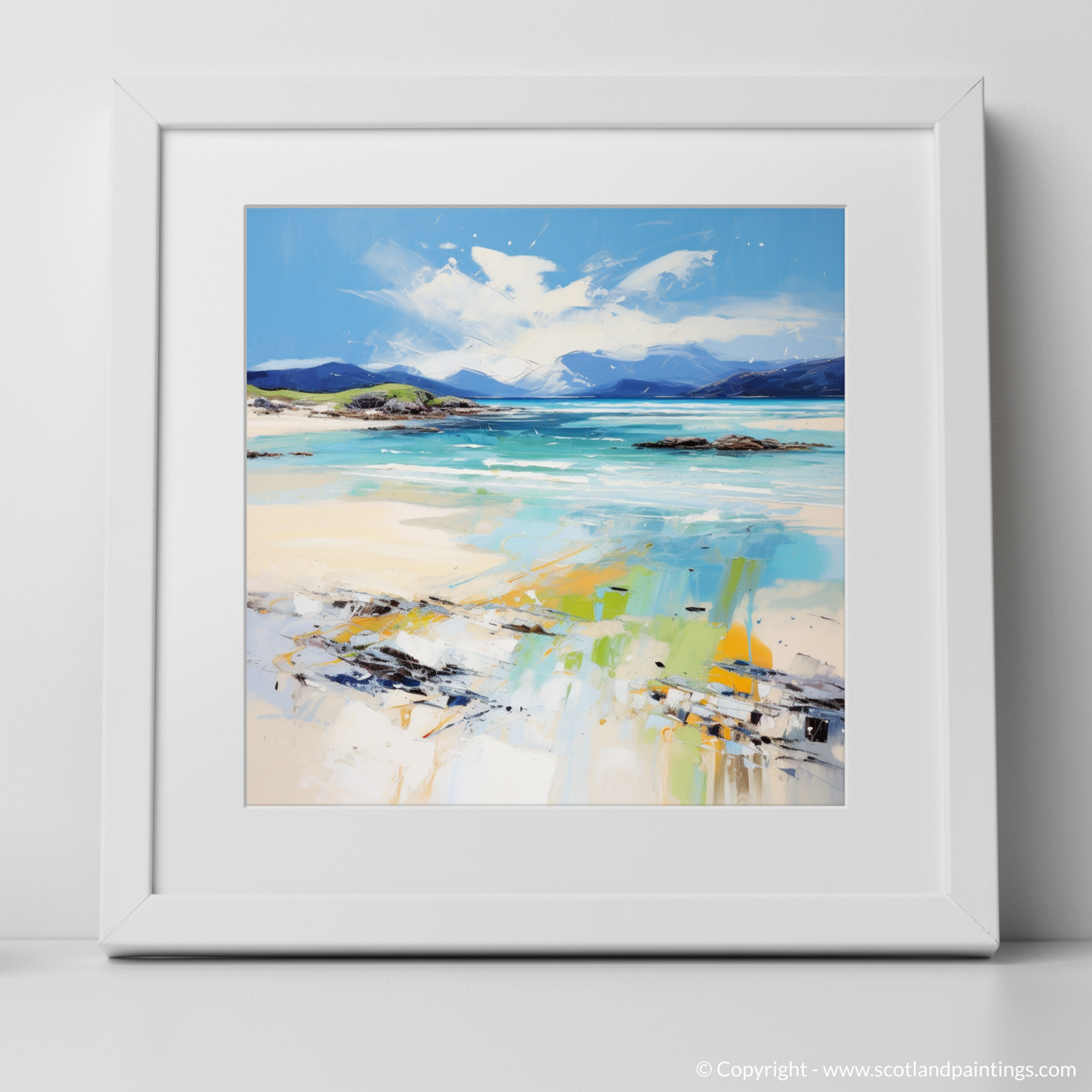 This exquisite print captures the essence of Seilebost Beach on the Isle of Harris during the halcyon days of summer, rendered beautifully in an abstract style. The vivid strokes of aquamarine and cerulean evoke the crystal-clear waters of the Hebridean sea, interspersed with soft golden and creamy hues that represent the sun-kissed sands of this stunning beach.