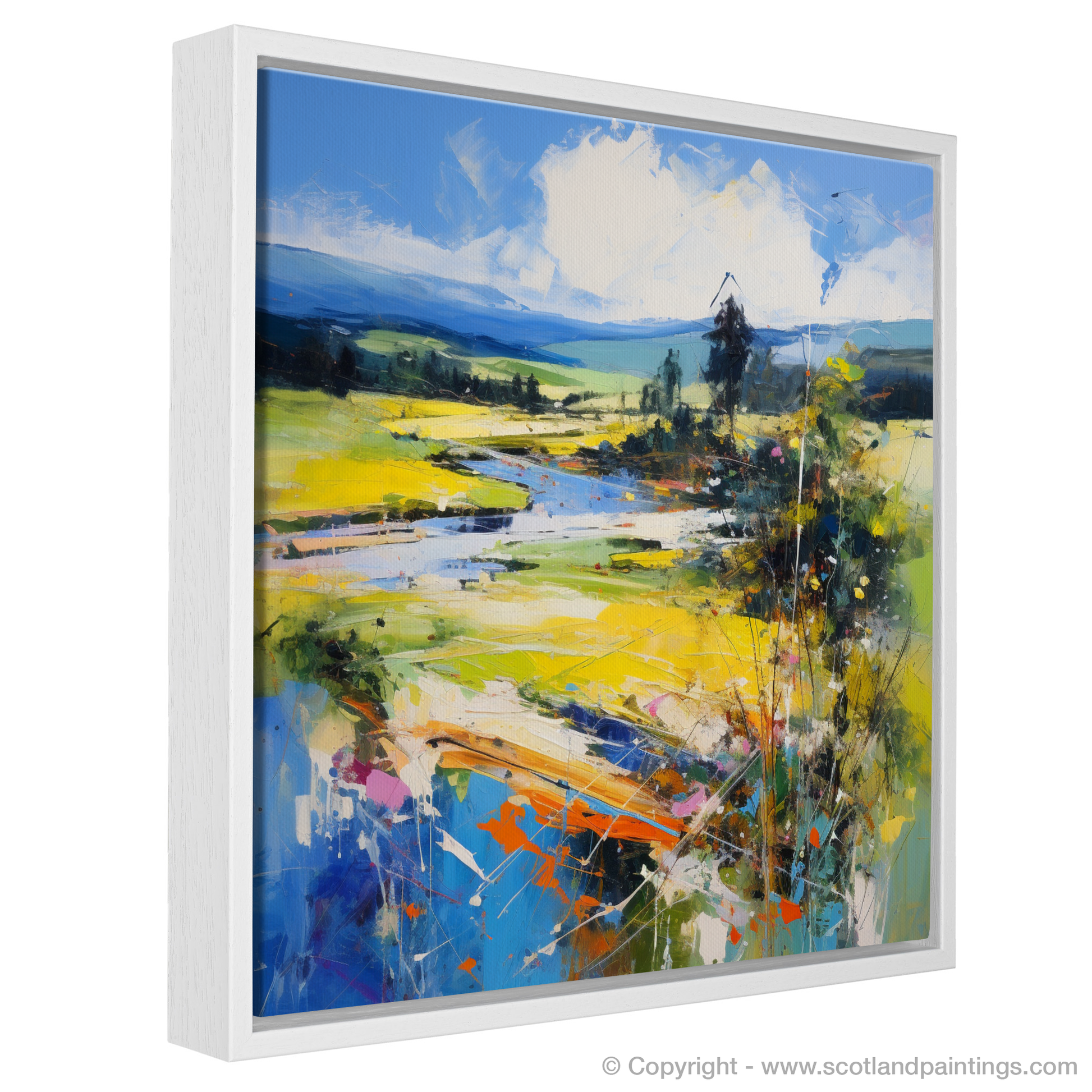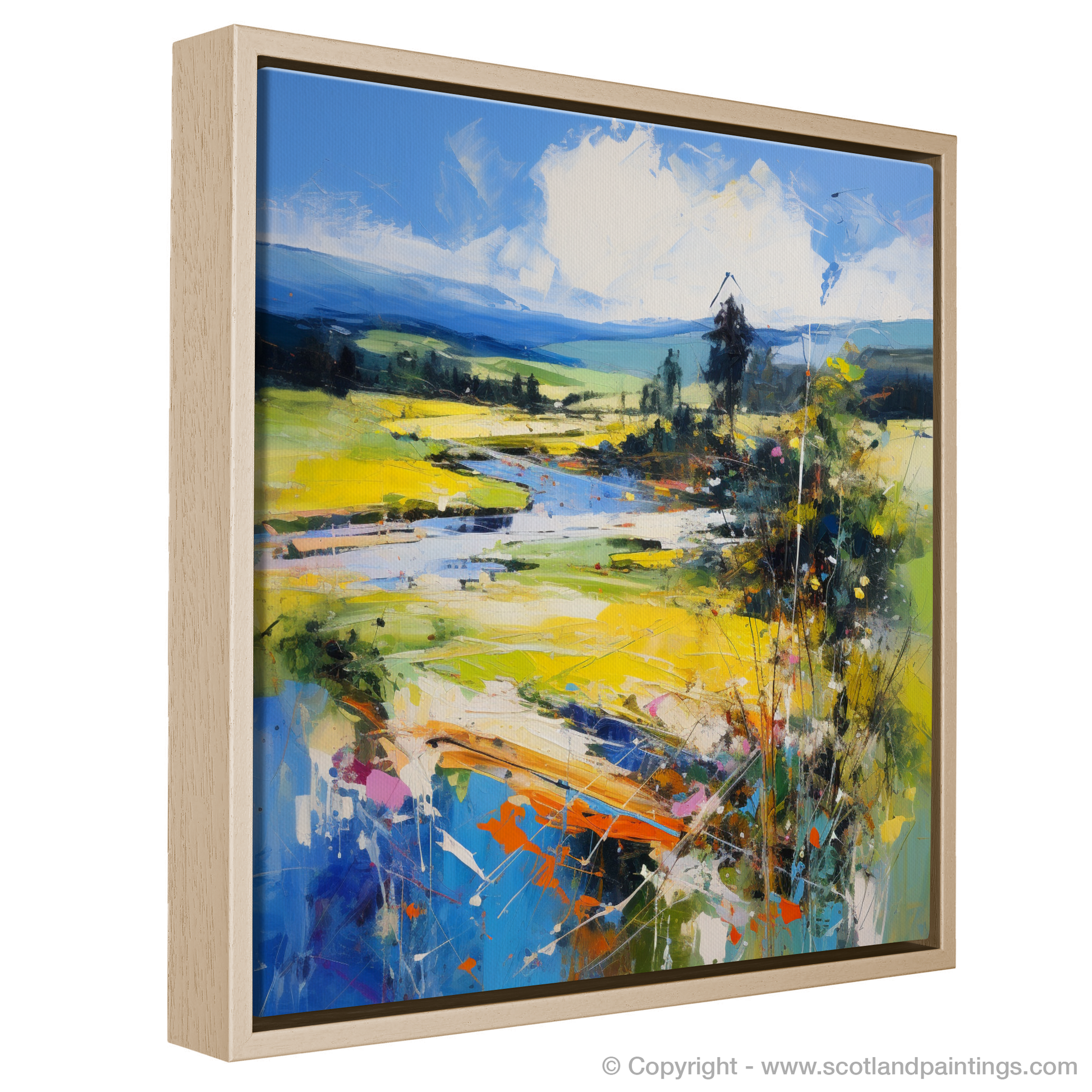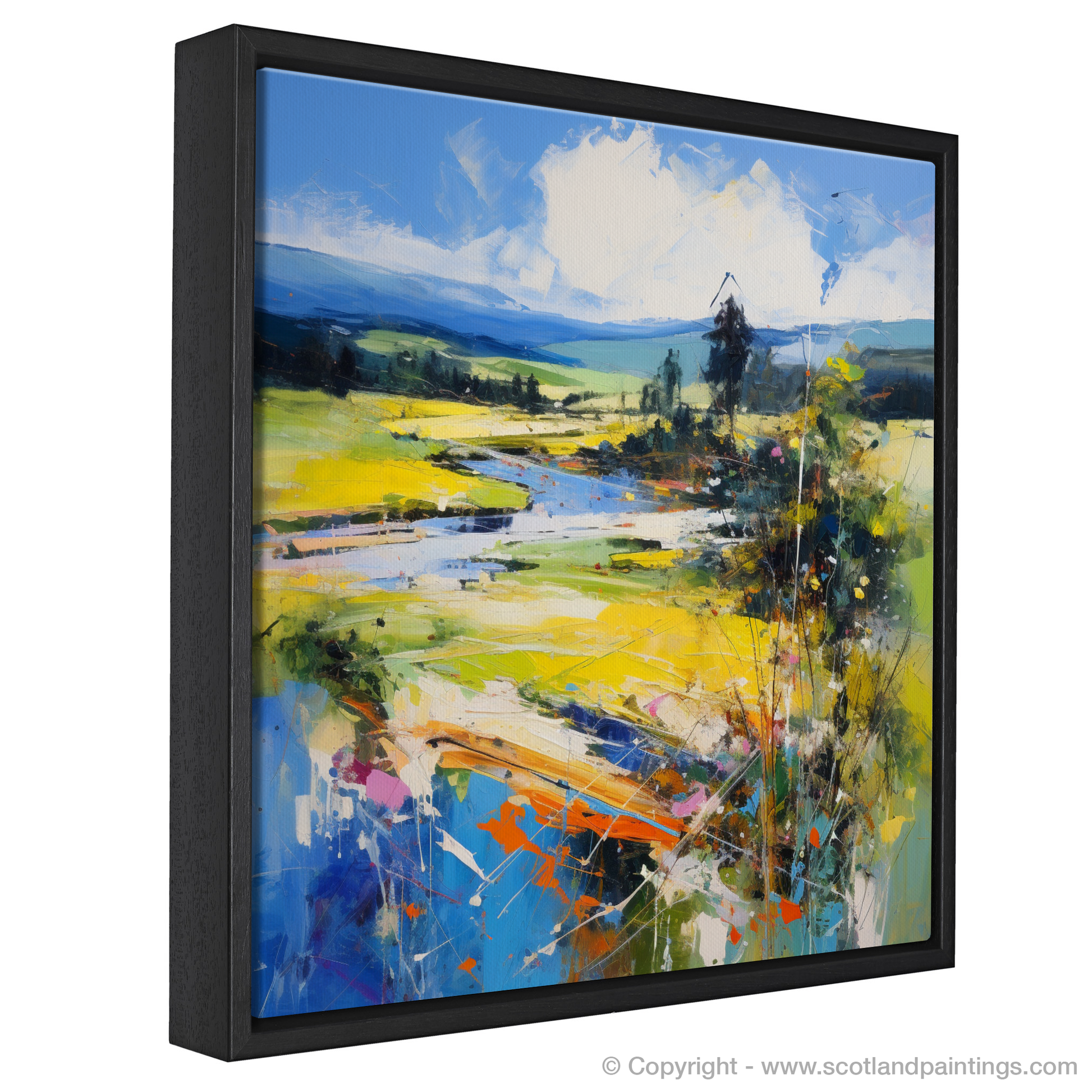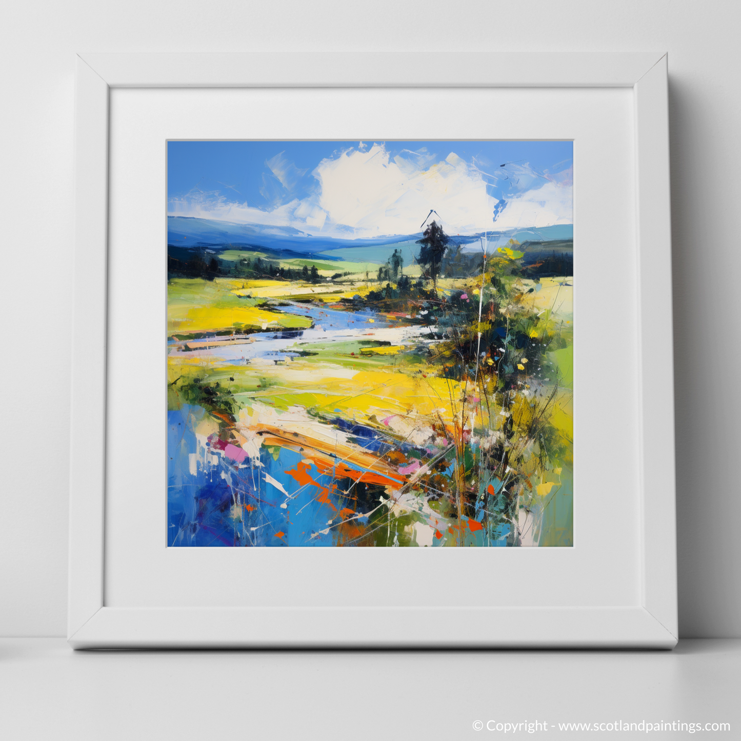 Capture the essence of Glendevon in Perth and Kinross during the height of summer with this evocative abstract print, a part of our 'Scotland in Summer' collection. The energetic strokes and vibrant palette suggest a landscape alive with the season's vitality. Bursts of azure and hints of verdant green reflect the dynamic Scottish skies and rolling hills, while splashes of golden yellow and warm orange echo the sun-kissed fields.