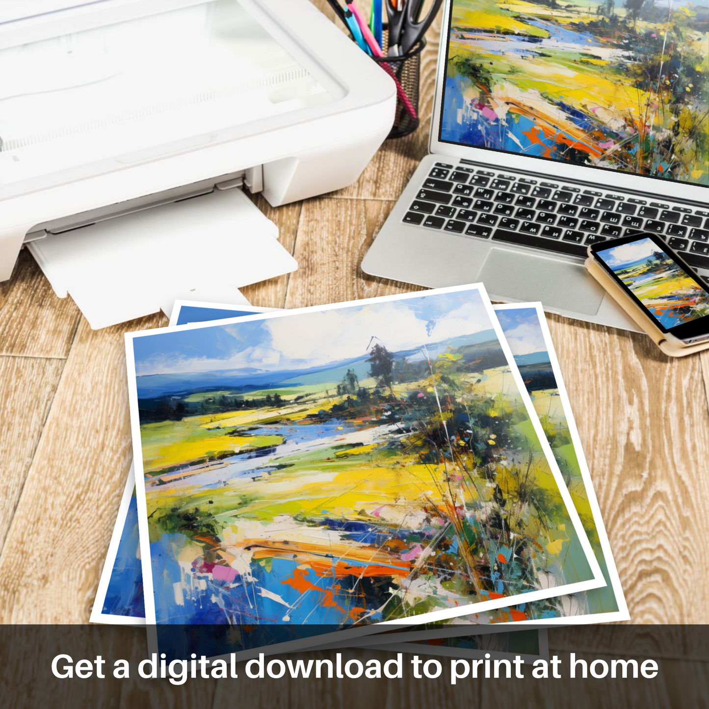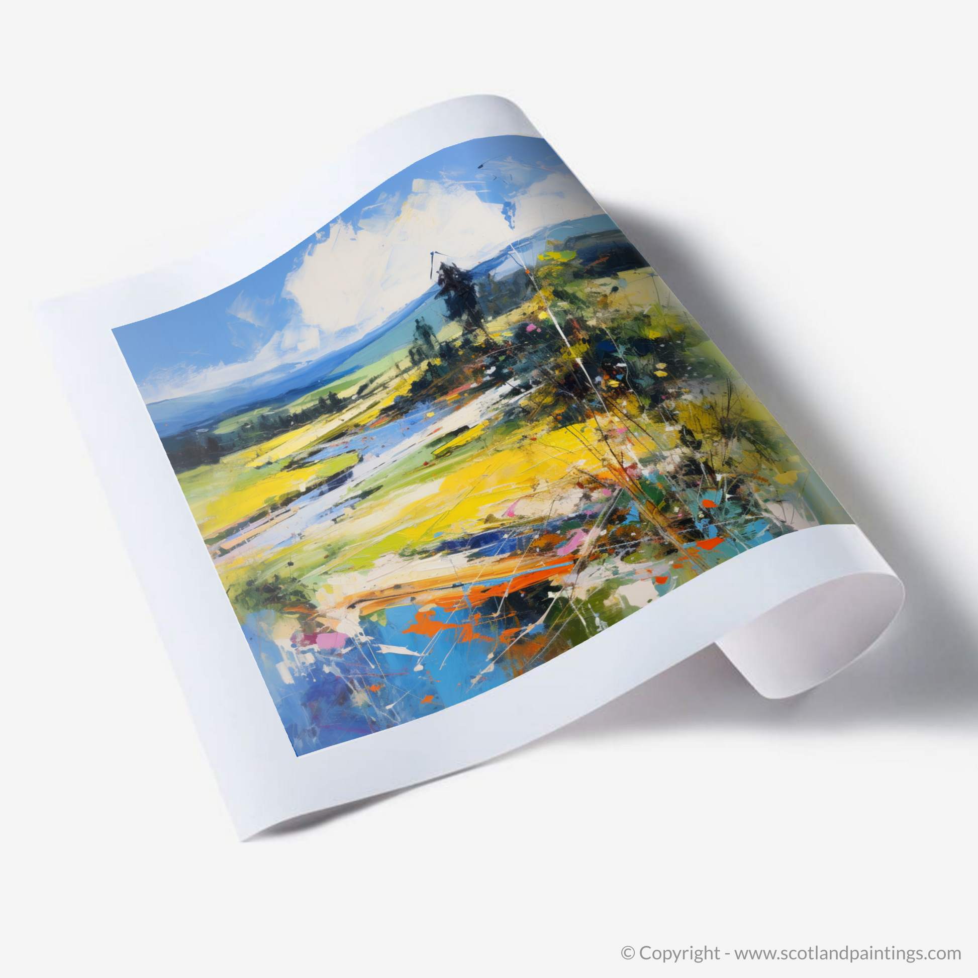 This print would serve as a dazzling centrepiece for any room, bringing with it the allure of Scotland's natural beauty and the freedom of abstract expression. The artwork is a testament to the wild and untamed spirit of Scotland, encapsulated in a print that will continually inspire and captivate the viewer with its bold, interpretative strokes and exhilarating colour scheme.