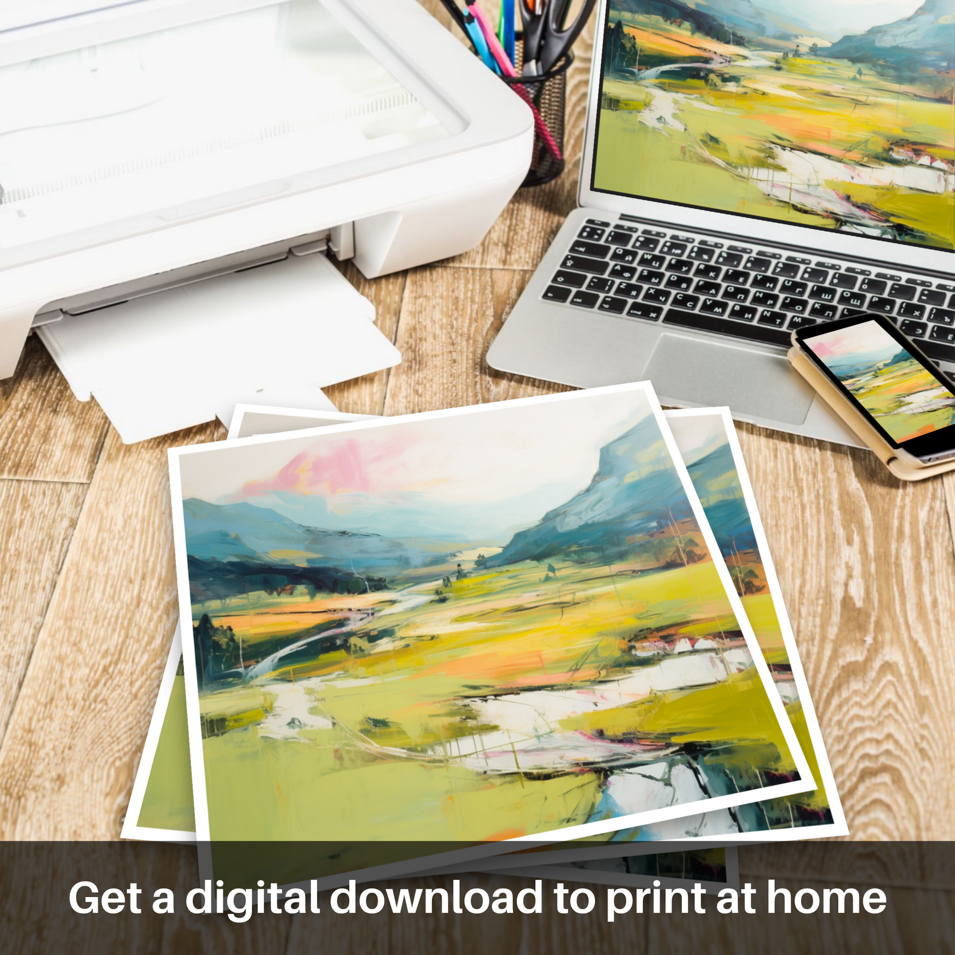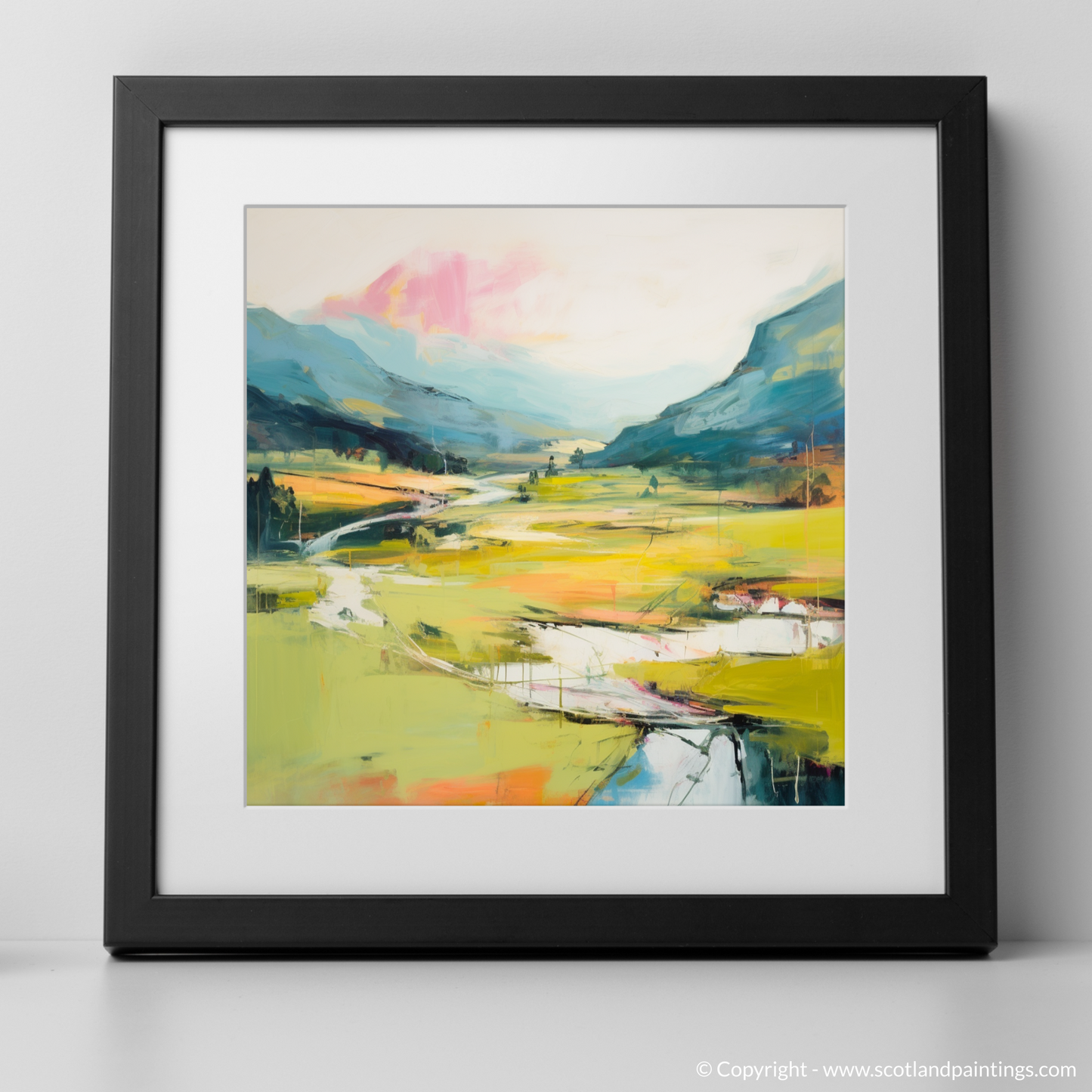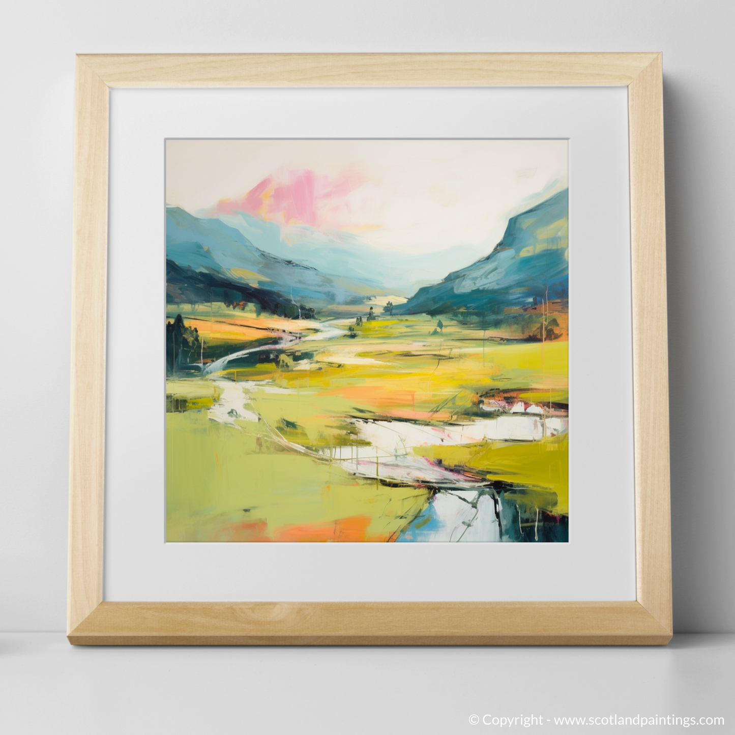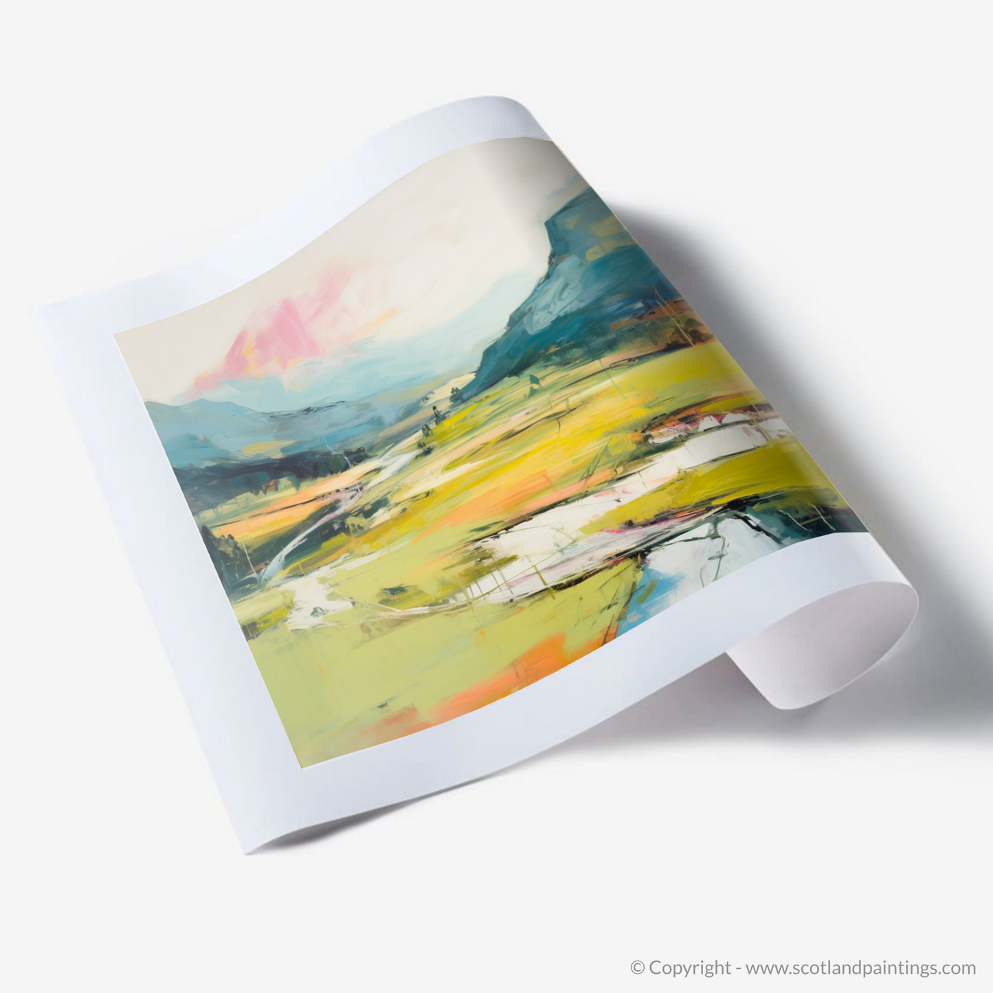 This stirring abstract print offers a contemporary interpretation of the sweeping vistas of Glen Tilt, Perthshire during the halcyon days of summer. The kaleidoscope of colours splashed across the canvas captures the essence of the verdant landscape, as vibrant hues of yellow, green, and hints of pink evoke the warmth and growth of the season.