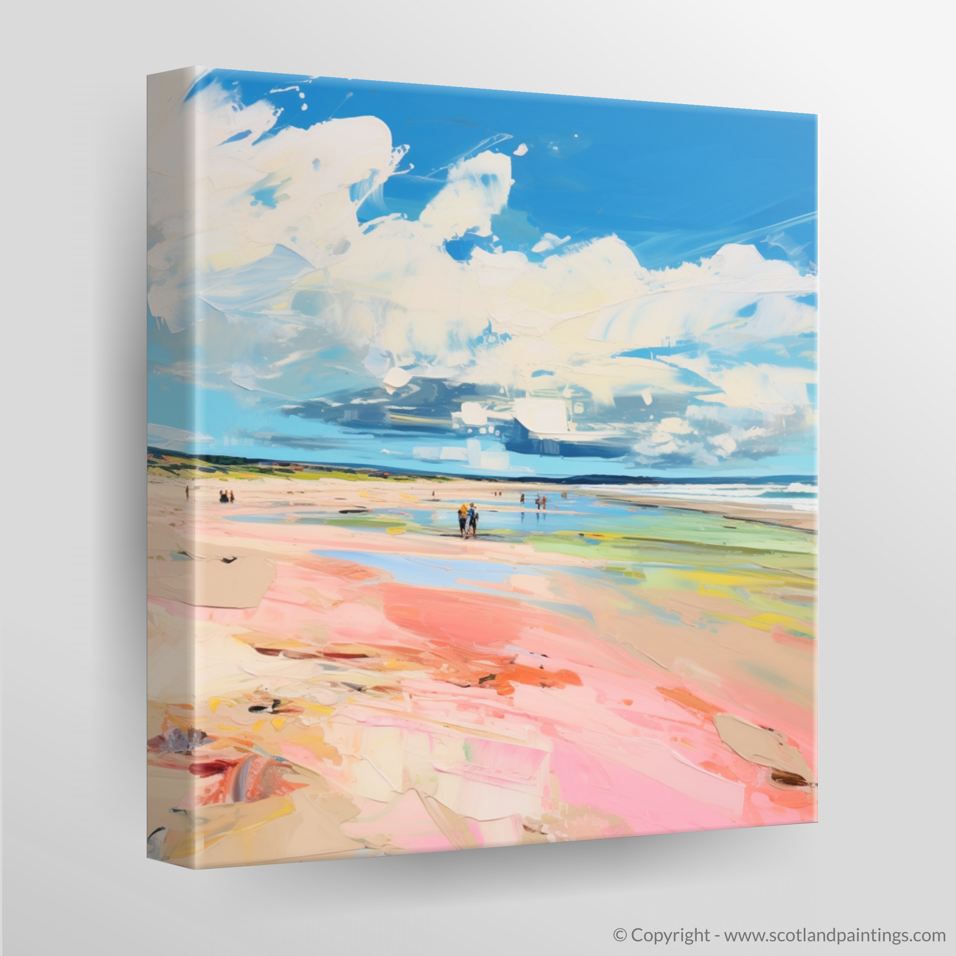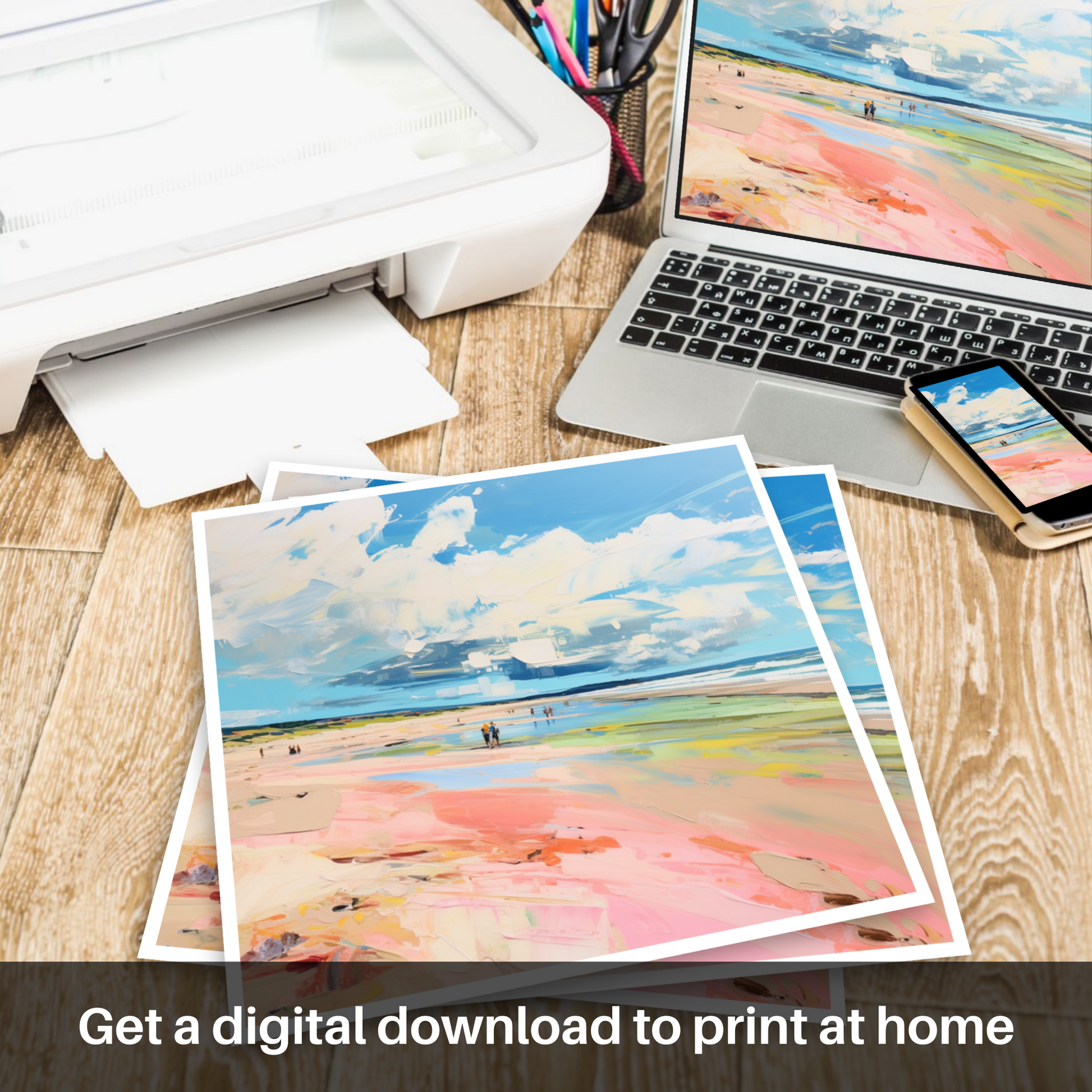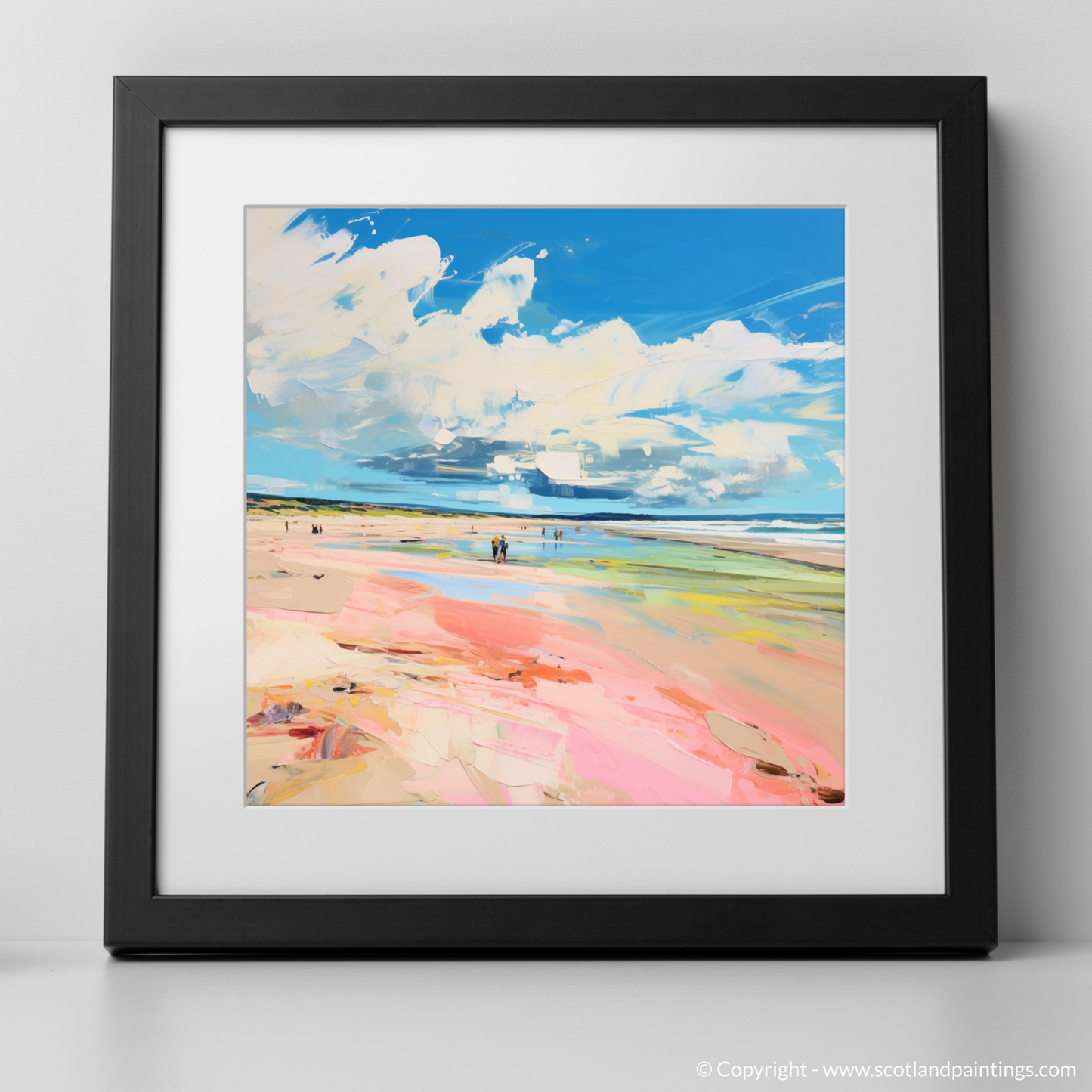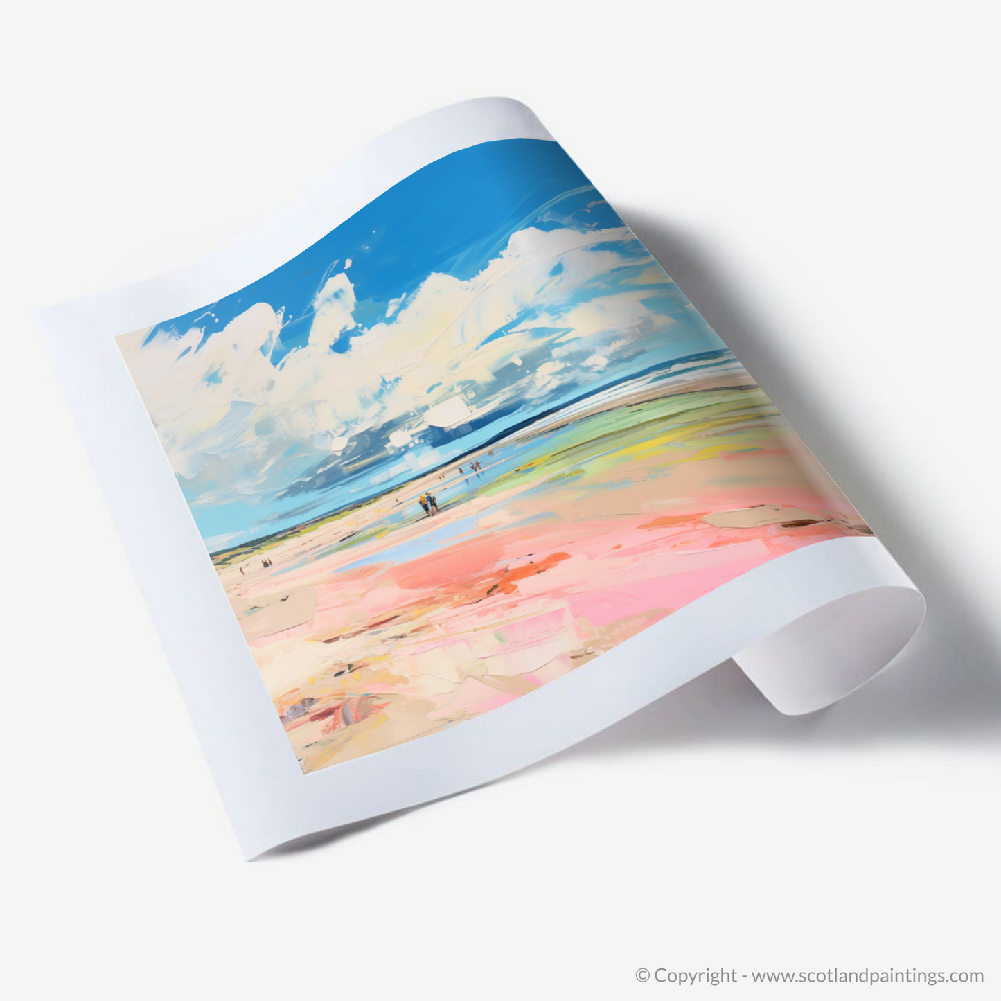 Capturing the quintessence of a Scottish summer, this vibrant print brings to life the tranquil beauty of Longniddry Beach in East Lothian. The artwork, brimming with bold, expressive brushstrokes, embodies a modern style that lends vividness and texture, creating an almost tangible experience. The expansive, azure sky, adorned with an array of dynamic, white clouds, stretches grandly above the serene seascape.
