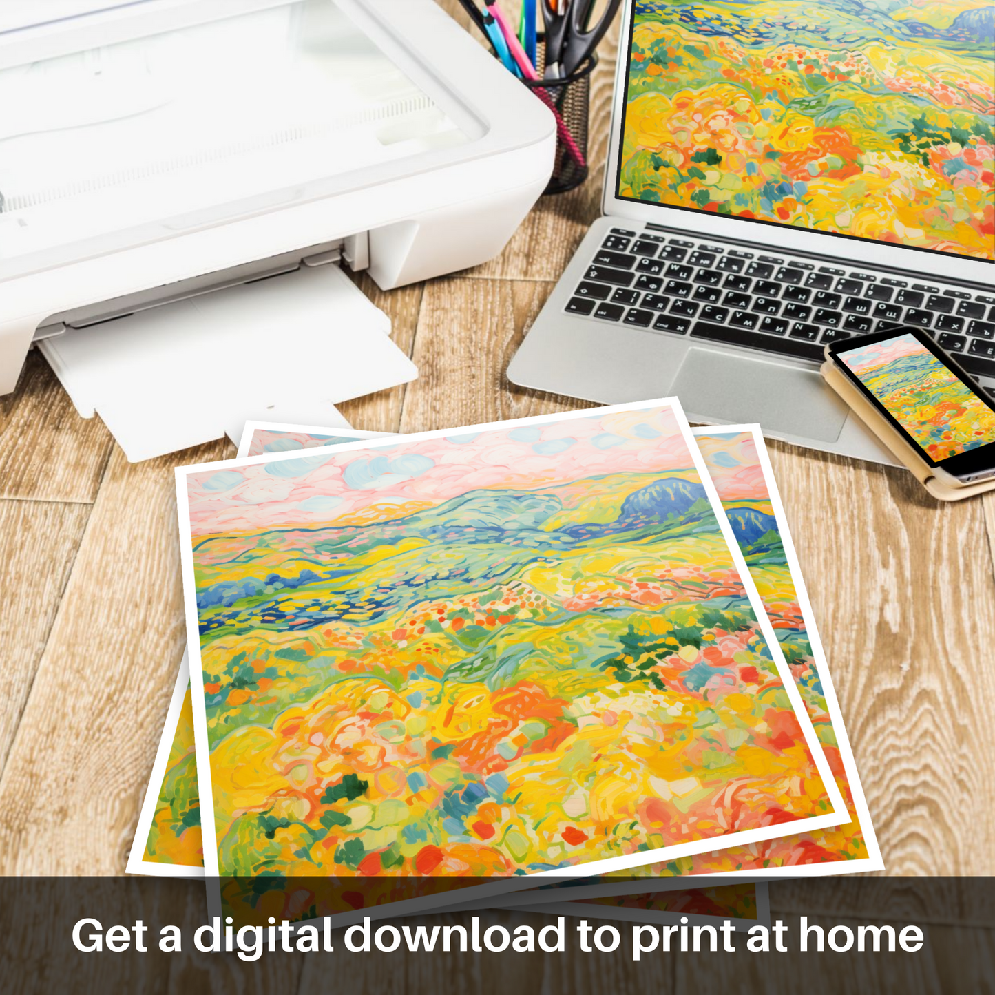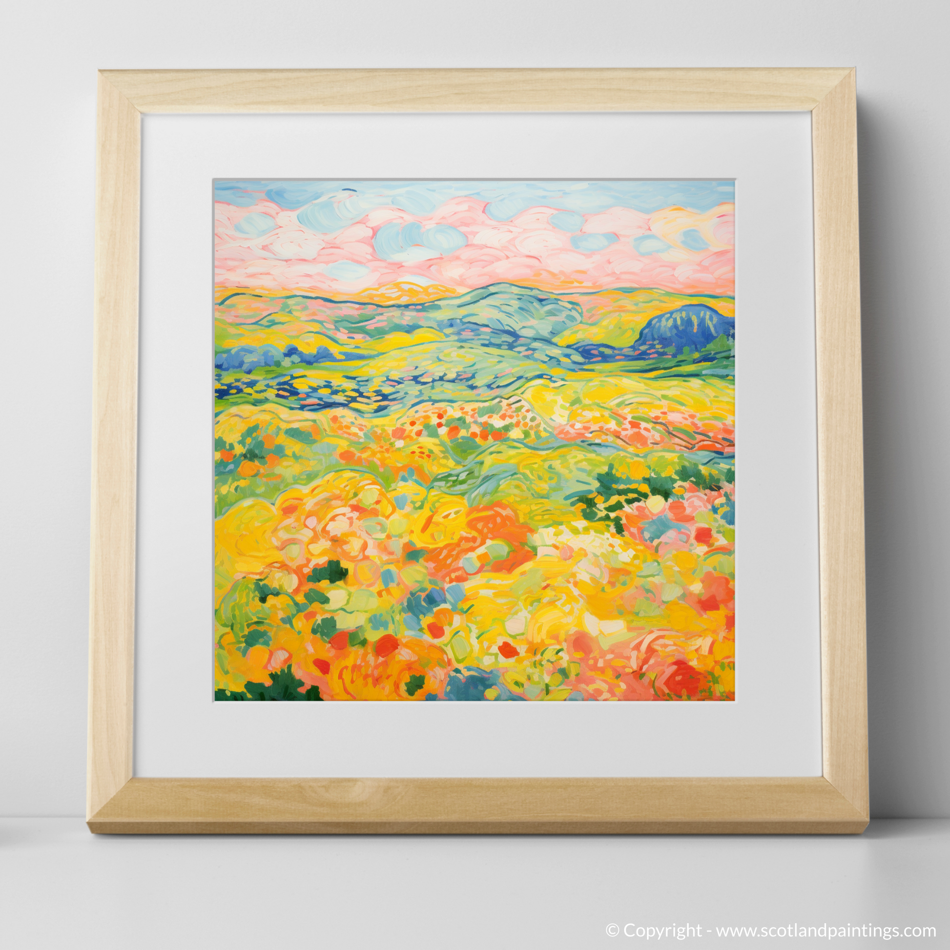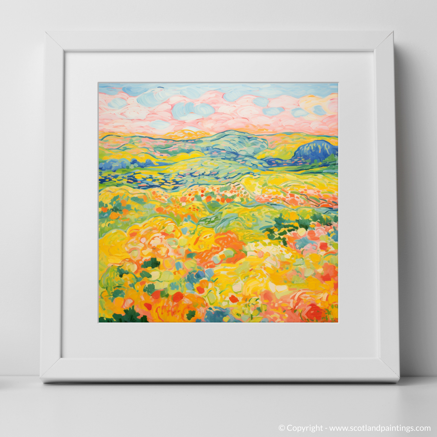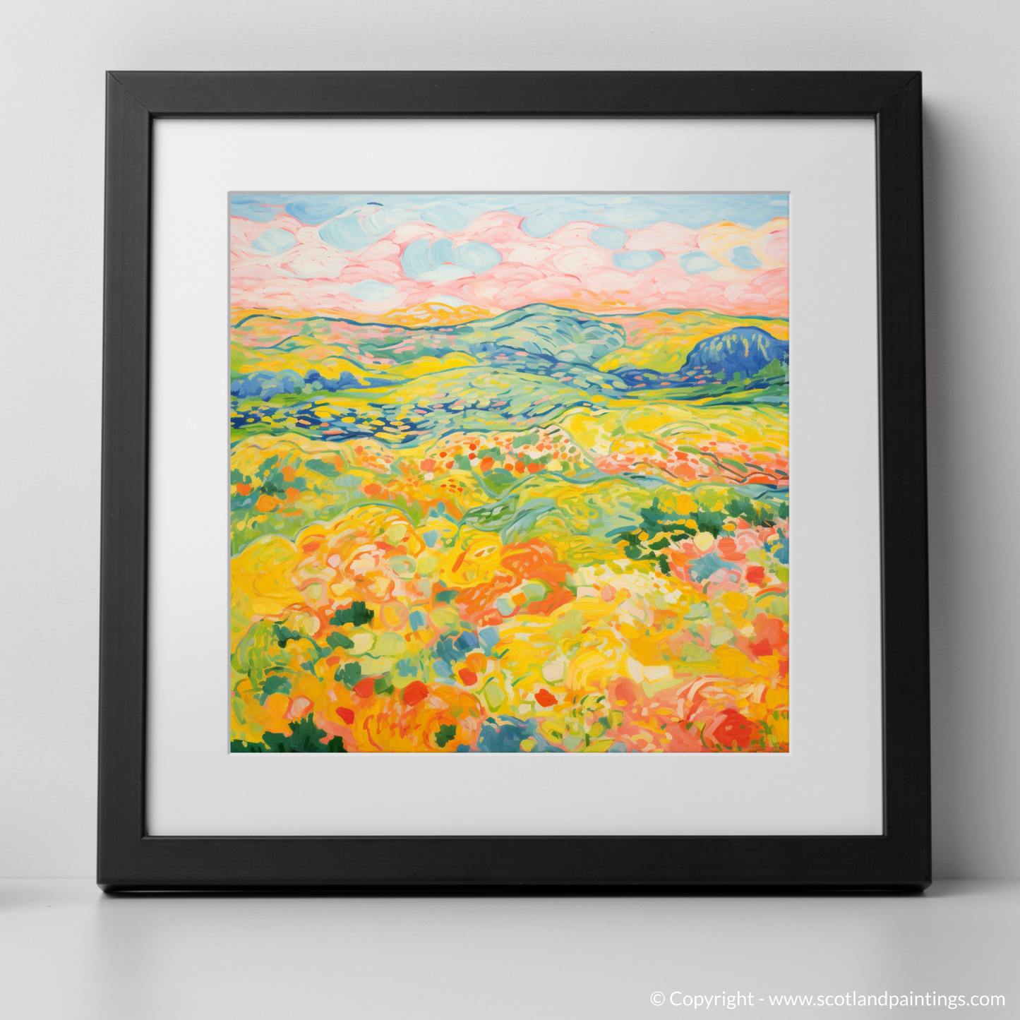 This vibrant abstract print captures the essence of summer in Glenesk, Angus, through a symphony of bold and exuberant brushstrokes that elegantly dance across the canvas. Bursting with a rich palette that ranges from warm yellows, fiery oranges to verdant greens, the work conjures up the fertile landscapes that characterise the season. Each hue is applied with a deliberate energy, creating a tactile and dynamic surface that invites viewers to explore the rolling hills and valleys of the region.
