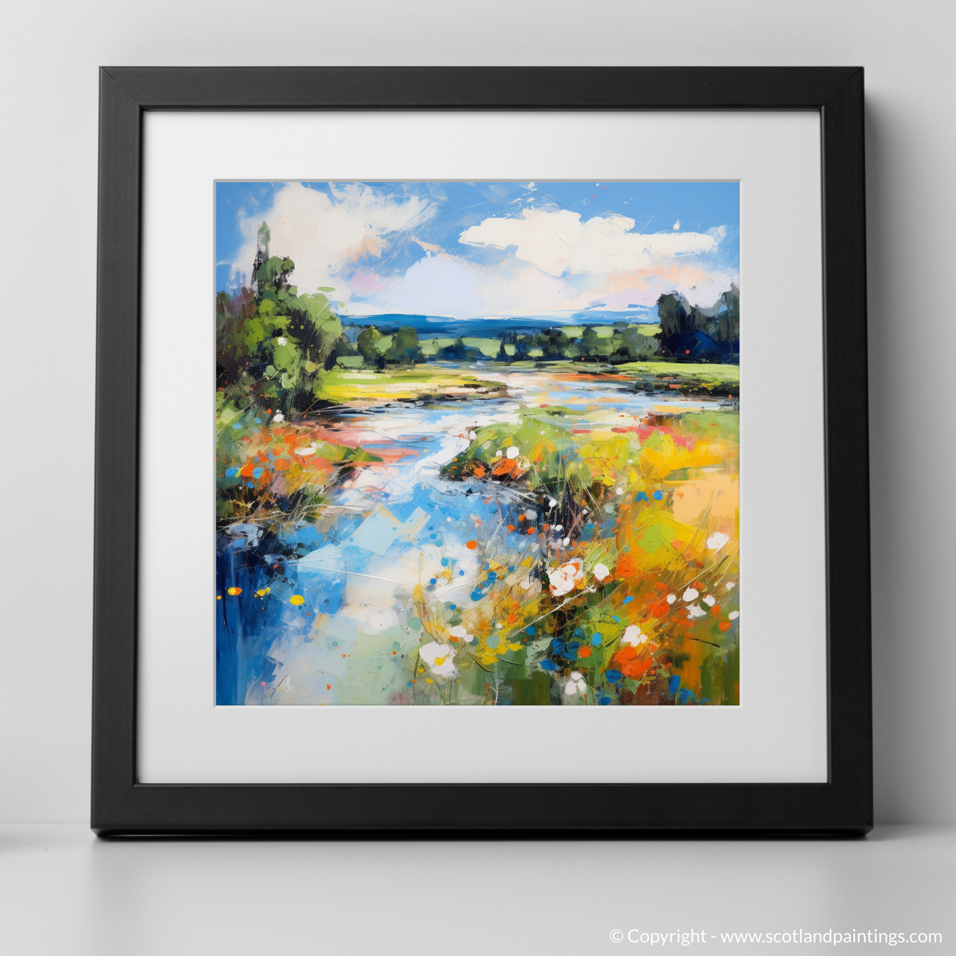 Captivating and vibrant, this print offers an abstract interpretation of the tranquil River Lyon as it meanders through the lush landscape of Perthshire during the height of summer. The artwork is an explosion of colour, where bold, impasto strokes of azure and cobalt depict the flowing water, contrasted against the fiery orange and soft amber of the flourishing wildflowers and grasses that adorn the riverbanks.