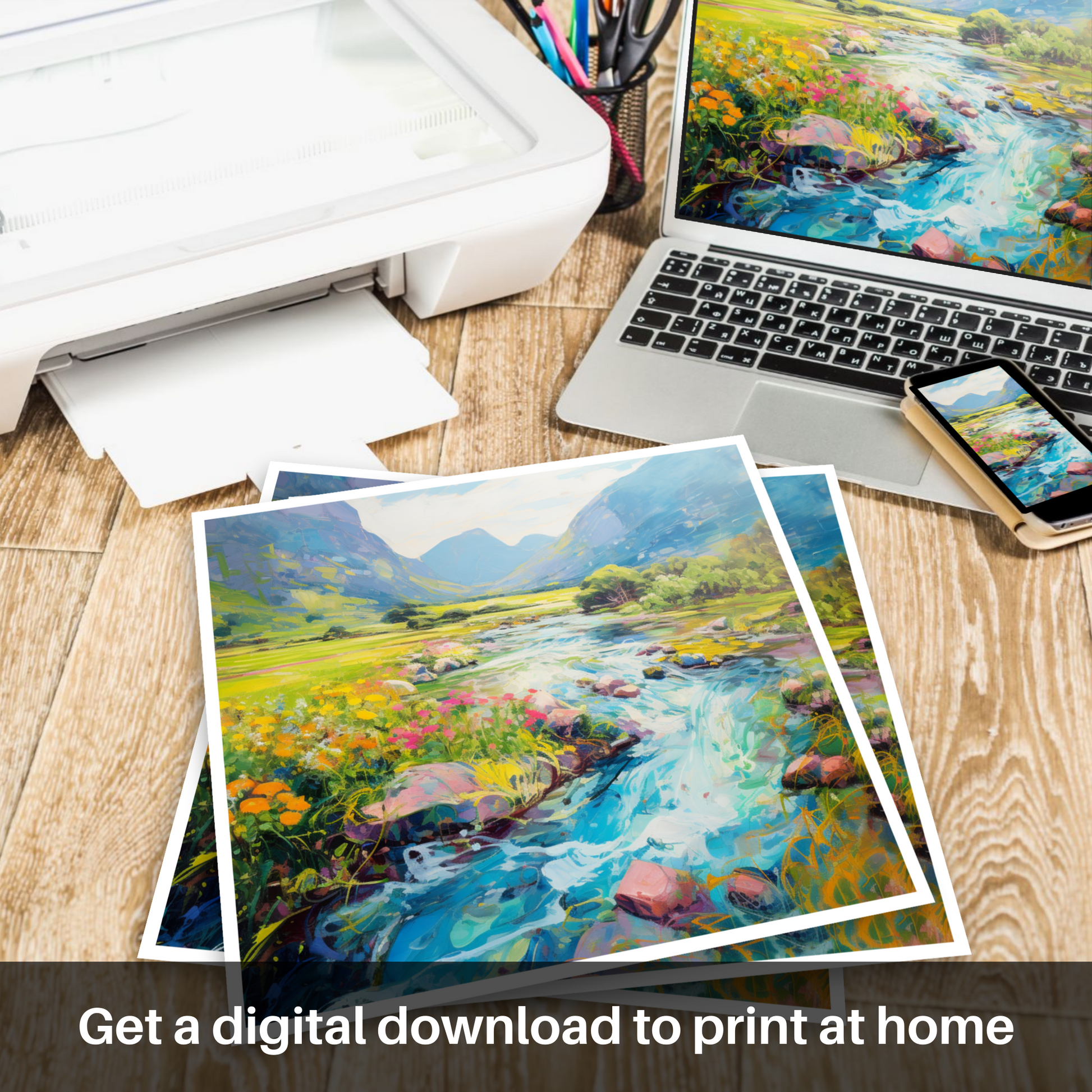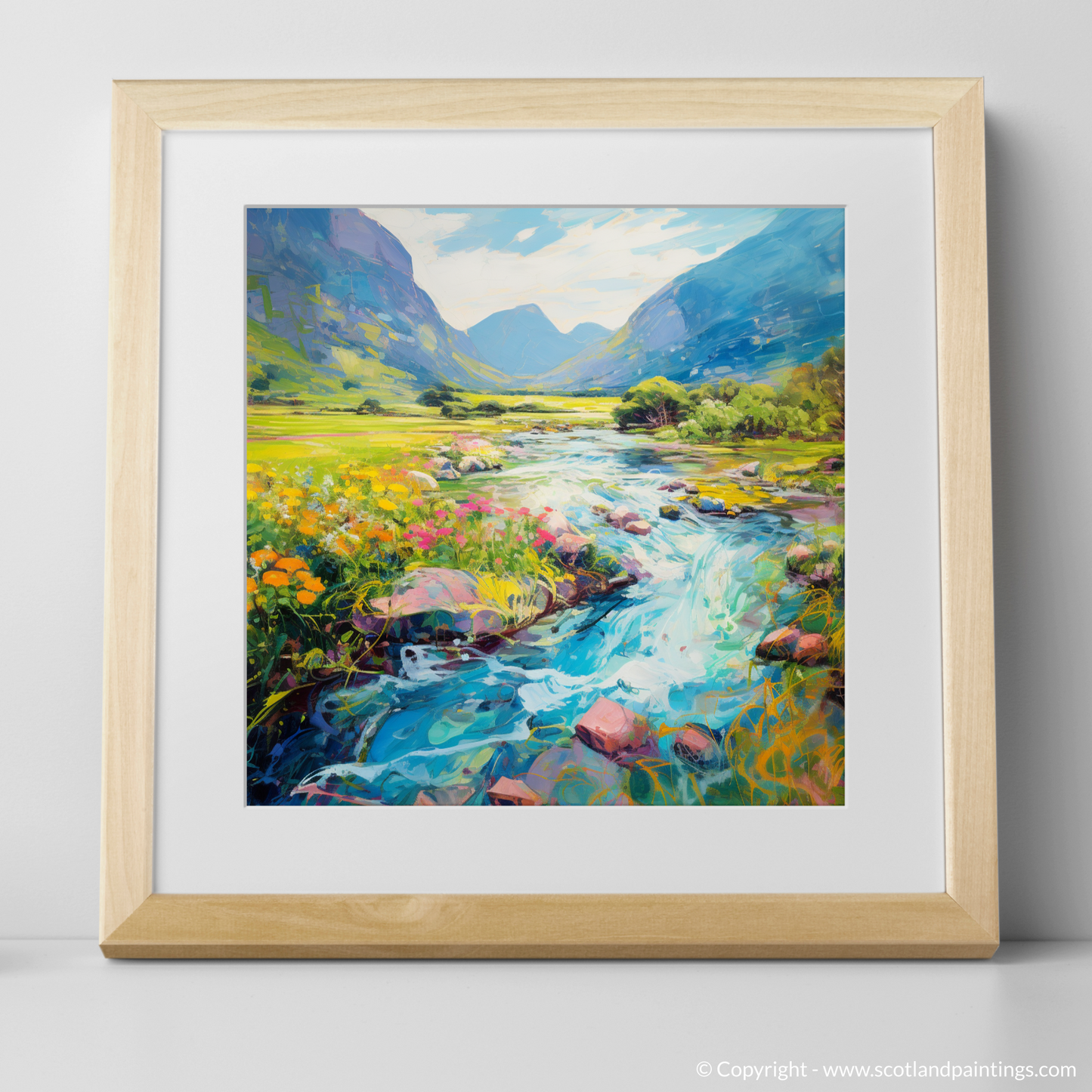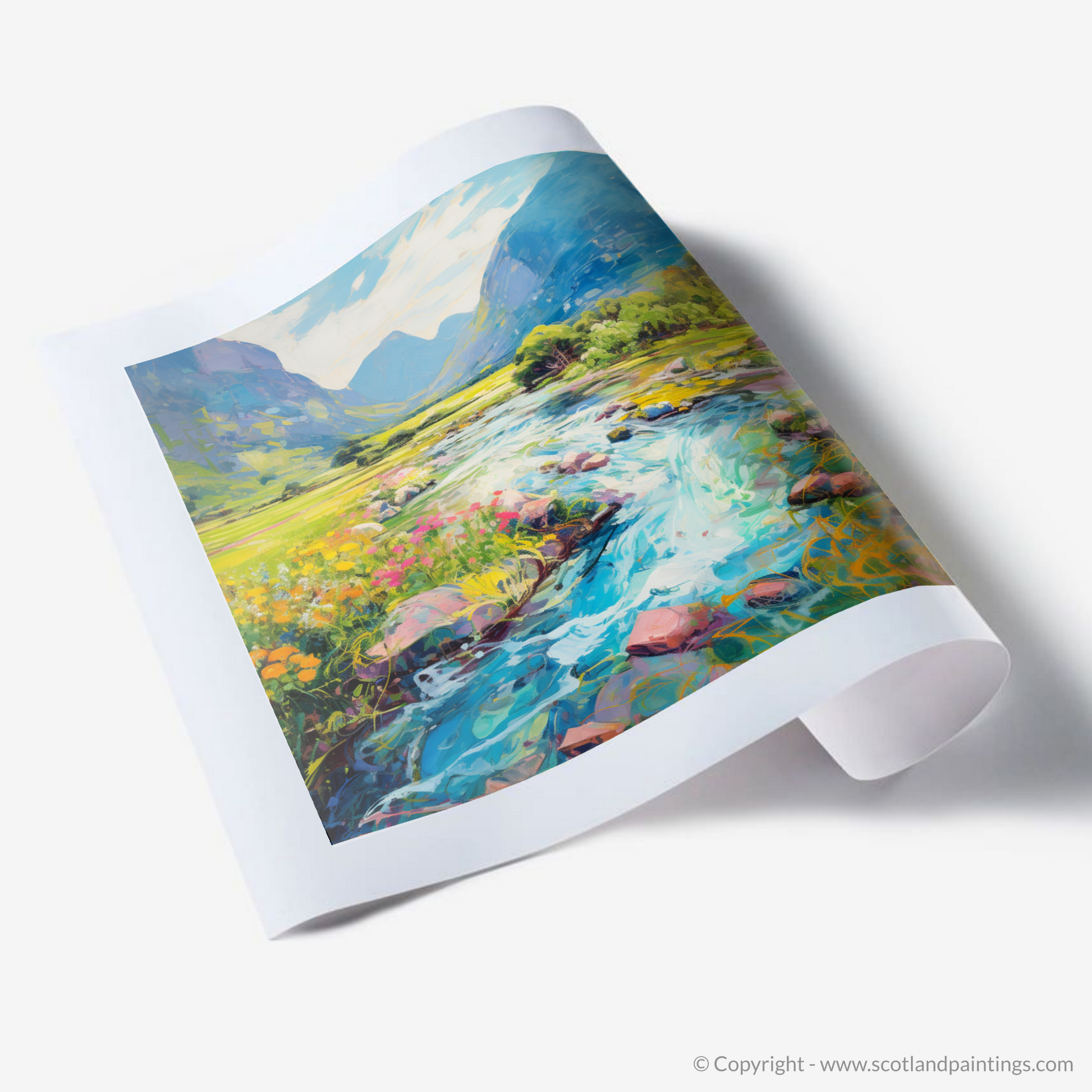 Capturing the essence of a serene Scottish summer, this charming print brings to life the lush vibrancy of Glencoe's landscapes. The artwork is a symphony of colour, with the verdant greens of the hillsides harmonising with the rich blues and turquoises of the winding river. Glimpses of sunlight dance off the water, creating a sense of movement that energises the scene.