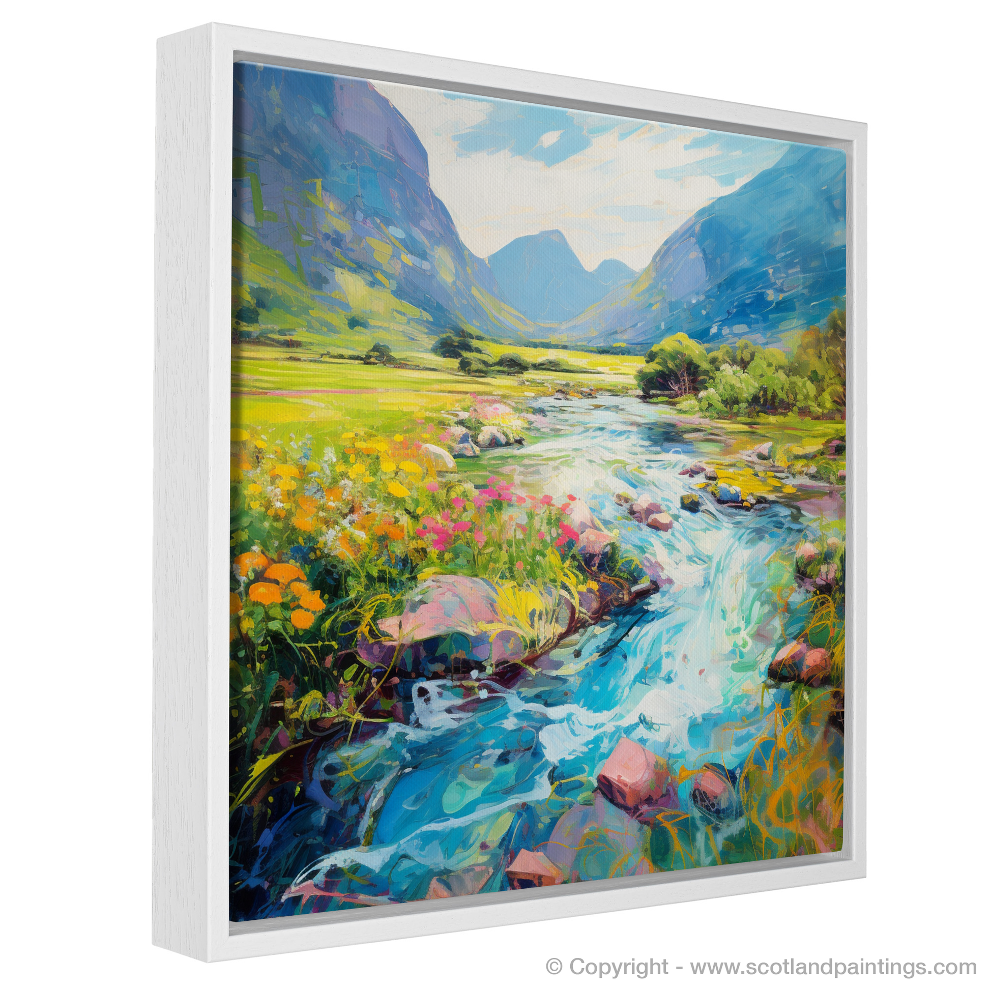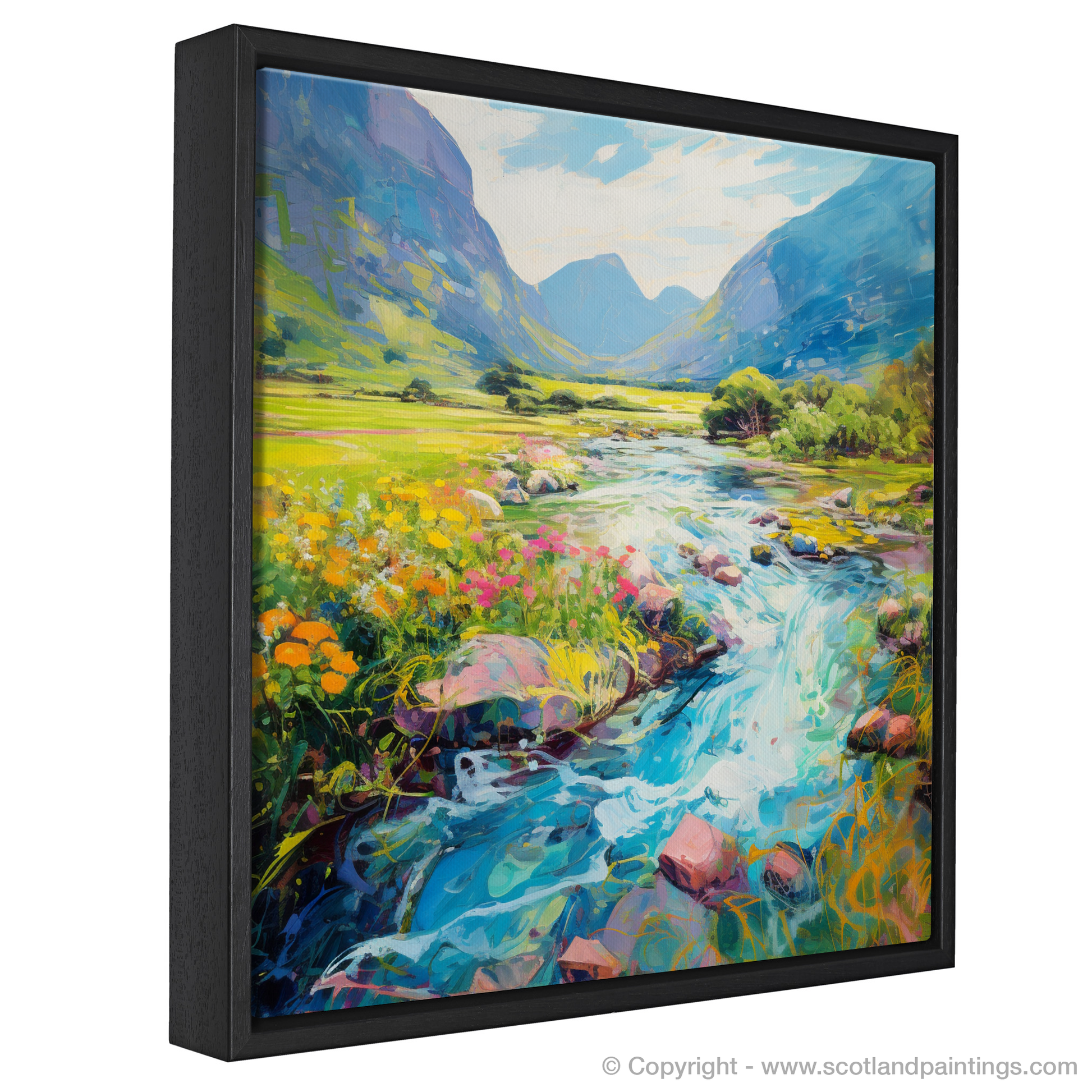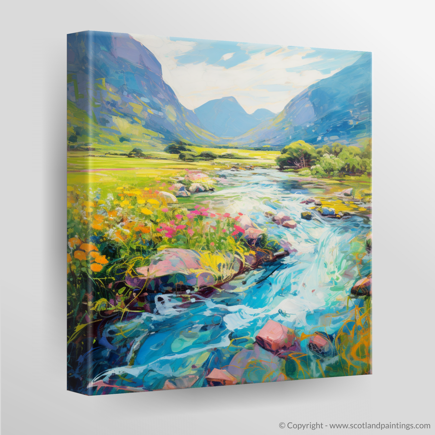 Capturing the essence of a serene Scottish summer, this charming print brings to life the lush vibrancy of Glencoe's landscapes. The artwork is a symphony of colour, with the verdant greens of the hillsides harmonising with the rich blues and turquoises of the winding river. Glimpses of sunlight dance off the water, creating a sense of movement that energises the scene.
