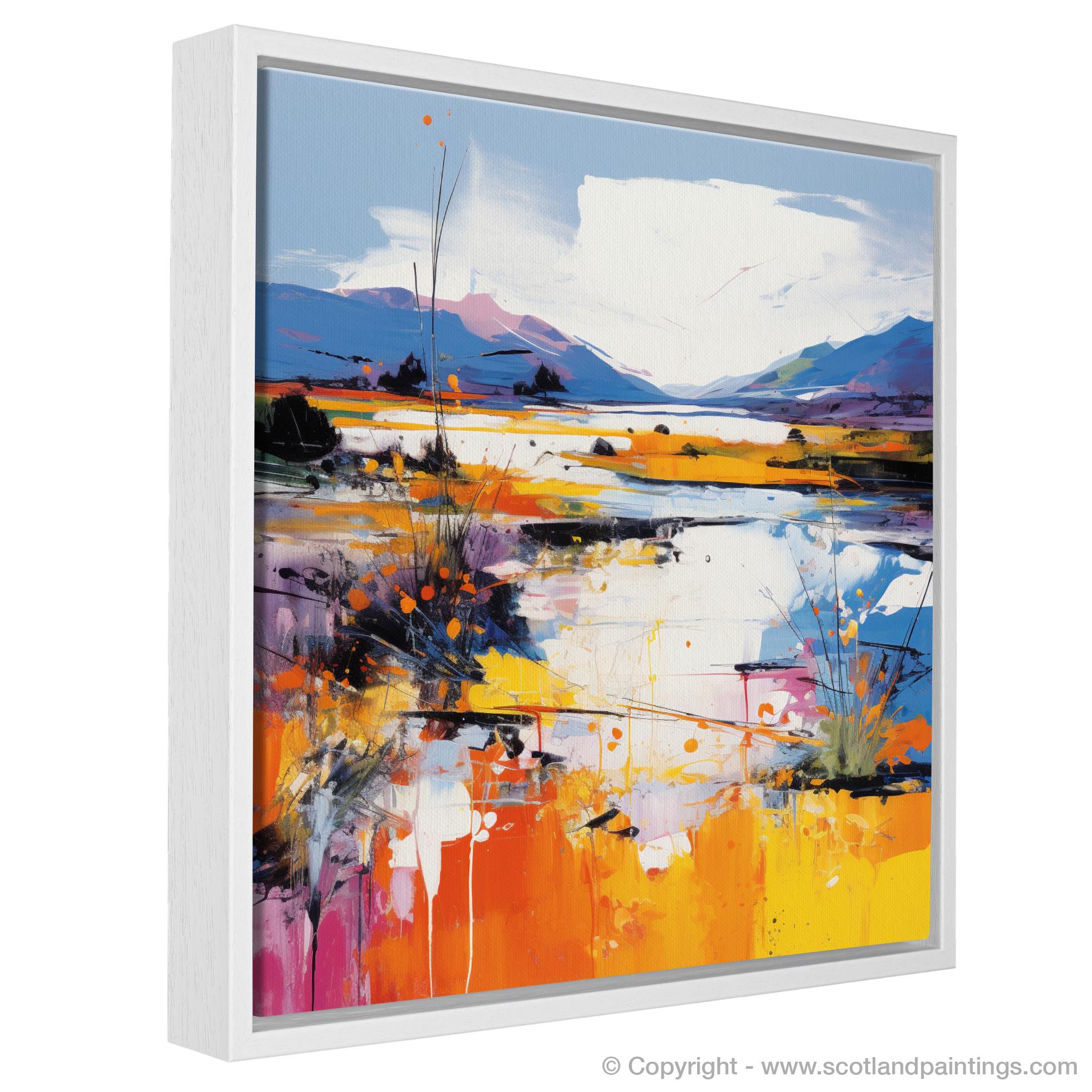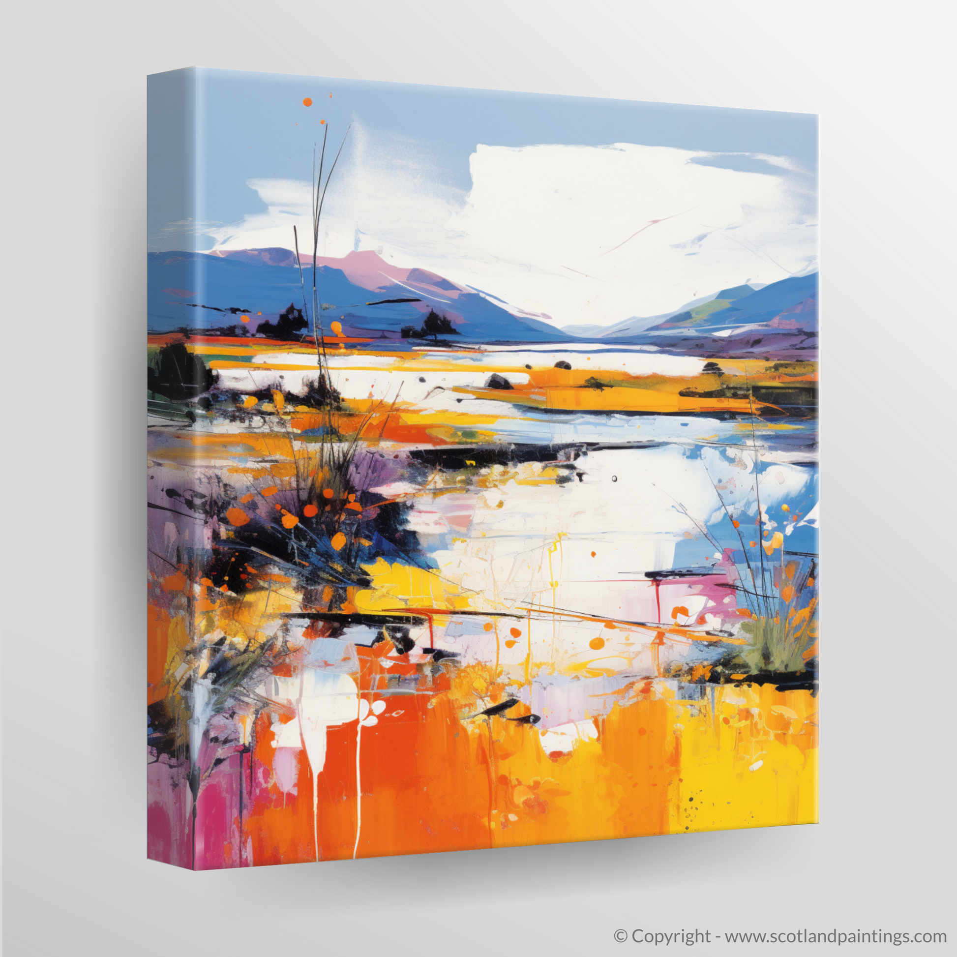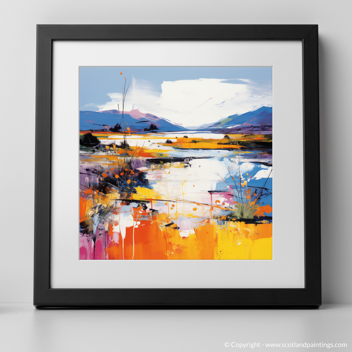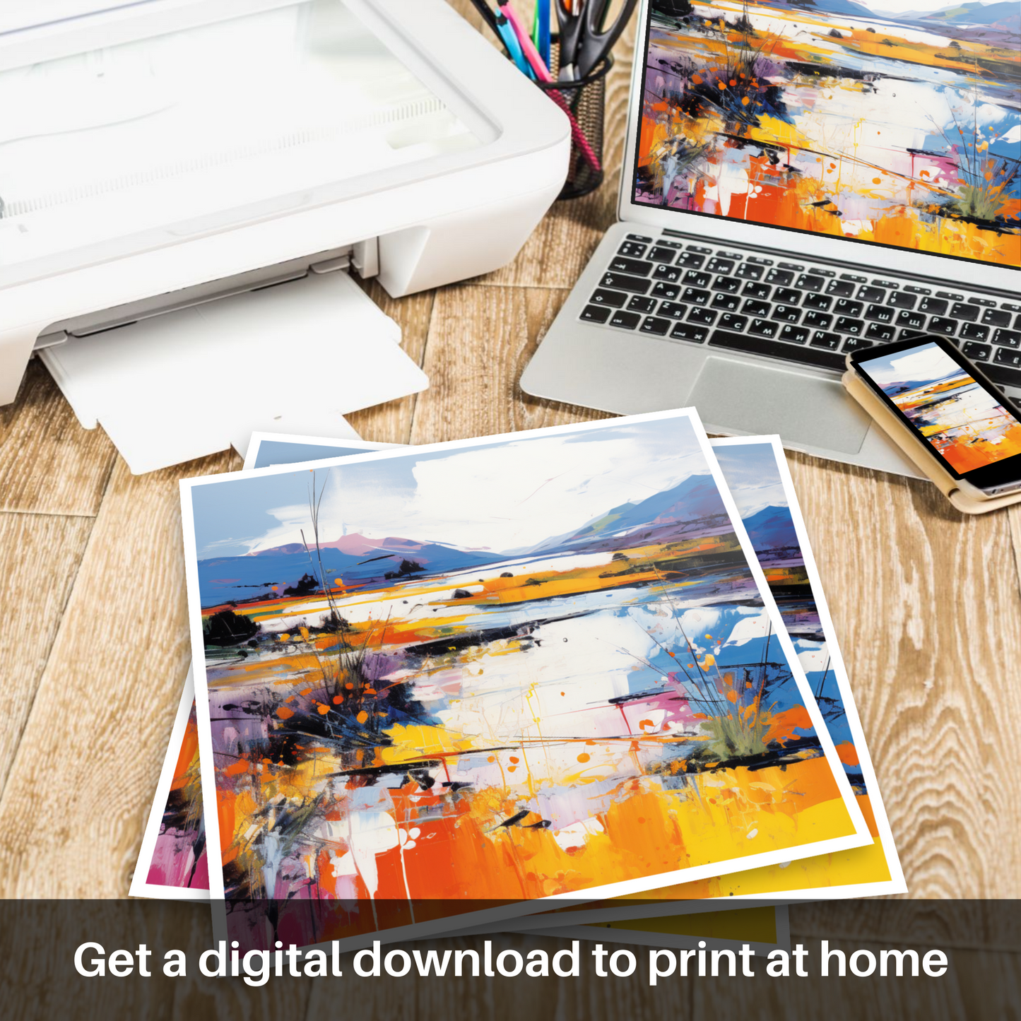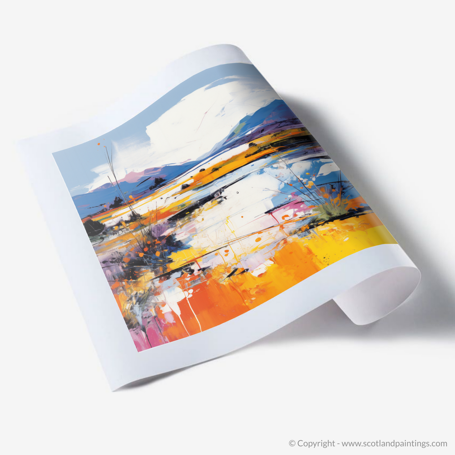 Capturing the essence of a Scottish summer by Loch Doon, this captivating abstract print invites a vibrant interpretation of Ayrshire's serene landscapes. Bold strokes and a lively palette convey the warmth of summer through a dynamic fusion of crimson, tangerine, and sunny yellows, juxtaposed against cool splashes of azure and muted lavenders, reminiscent of clear skies and gentle waters. The canvas is a visual celebration of the season, where sporadic flecks of white add a sense of movement, evoking the gentle breeze over the loch and meadows. An array of expressive lines and colour blocks creates a rhythmic composition that symbolises the vitality of the natural environment during the peak of summertime. This piece is a striking addition for collectors and enthusiasts alike who wish to bring the abstract beauty of Scotland's summertime into their space.