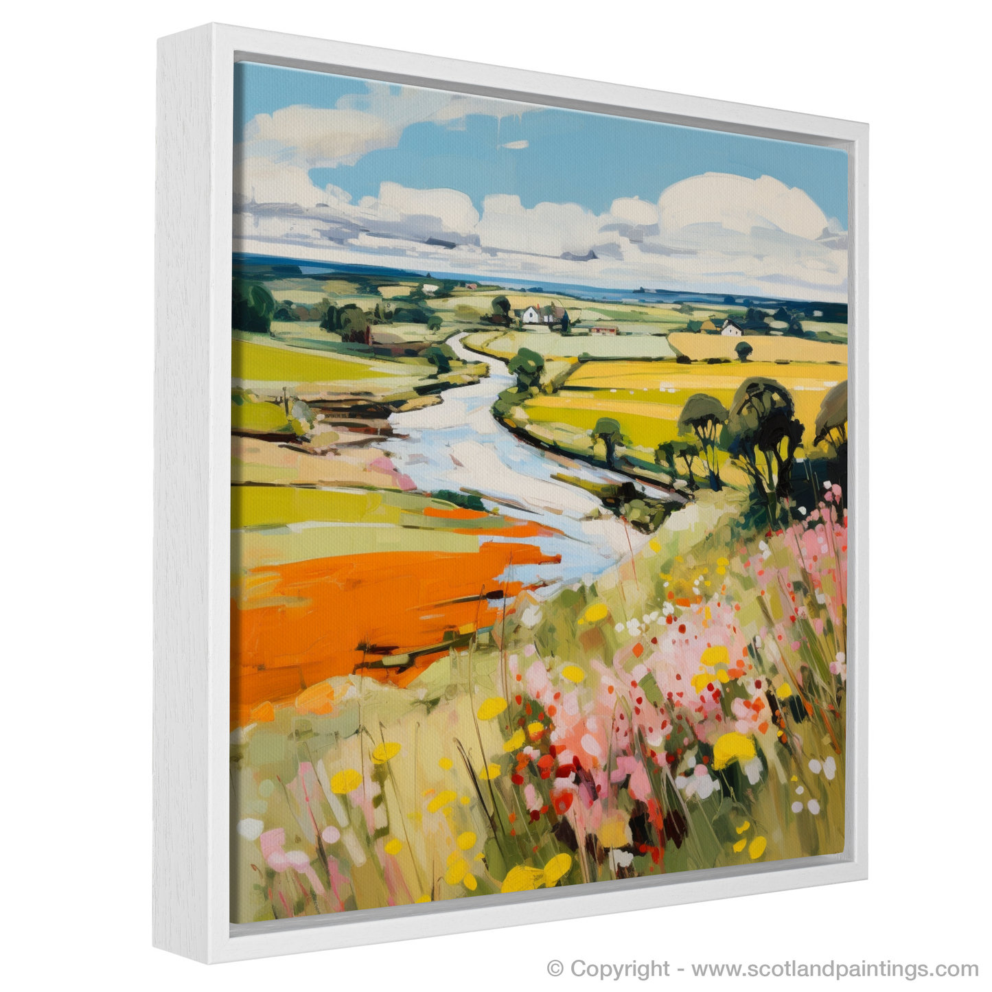 The foreground is alive with a wildflower-speckled meadow, rendered in vivid splashes of red, pink, and yellow, interspersed with dabs of white that suggest the delicate heads of daisies swaying gently in the breeze. This rich tapestry of colour sets the stage for the eye to travel across the undulating golden fields, suggestive of ripe barley under the summer sun.