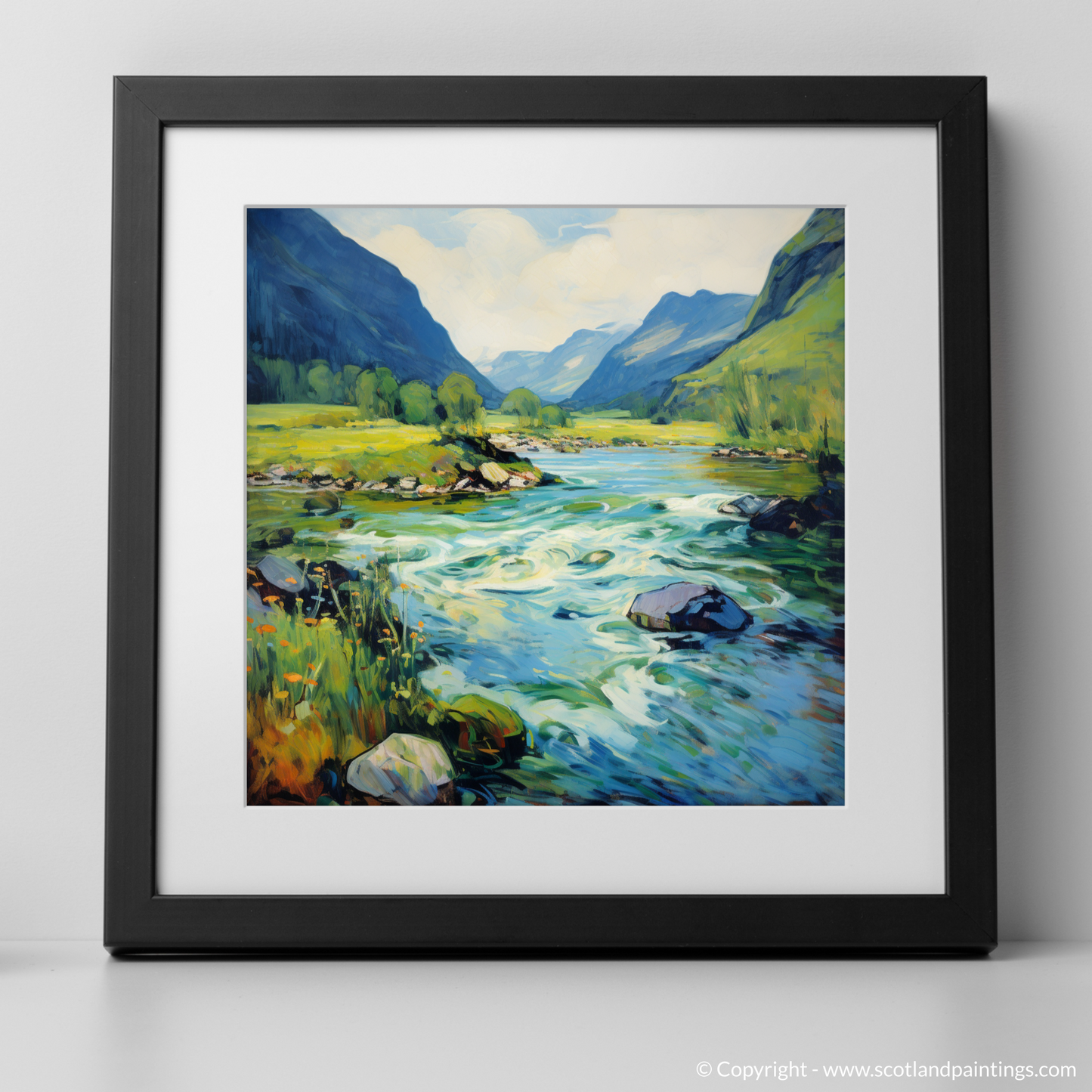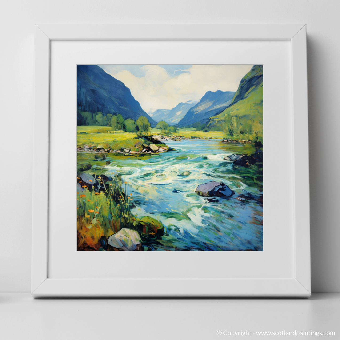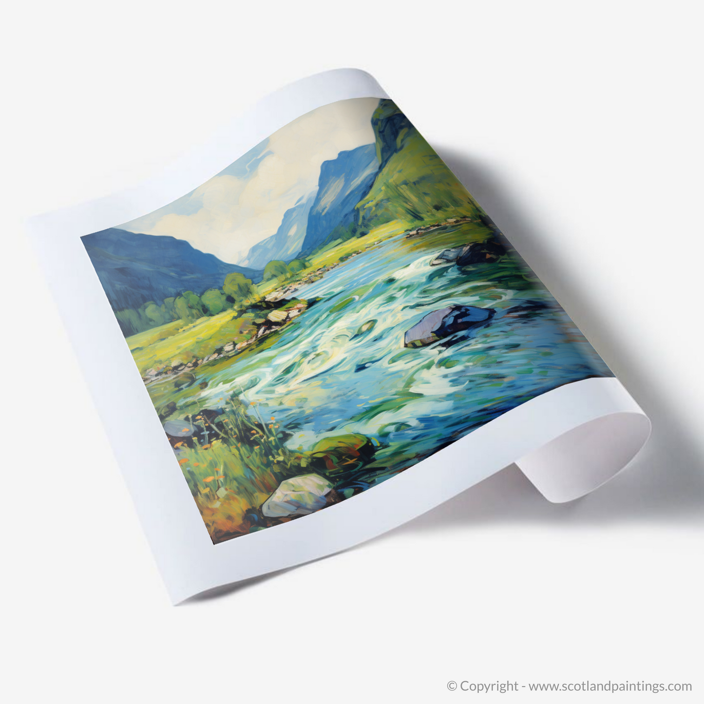 Capture the essence of a Scottish summer with this evocative print, showcasing the dynamic beauty of a River in Glencoe. The vivid rendition brings to life the swirling, cool waters of the river as it carves its way through the lush, verdant landscape. The composition encourages the eye to meander through the scene, just as the river winds its way between the embracing hills.
