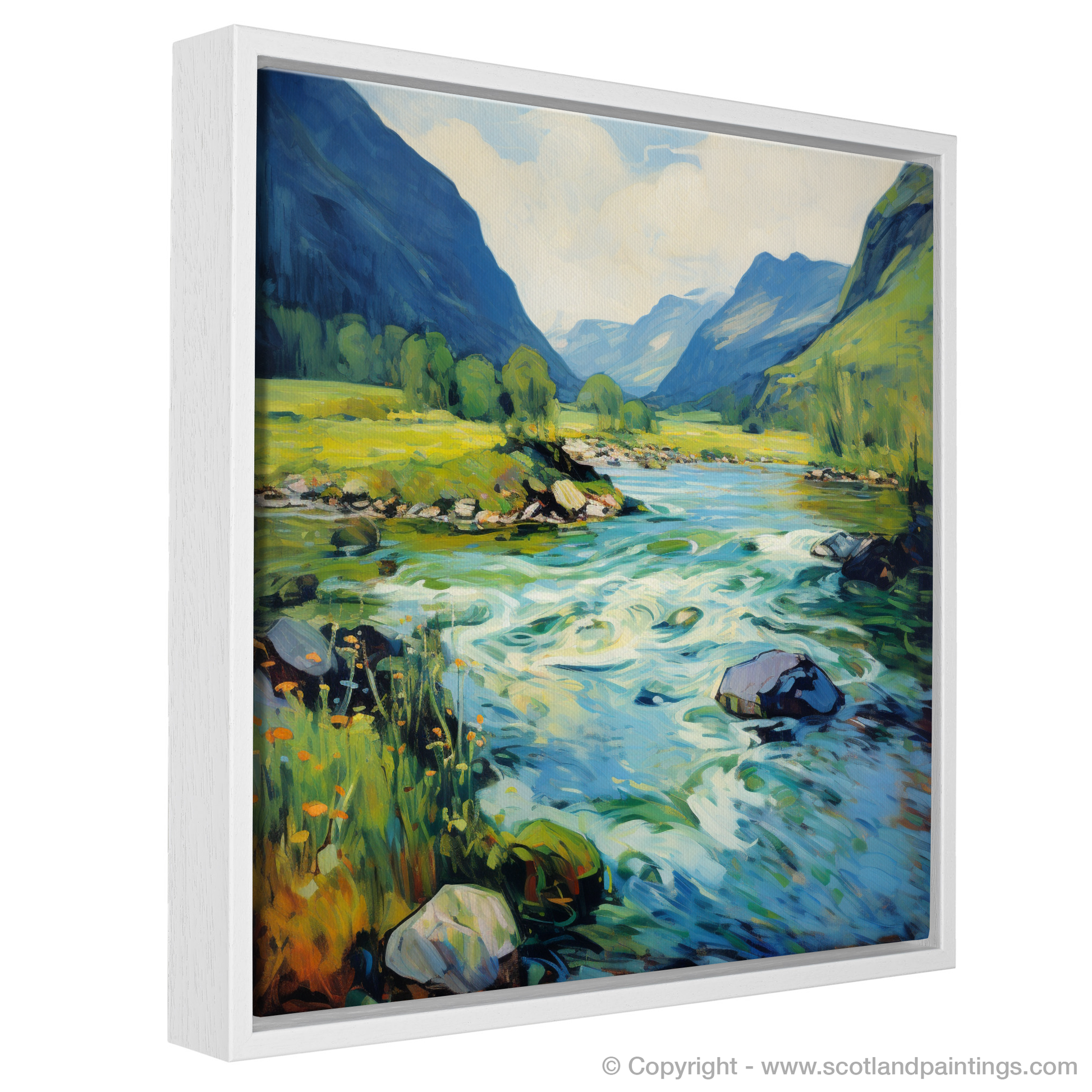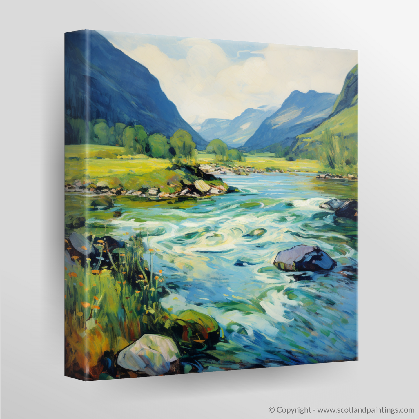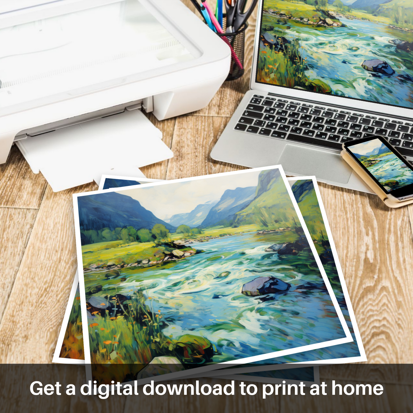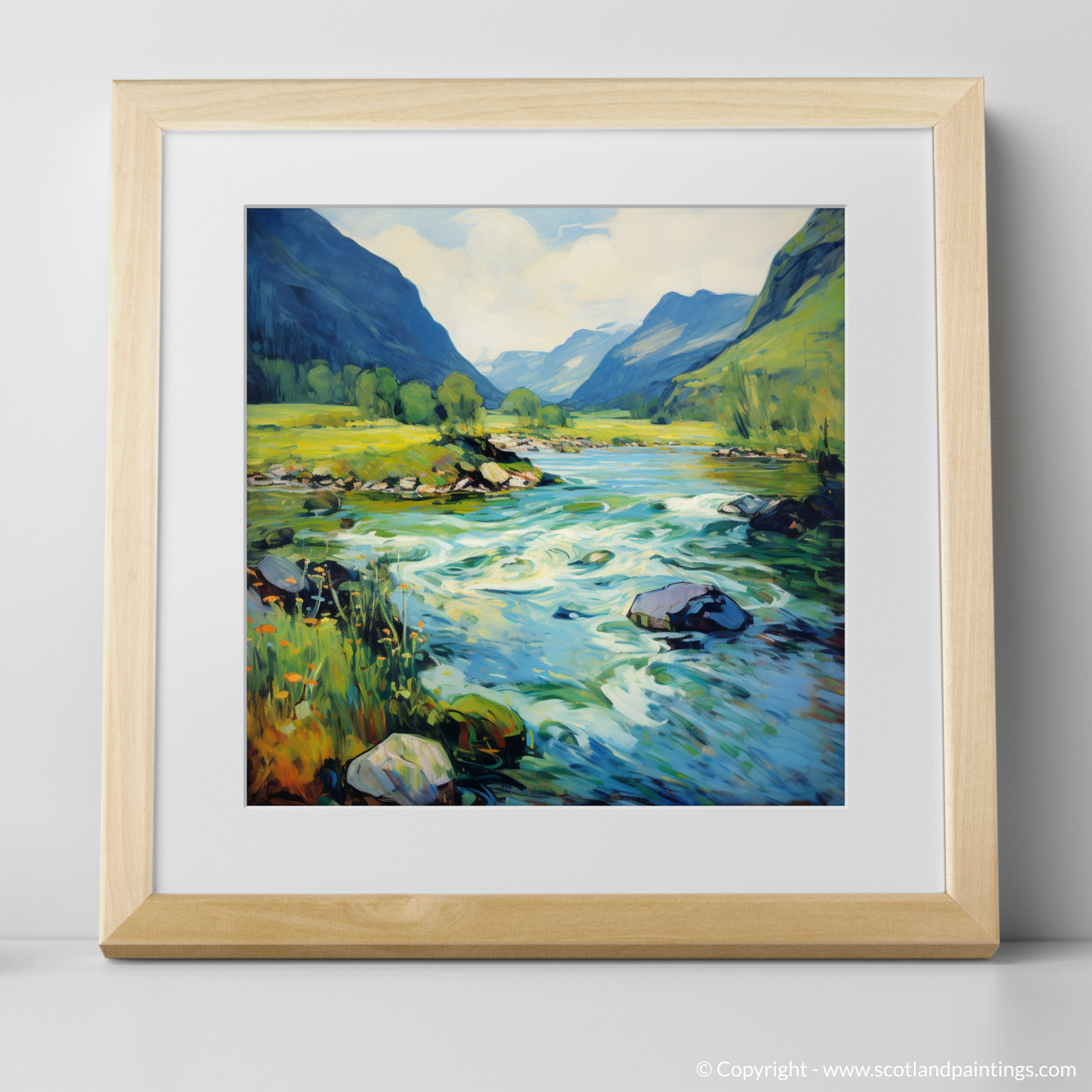 Capture the essence of a Scottish summer with this evocative print, showcasing the dynamic beauty of a River in Glencoe. The vivid rendition brings to life the swirling, cool waters of the river as it carves its way through the lush, verdant landscape. The composition encourages the eye to meander through the scene, just as the river winds its way between the embracing hills.