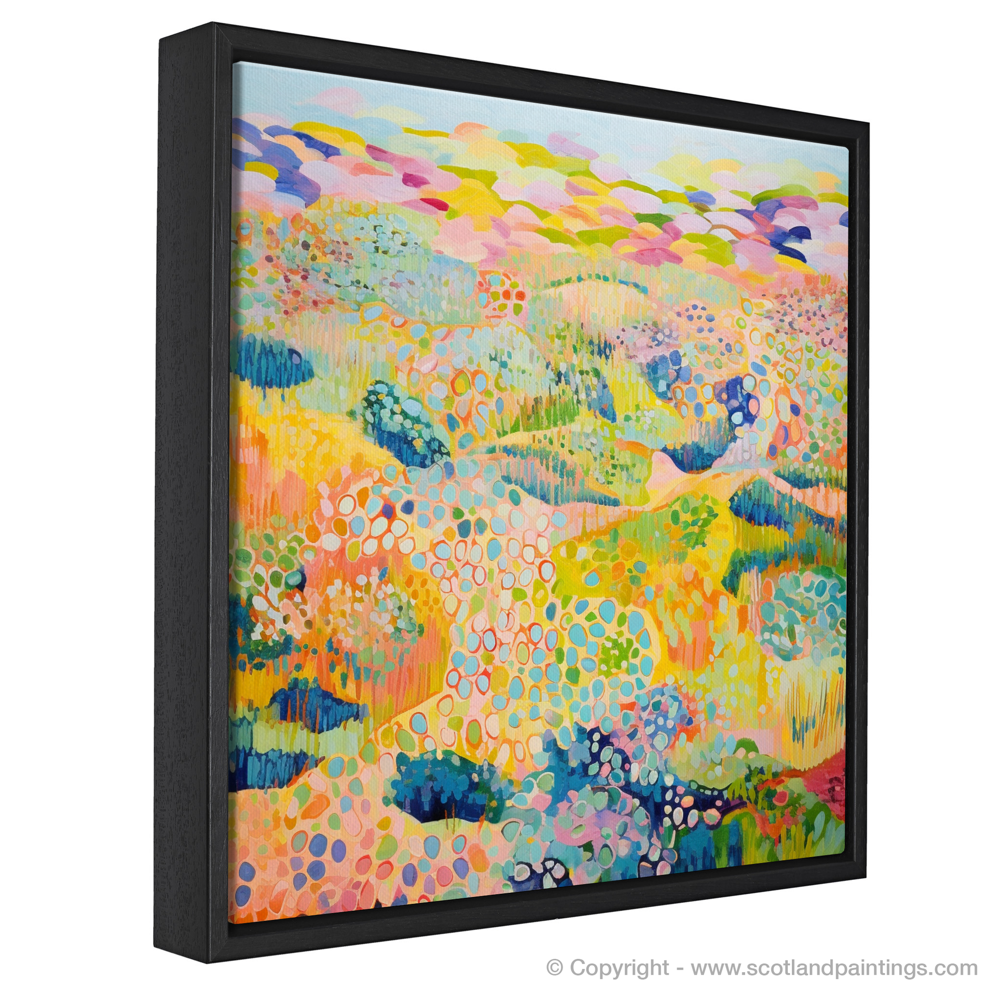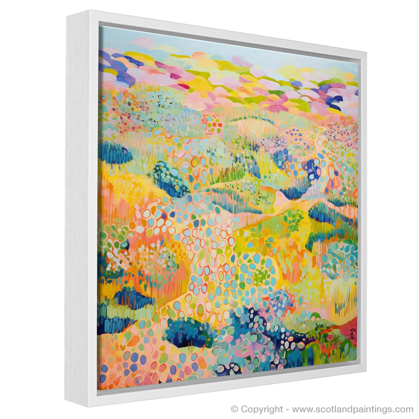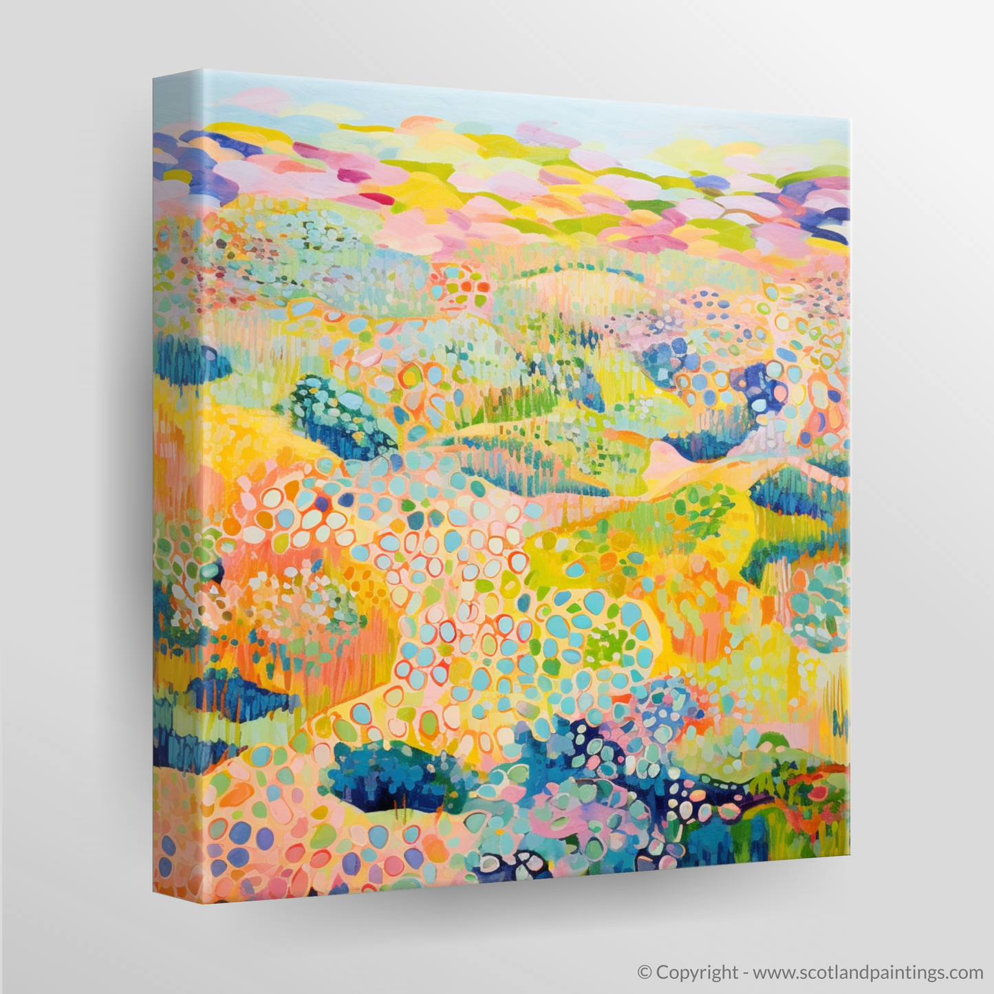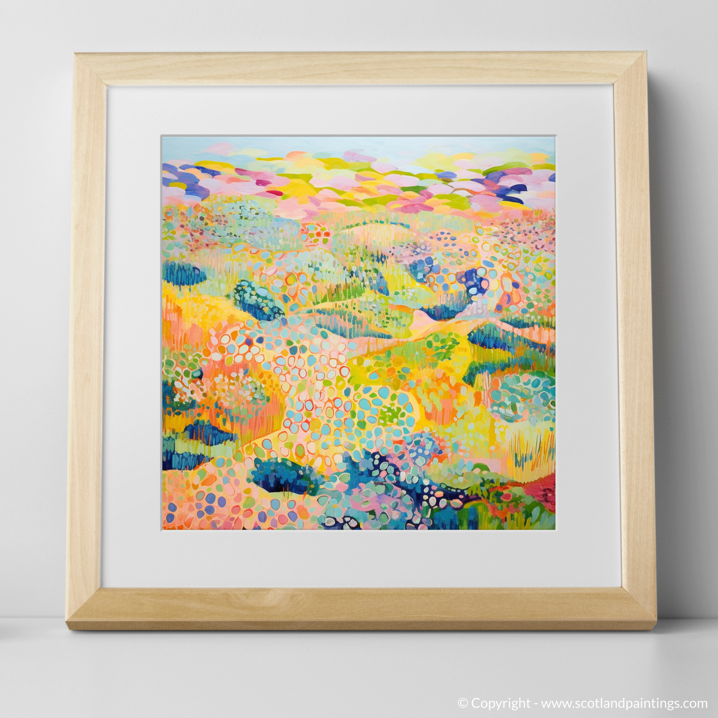 This captivating abstract print captures the essence of Glenesk, Angus, during the vibrant summer months, evoking the region's rolling hills and lush landscapes. The artwork is a symphony of warmth and colour, with a palette rich in sunny yellows, soft pinks, tranquil blues, and refreshing greens, all mingling to create a sense of nature's exuberance.