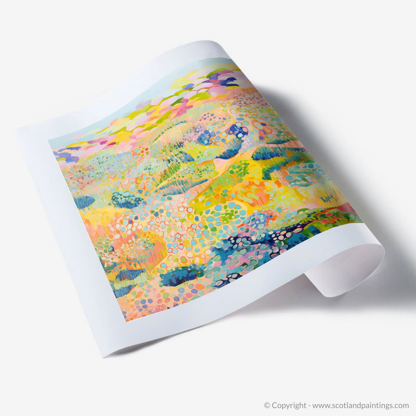This print is a celebration of the Scottish highlands' untamed beauty, distilled into a form that transcends reality, speaking to the heart of those who have experienced the region's enchantment or dream of its picturesque vistas. It serves as a bold yet harmonious statement piece that promises to enliven any space with its dynamic energy and spirited homage to Scotland's summertime allure.