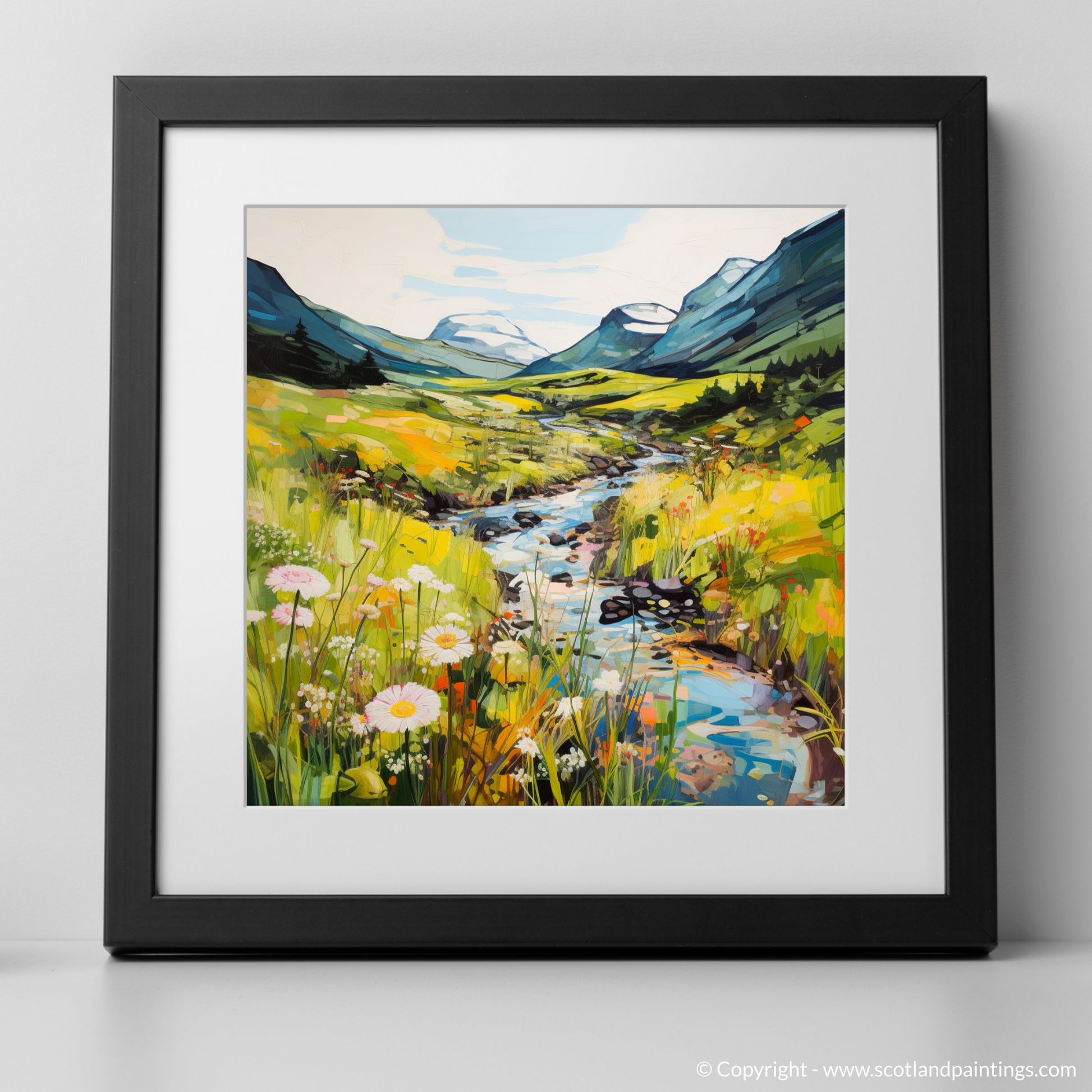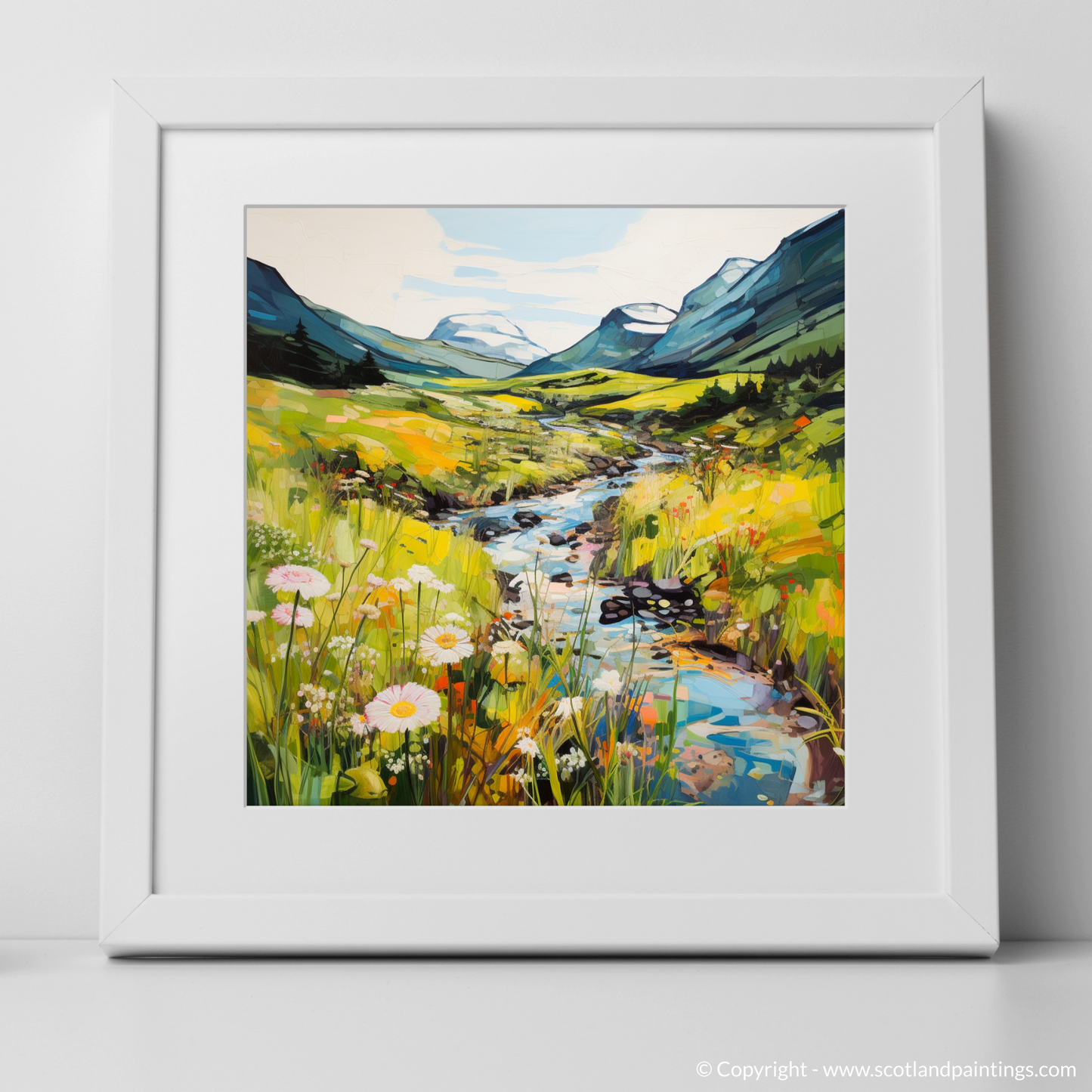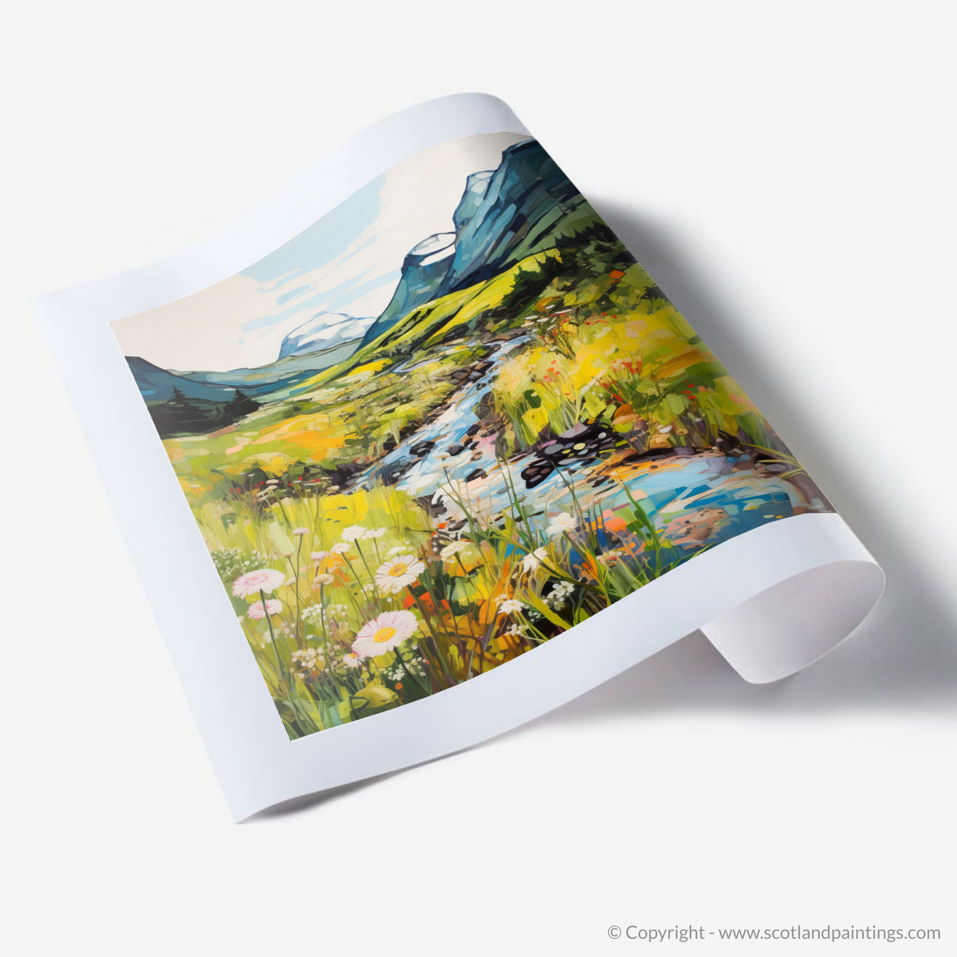 Capturing the breathtaking beauty of Glen Sannox on the Isle of Arran, this vibrant print is a celebration of nature's splendour during the Scottish summertime. The composition draws the eye along a meandering stream, fringed by a tapestry of wildflowers and grasses that sway gently in the imagined breeze. Flourishes of white, pink, and crimson blooms stand out against a palette of lush greens and golden yellows, symbolizing the wild and untamed flora that adorns the Scottish landscape.