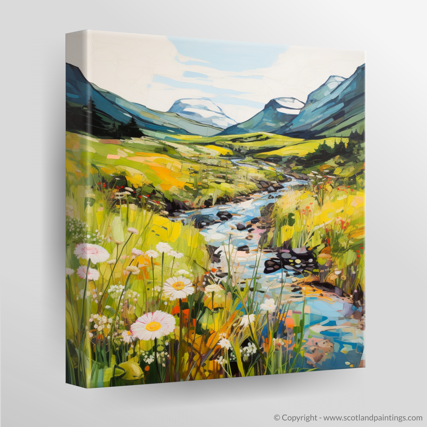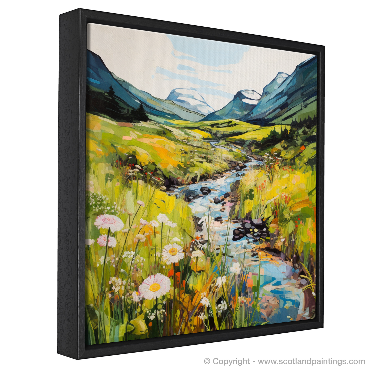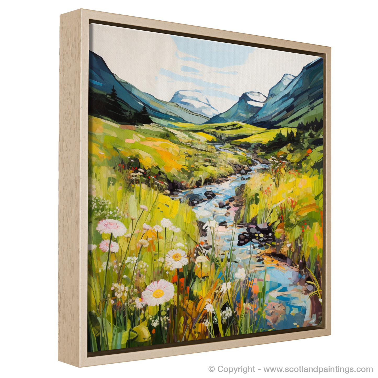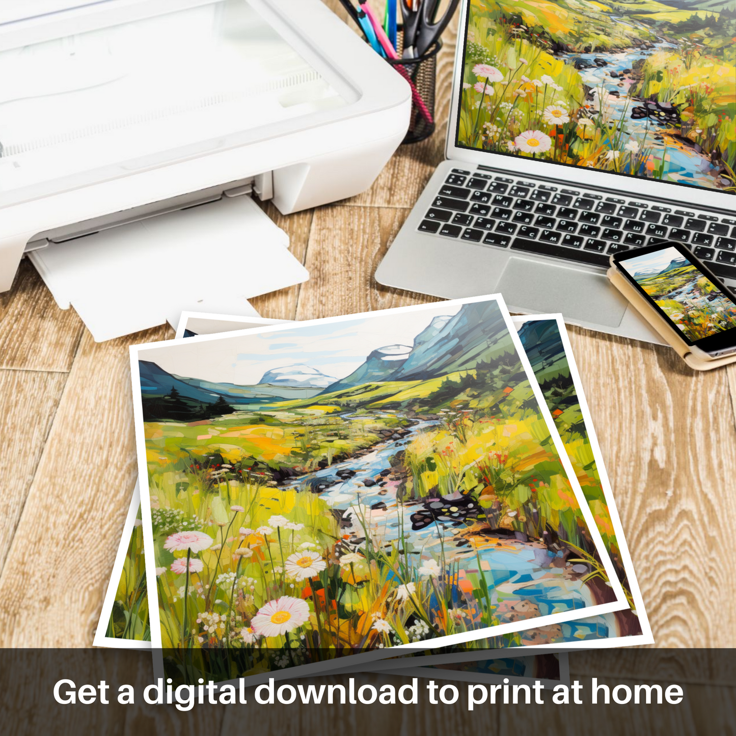Capturing the breathtaking beauty of Glen Sannox on the Isle of Arran, this vibrant print is a celebration of nature's splendour during the Scottish summertime. The composition draws the eye along a meandering stream, fringed by a tapestry of wildflowers and grasses that sway gently in the imagined breeze. Flourishes of white, pink, and crimson blooms stand out against a palette of lush greens and golden yellows, symbolizing the wild and untamed flora that adorns the Scottish landscape.