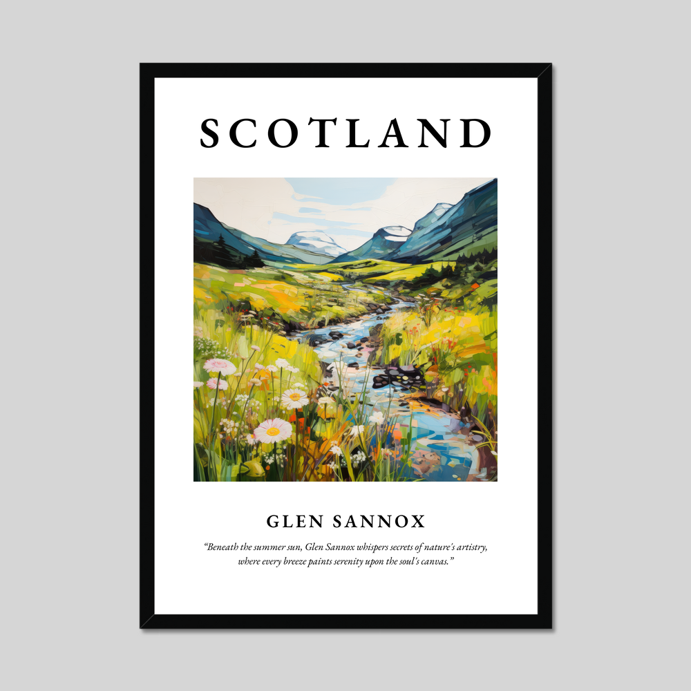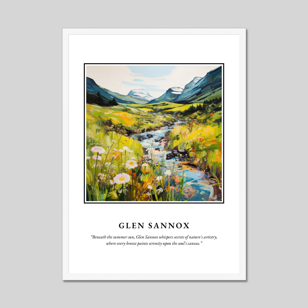 Glen Sannox, nestled on the Isle of Arran, is a haven for those seeking solace in nature. It is famed for its rugged beauty and dramatic landscapes, with its sweeping valleys and craggy peaks inspiring awe and wonder. In summer, the glen transforms into a tapestry of vibrant greens and colourful wildflowers, much like the painting depicted in our poster. Walking through Glen Sannox, one can hear the whisper of the wind, the gurgle of streams, and the occasional call of wildlife, all contributing to its enchanting allure.