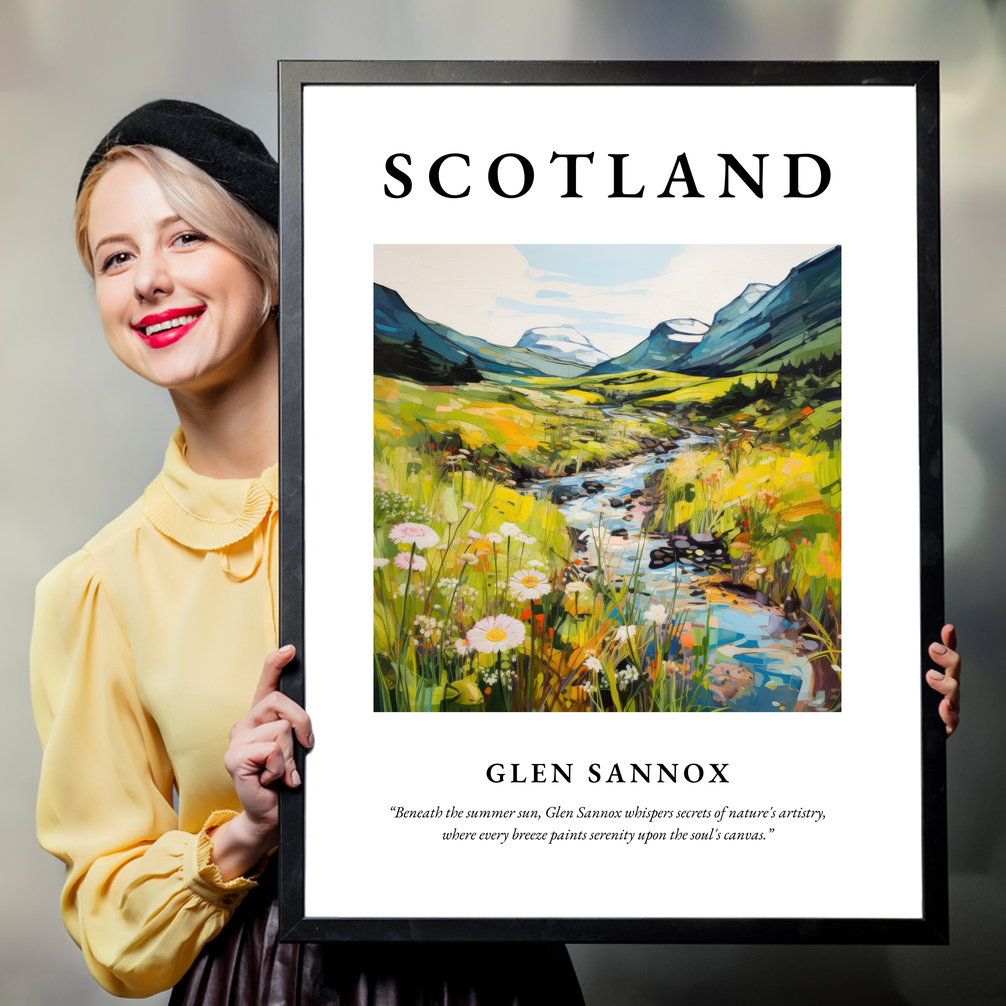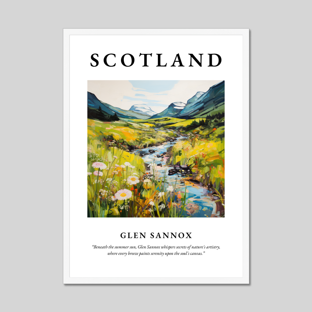 At the top, bold lettering announces “SCOTLAND,” guiding the eye to a contemporary painting that captures Glen Sannox in all its glory. The contemporary style breathes life into the canvas, where vibrant hues of green and splashes of wildflowers dance under the sun. Meandering through this serene landscape, a gentle stream reflects the tranquillity synonymous with this cherished Scottish valley.