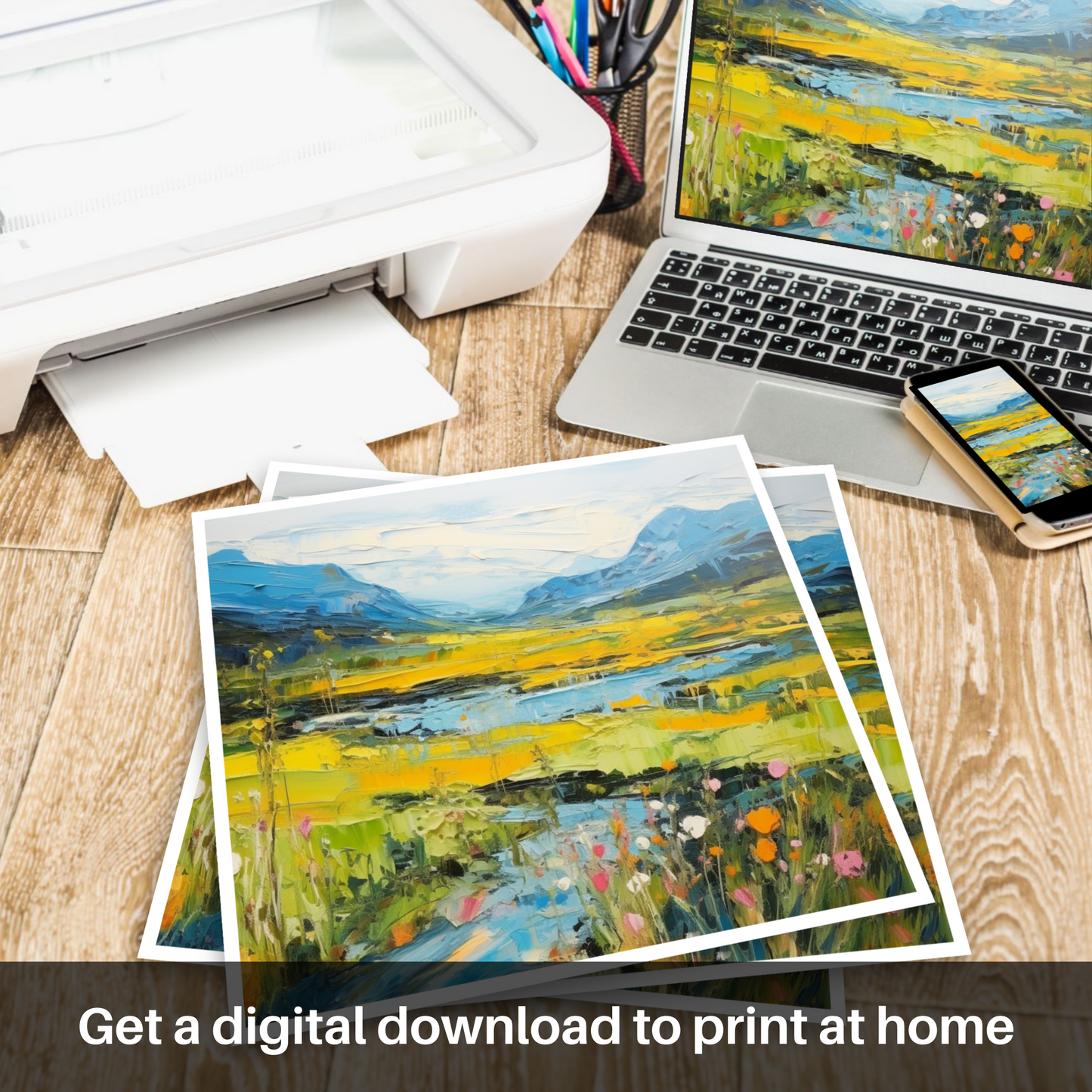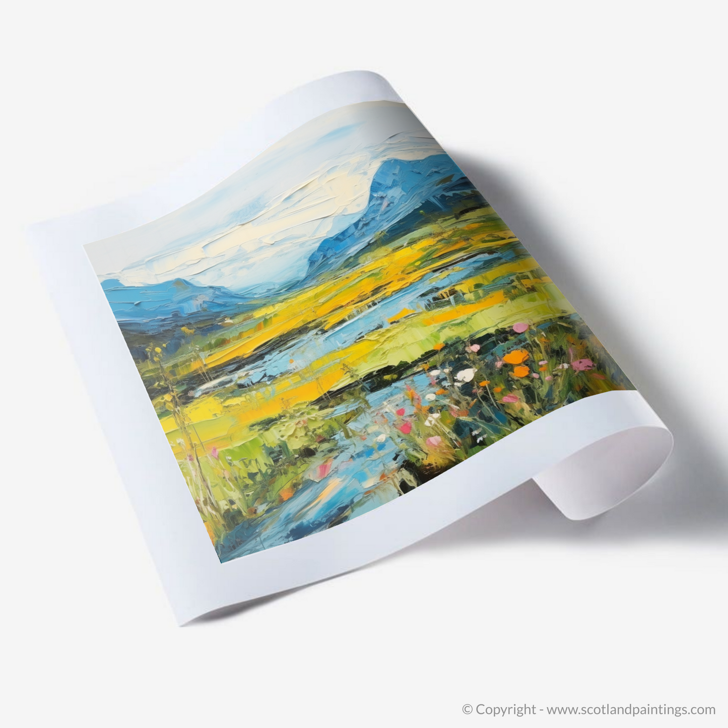 The expressive strokes and impasto technique give a tactile dimension to the print, inviting the eye to linger and explore each layered element. This piece is an ode to Scotland's natural beauty, capturing the essence of its wild, untamed spirit whilst simultaneously employing a contemporary approach that resonates with modern artistic sensibilities.
