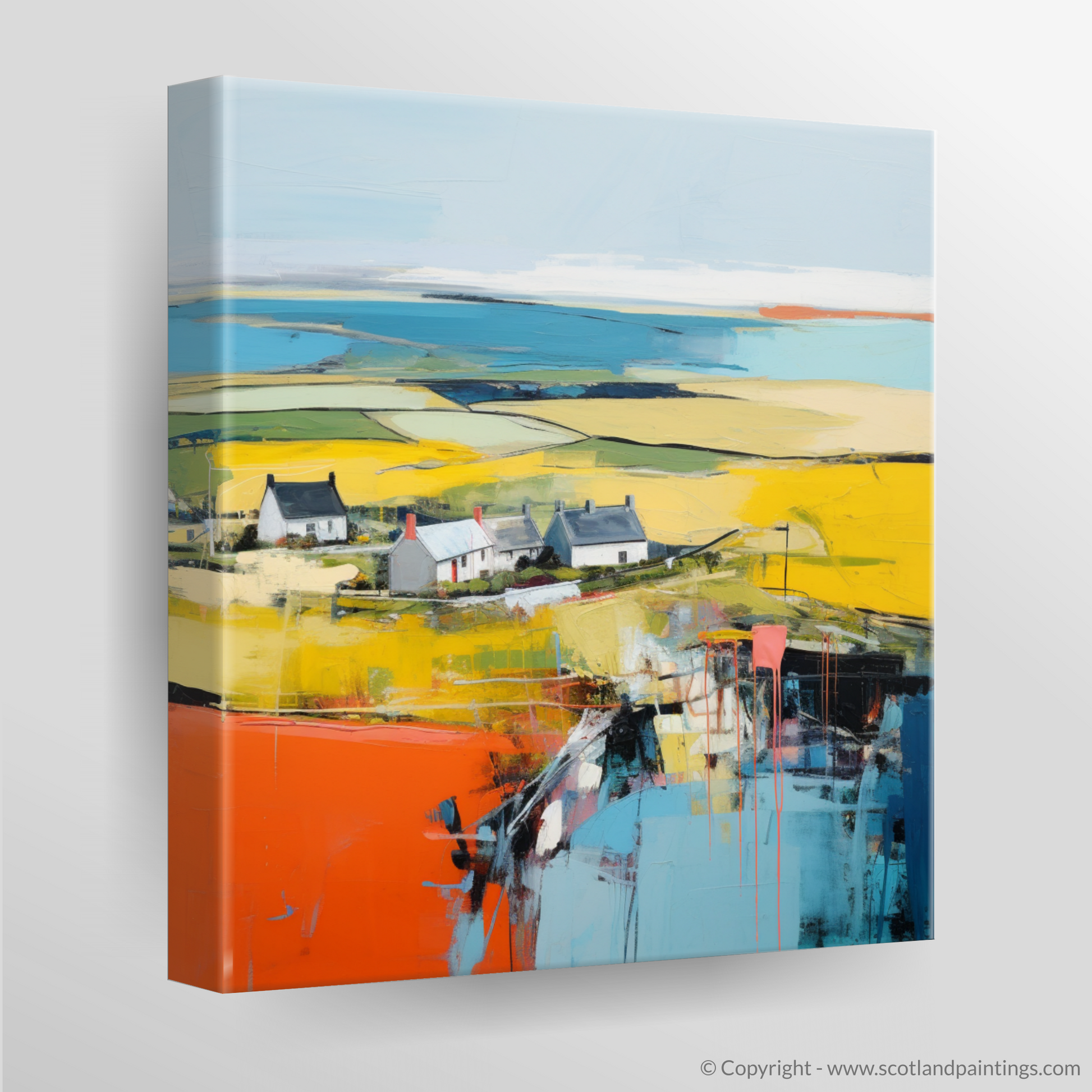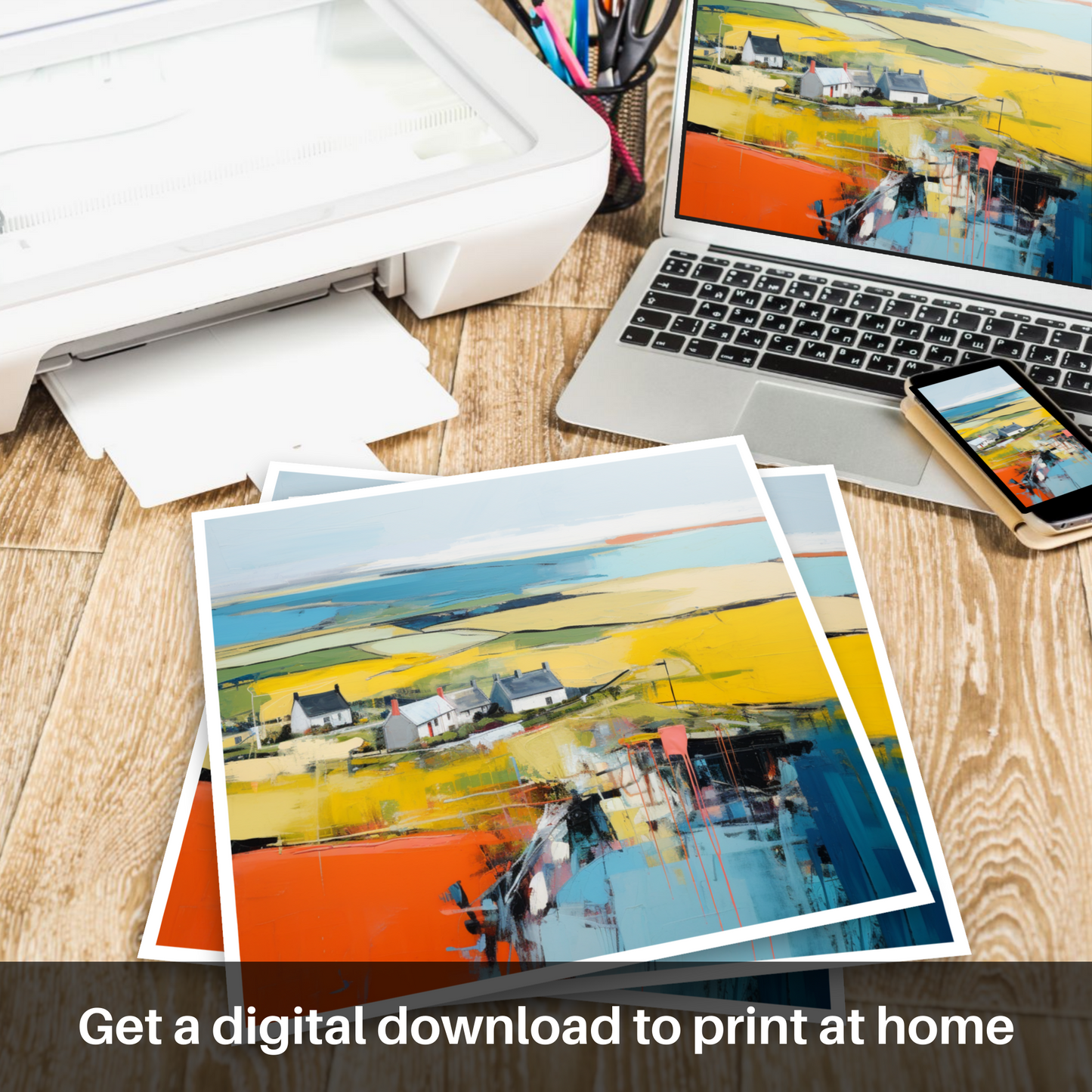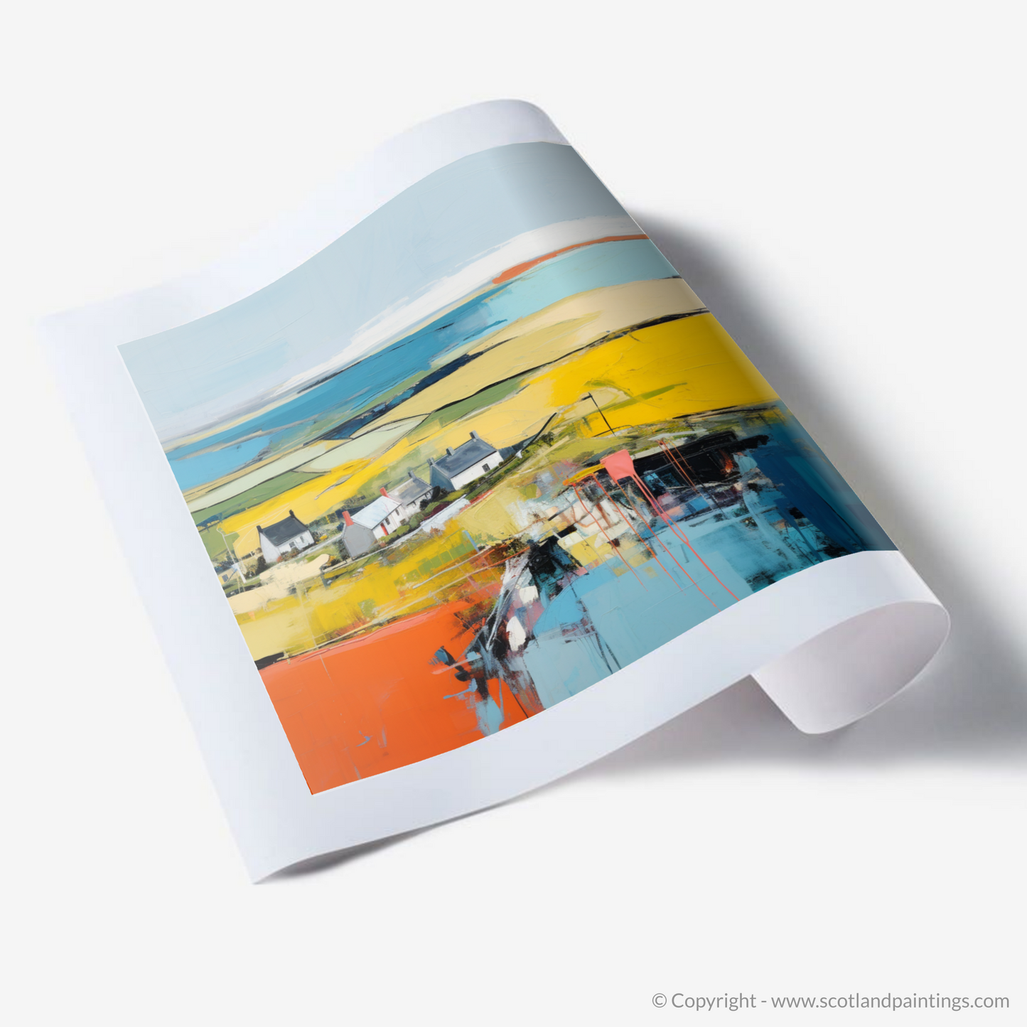 Capture the essence of Orkney's serene beauty with this vibrant modern print that brings the summer allure of the Scottish isles right into your living space. The artwork presents a dynamic composition that marries abstract and figurative elements, epitomising the unique charm of Orkney landscapes under the caress of summer light.