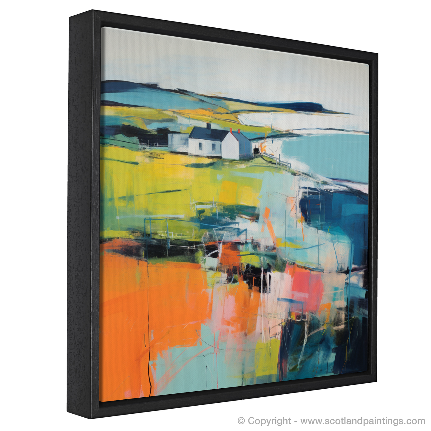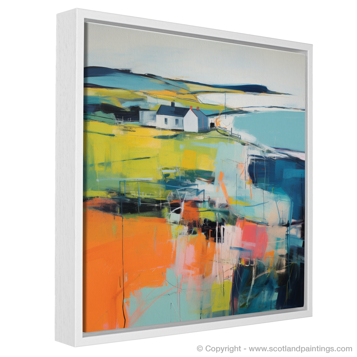 The artwork energizes with its bold, abstracted landscape, where patches of bright yellows and greens suggest the flourishing flora that carpets the countryside in the warmer months. Interspersed with the raw beauty of Orkney, a solitary white cottage with a striking red roof stands as a serene focal point amidst the colour-rich scene, hinting at the human presence in this natural tableau.