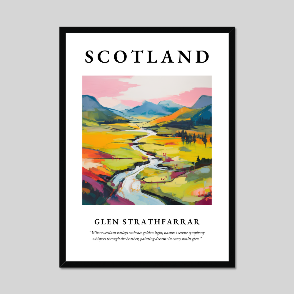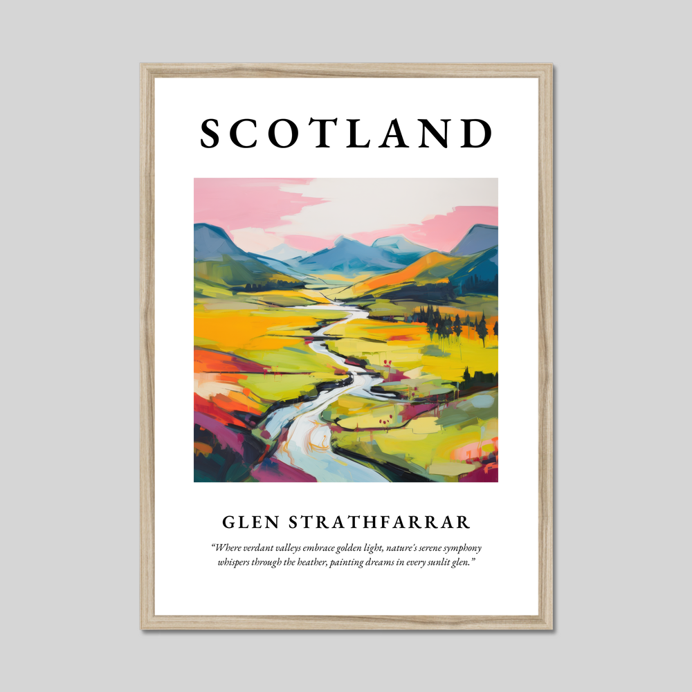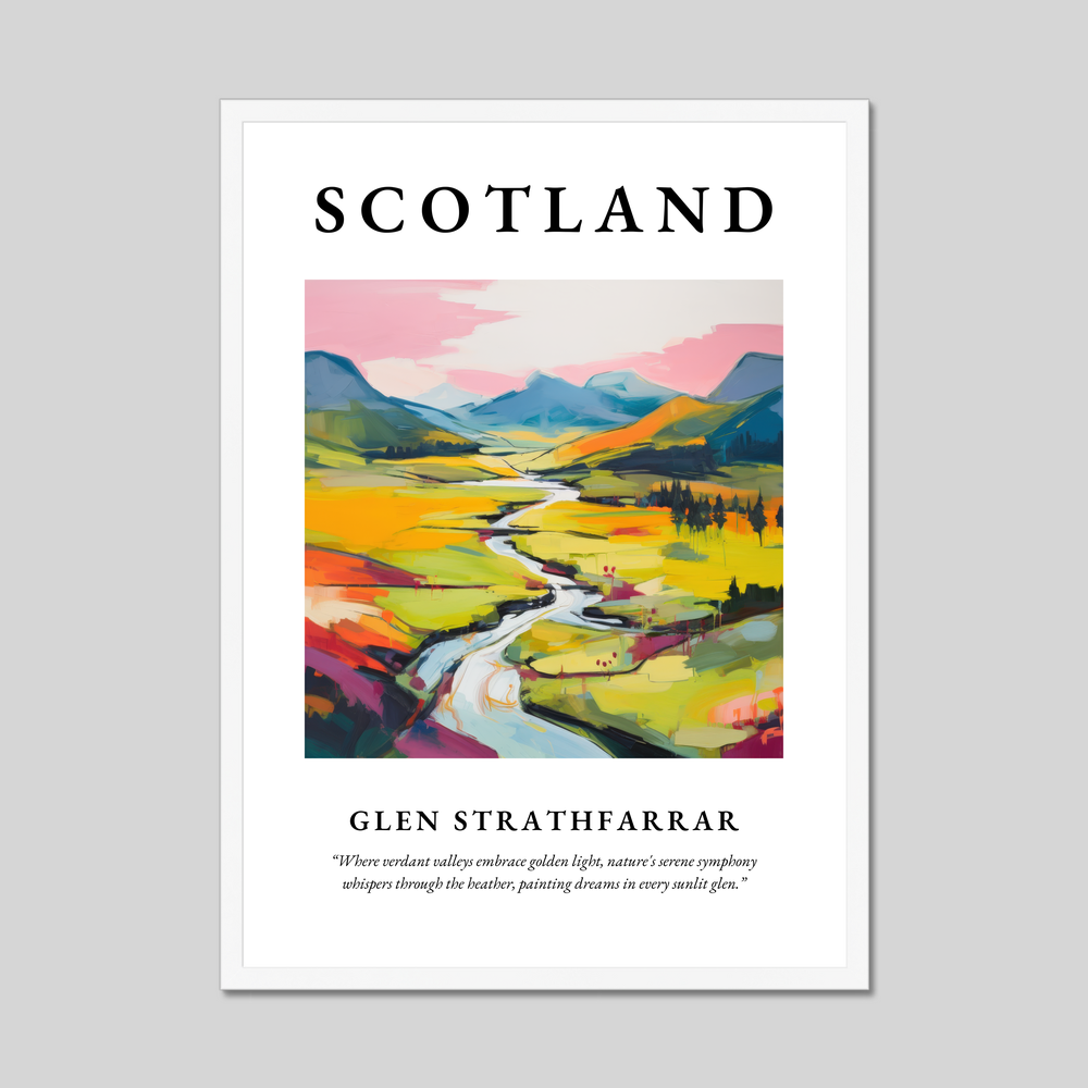 Transform your living space with this striking 50cm x 70cm framed poster print from our “Scotland in Summer” collection. Available in chic black, pristine white, or a natural wood-effect frame, this piece encapsulates the splendour of Scottish landscapes while introducing a vibrant artistic flair to any room. Featuring the majestic Glen Strathfarrar in a mesmerising abstract style, the poster highlights the word “SCOTLAND” boldly at the top, underlining your connection to this beautiful country. Beneath the artwork, the words “Where verdant valleys embrace golden light, nature's serene symphony whispers through the heather, painting dreams in every sunlit glen” add an emotional depth that resonates with admirers of both art and nature.